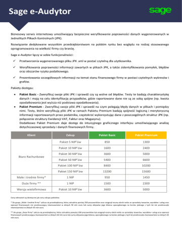 Sage e-Audytor Biznesowy serwis internetowy umożliwiający bezpieczne weryfikowanie poprawności danych wygenerowanych w Jednolitych Plikach Kontrolnych (JPK). Rozwiązanie dedykowane wszystkim przedsiębiorstwom na polskim rynku bez względu na rodzaj stosowanego oprogramowania na wielkość firmy czy branżę. Sage e-Audytor łączy w sobie funkcjonalności: Przetworzenia wygenerowanego pliku JPK .xml w postać czytelną dla użytkownika. Weryfikowania poprawności informacji zawartych w plikach JPK, a także zidentyfikowania pomyłek, błędów oraz obszarów ryzyka podatkowego. Prezentowania szczegółowych informacji na temat stanu finansowego firmy w postaci czytelnych wykresów i grafów. Pakiety dostępu: Pakiet Basic - Zweryfikuj swoje pliki JPK i sprawdź czy są wolne od błędów. Testy te badają charakterystykę danych i mają na celu identyfikację przypadków, gdzie raportowane dane nie są ze sobą spójne (np. kwota opodatkowania jest wyższa niż podstawa opodatkowania). Pakiet Premium - Zweryfikuj swoje pliki JPK i sprawdź na czym polegają błędy danych w plikach i pomiędzy nimi. Testy, które weryfikują pliki JPK w ramach Pakietu Premium badają spójność logiczną i merytoryczną informacji raportowanych przez podatnika, częstokroć wykorzystując dane z poszczególnych struktur JPK (np. połączenie struktury Ewidencji VAT, Faktur oraz Magazynu). Dodatkowo Pakiet Premium daje dostęp do intuicyjnego graficznego interfejsu umożliwiającego analizę dotychczasowej sprzedaży i danych finansowych firmy. Klient Zakup Pakiet Basic Pakiet Premium Pakiet 5 NIP’ów 850 1300 Pakiet 10 NIP’ów 1600 2400 Pakiet 30 NIP’ów 3600 5000 Pakiet 50 NIP’ów 5400 6600 Pakiet 100 NIP’ów 8400 10200 Pakiet 150 NIP’ów 13200 15600 Małe i średnie firmy* 1 NIP 950 1450 Duże firmy ** 1 NIP 1500 2300 Wersja wielofirmowa Pakiet 10 NIP’ów 3600 5000 Biuro Rachunkowe Ceny odnowień są identyczne jak ceny zakupu pakietów. * Do grupy „Małe i średnie firmy” zalicza się przedsiębiorcę, który zatrudnia poniżej 250 pracowników oraz osiągnął roczny obrót netto ze sprzedaży towarów, wyrobów i usług oraz operacji finansowych nie przekraczający równowartości w złotych 50 mln euro lub sumy aktywów jego bilansu sporządzonego na koniec jednego z tych lat nie przekroczyły równowartości w złotych 43 mln euro. ** Do grupy „Duże firmy” zalicza się przedsiębiorcę, który zatrudnia powyżej 250 pracowników lub osiągnął roczny obrót netto ze sprzedaży towarów, wyrobów i usług oraz operacji finansowych przekraczający równowartość w złotych 50 mln euro lub sumy aktywów jego bilansu sporządzonego na koniec jednego z tych lat przekroczyły równowartości w złotych 43 mln euro.