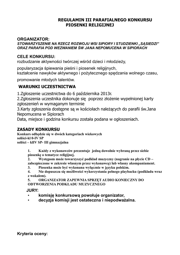 REGULAMIN III PARAFIALNEGO KONKURSU PIOSENKI RELIGIJNEJ ORGANIZATOR: STOWARZYSZENIE NA RZECZ ROZWOJU WSI SIPIORY I STUDZIENKI „SĄSIEDZI” ORAZ PARAFIA POD WEZWANIEM ŚW JANA NEPOMUCENA W SIPIORACH CELE KONKURSU: rozbudzanie aktywności twórczej wśród dzieci i młodzieży, popularyzacja śpiewania pieśni i piosenek religijnych, kształcenie nawyków aktywnego i pożytecznego spędzania wolnego czasu, promowanie młodych talentów. WARUNKI UCZESTNICTWA 1.Zgłoszenie uczestnictwa do 6 października 2013r. 2.Zgłoszenia uczestnika dokonuje się poprzez złożenie wypełnionej karty zgłoszenień w wymaganym terminie 3.Karty zgłoszenia dostępne są w kościołach należących do parafii św.Jana Nepomucena w Sipiorach Data, miejsce i godzina konkursu została podana w ogłoszeniach. ZASADY KONKURSU Konkurs odbędzie się w dwóch kategoriach wiekowych soliści-kl 0-IV SP soliści – klIV SP- III gimnazjalna 1. Każdy z wykonawców prezentuje jedną dowolnie wybraną przez siebie piosenkę o tematyce religijnej. 2. Występom może towarzyszyć podkład muzyczny (nagranie na płycie CD – zabezpieczone w zakresie własnym przez wykonawcę) lub własny akompaniament. 3. Piosenka może być wykonana wyłącznie w języku polskim. 4. Nie dopuszcza się możliwości wykorzystania pełnego playbacku (podkładu wraz z wokalem). 5. ORGANIZATOR ZAPEWNIA SPRZĘT AUDIO KONIECZNY DO ODTWORZENIA PODKŁADU MUZYCZNEGO JURY: • komisję konkursową powołuje organizator, • decyzja komisji jest ostateczna i niepodważalna. Kryteria oceny: W ocenie brane będą pod uwagę następujące kryteria: • zastosowanie się do zapisów niniejszego regulaminu, • dobór repertuaru do możliwości wiekowych i wokalnych wykonawcy, • ogólny wyraz artystyczny, • stopień trudności prezentowanego utworu, • umiejętność wykorzystania naturalnych predyspozycji wykonawcy, • emisja głosu, • dykcja. Nagrody: Wszyscy uczniowie biorący udział w konkursie otrzymają dyplomy uczestnictwa, a dla najlepszych przewidziane są nagrody rzeczowe. WSZYSCY UCZESTNICY BIORĄCY UDZIAŁ W III PARAFIALNYM KONKURSIE PIOSENKI RELIGIJNEJ SĄ ZOBOWIĄZANI DO ZAPOZNANIA SIĘ Z INFORMACJAMI ZAWARTYMI W REGULAMINIE ZAWODNICY PRZYSTĘPUJĄC DO KONKURSU WYRAŻAJĄ AUTOMATYCZNIE ZGODĘ NA PODANIE DO PUBLICZNEJ WIADOMOŚCI SWOJEGO IMIENIA I NAZWISKA, JEŚLI ZNAJDĄ SIĘ ONI W GRONIE LAUREATÓW. WSZELKIE KWESTIE SPORNE ROZSTRZYGA WYŁĄCZNIE ORGANIZATOR. ORGANIZATOR ZASTRZEGA SOBIE PRAWO DO ZMIANY REGULAMINU I OSTATECZNEJ JEGO INTERPRETACJI. UCZESTNICY DOJEŻDŻAJĄ NA KOSZT WŁASNY LUB INSTYTUCJI DELEGUJĄCEJ.