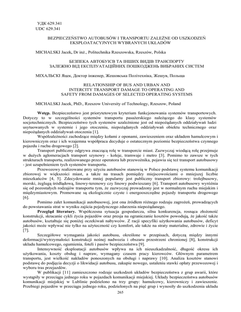 УДК 629.341 UDC 629.341 BEZPIECZEŃSTWO AUTOBUSÓW I TRANSPORTU ZALEŻNE OD USZKODZEŃ EKSPLOATACYJNYCH WYBRANYCH UKŁADÓW MICHALSKI Jacek, Dr inż., Politechnika Rzeszowska, Rzeszów, Polska БЕЗПЕКА АВТОБУІСВ ТА ІНШИХ ВИДІВ ТРАНСПОРТУ ЗАЛЕЖНО ВІД ЕКСПЛУАТАЦІЙНИХ ПОШКОДЖЕНЬ ВИБРАНИХ СИСТЕМ МІХАЛЬСКІ Яцек, Доктор інженер, Жешовська Політехніка, Жешув, Польща RELATIONSHIP OF BUS AND URBAN AND INTERCITY TRANSPORT DAMAGE TO OPERATING AND SAFETY FROM DAMAGES OF SELECTED OPERATING SYSTEMS MICHALSKI Jacek, PhD., Rzeszow University of Technology, Rzeszow, Poland Wstęp. Bezpieczeństwo jest priorytetowym kryterium funkcjonowania systemów transportowych. Dotyczy to w szczególności systemów transportu pasażerskiego należącego do klasy systemów socjotechnicznych. Bezpieczeństwo tych systemów uzależnione jest od niepożądanych oddziaływań ludzi usytuowanych w systemie i jego otoczeniu, niepożądanych oddziaływań obiektu technicznego oraz niepożądanych oddziaływań otoczenia [1]. Współzależności zachodzące między kołami z oponami, zawieszeniem oraz układem hamulcowym i kierowniczym oraz i ich wzajemna współpraca decyduje o ostatecznym poziomie bezpieczeństwa czynnego pojazdu i ruchu drogowego [2]. Transport publiczny odgrywa znaczącą rolę w transporcie miast. Zazwyczaj wiodącą rolę przejmuje w dużych aglomeracjach transport szynowy - koleje, tramwaje i metro [3]. Pomimo to zawsze w tych strukturach transportu, realizowanego przez operatora lub przewoźnika, pojawia się też transport autobusowy - jest uzupełnieniem tych systemów transportu. Przewozowy realizowane przy użyciu autobusów stanowią w Polsce podstawę systemu komunikacji zbiorowej w większości miast, a także na trasach pomiędzy miejscowościami o mniejszej liczbie mieszkańców [4, 5]. Zdecydowanie mniej popularny jest publiczny transport zbiorowy: trolejbusowy, morski, żeglugą śródlądową, linowy-terenowy czy linowy podwieszany [6]. Transport autobusowy wyróżnia się od pozostałych rodzajów transportu tym, że zazwyczaj prowadzony jest w normalnym ruchu miejskim i międzymiastowym. Promowane są ekologicznie czyste i energooszczędne pojazdy transportu drogowego [6]. Pomimo zalet komunikacji autobusowej, jest ona źródłem różnego rodzaju zagrożeń, prowadzących do powstawania strat w wyniku zajścia pojedynczego zdarzenia niepożądanego. Przegląd literatury. Współczesna sytuacja gospodarcza, silna konkurencja, rosnąca złożoność konstrukcji, skracanie cykli życia pojazdów oraz presja na ograniczanie kosztów powodują, że jakość także autobusów, kształtuje się poniżej oczekiwań nabywców. Z racji specyfiki użytkowania autobusów, deficyt jakości może wpływać nie tylko na użyteczność czy komfort, ale także na straty materialne, zdrowie i życie [7]. Szczegółowe wymagania jakości autobusu, określone w przepisach, dotyczą między innymi deformacji/wytrzymałości konstrukcji nośnej nadwozia i obszaru przestrzeni chronionej [8], konstrukcji układu hamulcowego, ogumienia, foteli i pasów bezpieczeństwa [9]. Intensywność eksploatacji autobusów wpływa na ich nieuszkadzalność, długość okresu ich użytkowania, koszty obsług i napraw, wymagany czasem pracy kierowców. Głównym parametrem transportu, jest wielkość nakładów ponoszonych na obsługi i naprawy [10]. Analiza kosztów stanowi podstawę do podjęcia decyzji o likwidacji autobusu, zakupie nowego, ustaleniu stawki opłaty przewozowej i wyboru tras przejazdów. W publikacji [11] zamieszczono rodzaje uszkodzeń układów bezpieczeństwa z grup awarii, które wystąpiły w przeciągu jednego roku w pojazdach komunikacji miejskiej. Układy bezpieczeństwa autobusów komunikacji miejskiej w Lublinie podzielono na trzy grupy: hamulcowy, kierowniczy i zawieszenie. Przebiegi pojazdów w przeciągu jednego roku, podzielonych na pięć grup i wynosiły do uszkodzenia układu 265 bezpieczeństwa od 14937,26 km do 24708,81 km. Ze względu na niespełnienie założeń klasycznej analizy wariancji (normalności) rozkładów zastosowano nieparametryczną analizę wariancji - test Kruskala-Wallisa. Stwierdzono, iż dla poziomu istotności testu (p=0,05) nie można stwierdzić statystycznie, różnic między wartością średnią przebiegu kilometrowego pojazdów wykonaną pomiędzy kolejnymi naprawami dla analizowanych układów bezpieczeństwa. Z kolei Rymarz i Niewczas [12] wykazali, iż w komunikacji miejskiej MPK Lublin, autobusy Solaris Urbino 12 i Mercedes-Benz 628 Conecto LF maja nieznaczne różnice niezawodności silnika, układu pneumatycznego i układu elektrycznego. Stwierdzono, że w obu typach autobusów intensywność uszkodzeń wzrasta wraz z przebiegiem pojazdu, przy czym wyższe wartości występują dla autobusu Solaris Urbino 12. Gęstość prawdopodobieństwa uszkodzeń w okresie eksploatacji (0-100 tys. km) jest wyższa dla autobusów marki Mercedes, a w okresie (100-210 tys. km) dla autobusów marki Solaris. Częstą przyczyną uszkodzeń autobusów typu Volkswagen LT-46 i typu Jelcz M081MB (mikrobusy) jest nadmierne zużycie elementów, uszkodzenia instalacji elektrycznej oraz uszkodzenia połączeń ruchowych [13]. W autobusach Jelcz M081MB uszkodzenie te występują częściej, ponadto równie często w autobusach tych występują wycieki płynów eksploatacyjnych, zatarcie lub zablokowanie połączeń ruchowych. Bezpieczeństwa działania systemu transportowego autobusowego miejskiego MZK Bydgoszcz (Miejskie Zakłady Komunikacyjne w Bydgoszczy), na podstawie analizy uszkodzeń autobusów przedstawił Bojar i Woropay [14, 15, 16]. Jako zdarzenie niepożądane przyjęto zdarzenie w wyniku zajścia, którego powstają straty materialne, bądź dochodzi do utraty zdrowia lub życia ludzi usytuowanych w systemie lub w jego otocz