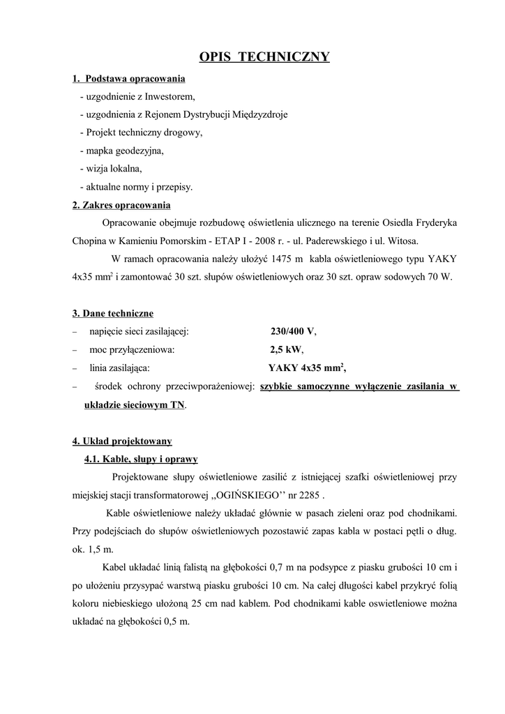 OPIS TECHNICZNY 1. Podstawa opracowania - uzgodnienie z Inwestorem, - uzgodnienia z Rejonem Dystrybucji Międzyzdroje - Projekt techniczny drogowy, - mapka geodezyjna, - wizja lokalna, - aktualne normy i przepisy. 2. Zakres opracowania Opracowanie obejmuje rozbudowę oświetlenia ulicznego na terenie Osiedla Fryderyka Chopina w Kamieniu Pomorskim - ETAP I - 2008 r. - ul. Paderewskiego i ul. Witosa. W ramach opracowania należy ułożyć 1475 m kabla oświetleniowego typu YAKY 4x35 mm2 i zamontować 30 szt. słupów oświetleniowych oraz 30 szt. opraw sodowych 70 W. 3. Dane techniczne − napięcie sieci zasilającej: 230/400 V, − moc przyłączeniowa: 2,5 kW, − linia zasilająca: YAKY 4x35 mm2, − środek ochrony przeciwporażeniowej: szybkie samoczynne wyłączenie zasilania w układzie sieciowym TN. 4. Układ projektowany 4.1. Kable, słupy i oprawy Projektowane słupy oświetleniowe zasilić z istniejącej szafki oświetleniowej przy miejskiej stacji transformatorowej ,,OGIŃSKIEGO’’ nr 2285 . Kable oświetleniowe należy układać głównie w pasach zieleni oraz pod chodnikami. Przy podejściach do słupów oświetleniowych pozostawić zapas kabla w postaci pętli o dług. ok. 1,5 m. Kabel układać linią falistą na głębokości 0,7 m na podsypce z piasku grubości 10 cm i po ułożeniu przysypać warstwą piasku grubości 10 cm. Na całej długości kabel przykryć folią koloru niebieskiego ułożoną 25 cm nad kablem. Pod chodnikami kable oswietleniowe można układać na głębokości 0,5 m. Promień gięcia kabla nie może przekroczyć jego piętnastokrotnej średnicy. Na kablach umieścić trwałe opaski kablowe w odstępach co 10 m z podaniem numeru ewidencyjnego linii, typu kabla, nazwę użytkownika oraz rok ułożenia. Przy skrzyżowaniach i zbliżeniach z urządzeniami podziemnymi zachować odpowiednią odległość. Pod nawierzchniami ulic i wjazdami na posesje kable układać w rurach ochronnych PCW 110 mm. Napotkane istniejące kable pod nawierzchniami ulic i wjazdami na posesje zabezpieczyć w sposób następujący: kable 0,4 kV osłonić rurami dwupołówkowymi PCW o średnicy 110 mm, a kable 15 kV rurami jw. lecz o średnicy 160 mm. W przypadkach możliwych do wykonania kable przesunąć poza nawierzchnie ulic. Prace te wykonać pod nadzorem pracowników Rejonu Dystrybucji Międzyzdroje. Kable przed zasypaniem należy zgłosić do obowiązujących pomiarów geodezyjnych. Roboty ziemne należy wykonać ręcznie. Z uwagi na duże zagęszczenie urządzeń podziemnych zachować szczególną ostrożność przy wykonywaniu wykopów. Trasy kabli, lokalizację szafek oświetleniowych i rozmieszczenie słupów oświetleniowych przedstawiono na rysunkach. Zaprojektowano słupy stalowe oświetleniowe o wysokości naziemnej 6 m i grubości ścianki 4 mm. Słupy przystosowane są do posadowienia na fundamencie F150. Średnice czopów słupów powinny wynosić 60 mm w celu nasadzenia projektowanych opraw oswietleniowych lub wysięgników. Średnica wewnętrzna słupa w miejscu wnęki na tabliczkę bezpiecznikową winna wynosić min. 130 mm. Lokalizacja słupów oświetleniowych uzależniona jest od możliwości ich usytuowania ze względu na istniejące i projektowane uzbrojenie podziemne. Połączenia kabli w słupach należy wykonać przy pomocy izolacyjnych złączy kablowych z zabezpieczeniem topikowym 6A dla każdej oprawy. Do oświetlenia ulic zastosować oprawy drogowe z lampami sodowymi 70 W. Oprawy przystosowane są do mocowania bezpośrednio na słupach lub wysięgnikach nachylonych pod kątem 0-30 stopni od płaszczyzny jezdni. Oprawy winny być oddalone od krawężnika jezdni nie więcej niż 0,5 m. W przypadku większej odległości zastosować wysięgniki. Od zacisków bezpiecznikowych do oprawy wciągnąć lużno przewód YDY 3x2,5 mm2. 4.2. Ochrona od porażeń prądem elektrycznym Zgodnie z PN-IEC 60364-4-41 systemem ochrony przeciwporażeniowej będzie szybkie, samoczynne wyłączenie zasilania w układzie sieciowym TN. Należy dodatkowo uziemić słupy. Z uwagi na rodzaj gruntu należy we wspólnym wykopie ułożyć obok kabla oświetleniowego płaskownik stalowy ocynkowany FeZn 25x4 mm i połączyć z zaciskiem uziemiającym wewnątrz słupów. Płaskownik ułożyć w gruncie rodzimym pod kablami. Całość robót wykonać zgodnie z N SEP-E-004- ,,Elektroenergetyczne linie kablowe” i PN- 76/ E- 02032- ,,Oświetlenie dróg publicznych”. Po zakończeniu robót wykonać pomiary ochronne. 4.3. Ochrona przed korozją Zabezpieczenie antykorozyjne słupów oświetleniowych stanowi ocynkowana powłoka nanoszona zanurzeniowo na wewnętrzne i zewnętrzne powierzchnie. Trwałość powłoki wynosi od kilku do kilkunastu lat. W celu zwiększenia trwałości zabezpieczenia zaleca się po okresie dwuletniej eksploatacji pomalować powierzchnie słupów farbą antykorozyjną. Obudowy szafek oświetlenia ulicznego wykonane będą z tworzyw sztucznych odpornych na promieniowanie UV. Do wykonania instalacji uziemiającej zastosowane będą elementy stalowe ocynkowane. Miejsca spawów instalacji uziemiającej należy oczyścić, pomalować farbą rdzochronną oraz pokryć asfaltem. 4.4. Bezpieczeństwo pracy i ochrona zdrowia podczas robót elektrycznych W czasie robót montażowych i prac ziemnych należy przestrzegać aktualnie obowiązujących zasad bezpieczeństwa pracy. Kierownik budowy, inspektor nadzoru i pracownicy zatrudnieni powinni posiadać wymagane kwalifikacje zawodowe. Kierownik budowy przed rozpoczęciem prac powinien przeszkolić pracowników w tym zakresie. Obowiązek doboru odpowiedniego personelu oraz kontroli ich pracy spoczywa na kierowniku robót i inspektorze nadzoru inwestorskiego. Wykopy dla kabli i fundamentów słupów powinny być odpowiednio zabezpieczone. 4.5. Uwagi końcowe - Szczegóły budowy linii kablowych należy wykonać zgodnie z normą N SEP-E-004. - Wykonawca robót winien dostarczyć użytkownikowi linii kablowej protokoły