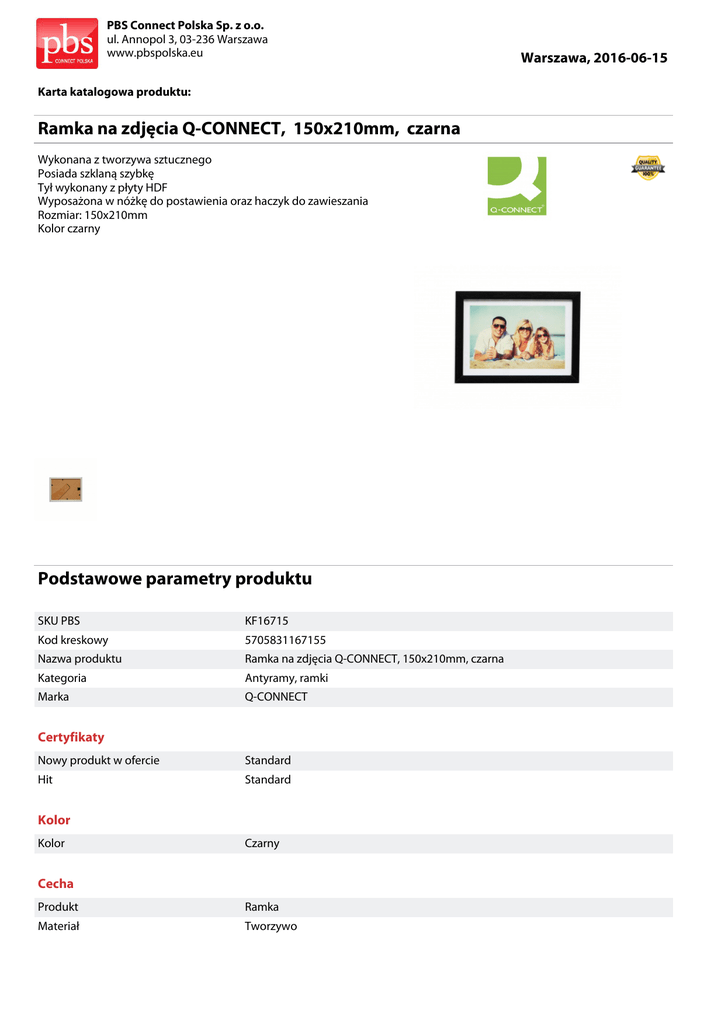 PBS Connect Polska Sp. z o.o. ul. Annopol 3, 03-236 Warszawa www.pbspolska.eu Karta katalogowa produktu: Ramka na zdjęcia Q-CONNECT, 150x210mm, czarna Wykonana z tworzywa sztucznego Posiada szklaną szybkę Tył wykonany z płyty HDF Wyposażona w nóżkę do postawienia oraz haczyk do zawieszania Rozmiar: 150x210mm Kolor czarny Podstawowe parametry produktu SKU PBS KF16715 Kod kreskowy 5705831167155 Nazwa produktu Ramka na zdjęcia Q-CONNECT, 150x210mm, czarna Kategoria Antyramy, ramki Marka Q-CONNECT Certyfikaty Nowy produkt w ofercie Standard Hit Standard Kolor Kolor Czarny Cecha Produkt Ramka Materiał Tworzywo Warszawa, 2016-06-15 PBS Connect Polska Sp. z o.o. ul. Annopol 3, 03-236 Warszawa www.pbspolska.eu Karta katalogowa produktu cd. Ramka na zdjęcia Q-CONNECT, 150x210mm, czarna Podstawowe parametry produktu W ofercie od 2014-08 Wymiary Wymiary (mm) 150x210 Wspólny słownik zamówień CPV 39298100-8 Ramki do fotografii Jednostki logistyczne Opakowanie 1 50 szt Opakowanie 2 1750 szt Warszawa, 2016-06-15