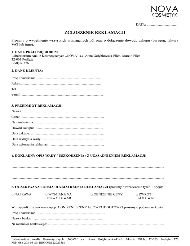 DATA: .................................... ZGŁOSZENIE REKLAMACJI Prosimy o wypełnienie wszystkich wymaganych pól oraz o dołączenie dowodu zakupu (paragon, faktura VAT lub inne). 1. DANE PRZEDSIĘBIORCY: Laboratorium Analiz Kosmetycznych „NOVA” s.c. Anna Gołębiowska-Pilch, Marcin Pilch 32-003 Podłęże Podłęże 376 2. DANE KLIENTA: Imię i nazwisko: ............................................................................ Adres:............................................................................................. Tel. :................................................................................................ e-mail: ............................................................................................ 3. PRZEDMIOT REKLAMACJI: Nazwa: ............................................................................................ Cena: ............................................................................................... Nr zamówienia: .............................................................................. Dowód zakupu: .............................................................................. Data zakupu: ................................................................................... Data wykrycia wady: ...................................................................... Data zgłoszenia reklamacji: ............................................................ 4. DOKŁADNY OPIS WADY / USZKODZENIA / Z UZASADNIENIEM REKLAMACJI: .............................................................................................................................................................................. .............................................................................................................................................................................. .............................................................................................................................................................................. .............................................................................................................................................................................. 5. OCZEKIWANA FORMA ROZMATRZENIA REKLAMACJI (prosimy o zaznaczenie tylko 1 opcji): □ NAPRAWA □ WYMIANA NA NOWY TOWAR □ OBNIŻENIE CENY □ ZWROT GOTÓWKI W przypadku zaznaczenia opcji: OBNIŻENIE CENY lub ZWROT GOTÓWKI prosimy o podanie nr konta: Imię i nazwisko: ............................................................................... Nazwa banku: ................................................................................... Nr rachunku bankowego: .................................................................................................................................... Laboratorium Analiz Kosmetycznych „NOVA” s.c. Anna Gołębiowska-Pilch, Marcin Pilch; 32-003 Podłęże 376 NIP: 683-208-03-89, REGON:122723586 Produkt(y) wraz z wypełnionym zgłoszeniem reklamacyjnym prosimy przesłać na adres: Laboratorium Analiz Kosmetycznych „NOVA” s.c. - Sklep internetowy 32-005 Niepołomice ul. Batorego 5 Zasady rozpatrzenia reklamacji reguluje ustawa z dnia 27 lipca 2002 r. o szczególnych warunkach sprzedaży konsumenckiej oraz o zmianie kodeksu cywilnego (Dz.U. z 2002 r. nr 141, poz. 1176) i inne przepisy powszechnie obowiązujące. Podpis klienta (reklamującego): .................................................................................. 6. SPOSÓB ROZPATRZENIA ZGŁOSZENIA REKLAMACYJNEGO (wypełnia Laboratorium Analiz Kosmetycznych „NOVA” s.c): .............................................................................................................................................................................. .............................................................................................................................................................................. .............................................................................................................................................................................. .............................................................................................................................................................................. Data: .................................................. Podpis osoby rozpatrującej zgłoszenie reklamacyjne: ..................................................................... Laboratorium Analiz Kosmetycznych „NOVA” s.c. Anna Gołębiowska-Pilch, Marcin Pilch; 32-003 Podłęże 376 NIP: 683-208-03-89, REGON:122723586