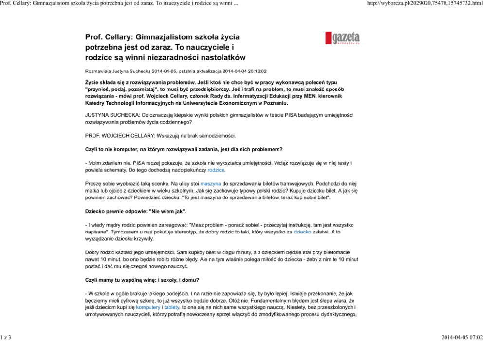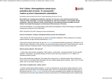 Prof. Cellary: Gimnazjalistom szkoła życia potrzebna jest od zaraz. To nauczyciele i rodzice są winni ... http://wyborcza.pl/2029020,75478,15745732.html Prof. Cellary: Gimnazjalistom szkoła życia potrzebna jest od zaraz. To nauczyciele i rodzice są winni niezaradności nastolatków Rozmawiała Justyna Suchecka 2014-04-05, ostatnia aktualizacja 2014-04-04 20:12:02 Życie składa się z rozwiązywania problemów. Jeśli ktoś nie chce być w pracy wykonawcą poleceń typu "przynieś, podaj, pozamiataj", to musi być przedsiębiorczy. Jeśli trafi na problem, to musi znaleźć sposób rozwiązania - mówi prof. Wojciech Cellary, członek Rady ds. Informatyzacji Edukacji przy MEN, kierownik Katedry Technologii Informacyjnych na Uniwersytecie Ekonomicznym w Poznaniu. JUSTYNA SUCHECKA: Co oznaczają kiepskie wyniki polskich gimnazjalistów w teście PISA badającym umiejętności rozwiązywania problemów życia codziennego? PROF. WOJCIECH CELLARY: Wskazują na brak samodzielności. Czyli to nie komputer, na którym rozwiązywali zadania, jest dla nich problemem? - Moim zdaniem nie. PISA raczej pokazuje, że szkoła nie wykształca umiejętności. Wciąż rozwiązuje się w niej testy i powiela schematy. Do tego dochodzą nadopiekuńczy rodzice. Proszę sobie wyobrazić taką scenkę. Na ulicy stoi maszyna do sprzedawania biletów tramwajowych. Podchodzi do niej matka lub ojciec z dzieckiem w wieku szkolnym. Jak się zachowuje typowy polski rodzic? Kupuje dziecku bilet. A jak się powinien zachować? Powiedzieć dziecku: "To jest maszyna do sprzedawania biletów, teraz kup sobie bilet". Dziecko pewnie odpowie: "Nie wiem jak". - I wtedy mądry rodzic powinien zareagować: "Masz problem - poradź sobie! - przeczytaj instrukcję, tam jest wszystko napisane". Tymczasem u nas pokutuje stereotyp, że dobry rodzic to taki, który wszystko za dziecko załatwi. A to wyrządzanie dziecku krzywdy. Dobry rodzic kształci jego umiejętności. Sam kupiłby bilet w ciągu minuty, a z dzieckiem będzie stał przy biletomacie nawet 10 minut, bo ono będzie robiło różne błędy. Ale na tym właśnie polega miłość do dziecka - żeby z nim te 10 minut postać i dać mu się czegoś nowego nauczyć. Czyli mamy tu wspólną winę: i szkoły, i domu? - W szkole w ogóle brakuje takiego podejścia. I na razie nie zapowiada się, by było lepiej. Istnieje przekonanie, że jak będziemy mieli cyfrową szkołę, to już wszystko będzie dobrze. Otóż nie. Fundamentalnym błędem jest ślepa wiara, że jeśli dzieciom kupi się komputery i tablety, to one się na nich same wszystkiego nauczą. Niestety, bez przeszkolonych i umotywowanych nauczycieli, którzy potrafią nowoczesny sprzęt włączyć do zmodyfikowanego procesu dydaktycznego, 1z3 2014-04-05 07:02 Prof. Cellary: Gimnazjalistom szkoła życia potrzebna jest od zaraz. To nauczyciele i rodzice są winni ... http://wyborcza.pl/2029020,75478,15745732.html nic się samo nie stanie. Bo maszyna sama nie zadziała. - Komputer i tablet są wspaniałymi narzędziami, za pomocą których można rozwijać różne umiejętności. Tylko trzeba wiedzieć, jakie i jakimi metodami. Te badania PISA są ważne, bo sprawdzają, jak młody człowiek reaguje w zetknięciu z pewną nowością. W normalnym życiu dziecko zazwyczaj imituje rodziców. Patrzy, co robi dorosły, i potem powtarza te same rzeczy. Z punktu widzenia kreatywności i innowacyjności to niekoniecznie jest dobre, bo nie musi oznaczać zrozumienia problemu i próby samodzielnego rozwiązania go. To jak powinno reagować? - Chodzi o to, by potrafiło zmobilizować się, kiedy natrafi na trudność, i zmierzyć się z tą nowością. To problem postawy. Jeden mówi: "To nie działa", drugi zacznie kopać maszynę ze złości, trzeci stwierdzi, że wszyscy naokoło są winni, bo nikt mu nie powiedział. Tymczasem dziecko powinno w takiej sytuacji zacząć spontanicznie szukać rozwiązania problemu. Najlepiej, jak zacznie od przeczytania instrukcji ze zrozumieniem. Może szukać metodą prób i błędów. Nawet zapytanie kogoś o radę jest lepsze od rezygnacji lub wybuchów złości. Kształtowanie takich postaw powinno być celem wychowania w domu i edukacji w szkole. Dlaczego te badania powinny martwić dorosłych? - Bo życie składa się z rozwiązywania problemów. Jeśli ktoś nie chce być w pracy wykonawcą cudzych poleceń typu "przynieś, podaj, pozamiataj", to musi być przedsiębiorczy. Jeśli trafi na problem, to musi znaleźć sposób rozwiązania go, jeśli dojrzy okazję biznesową, to potrafi z niej skorzystać. Takie aktywne, przedsiębiorcze postawy są tradycyjnie pokazywane jako polska silna strona. To koniec mówienia: "Zaradny jak Polak"? - Niedawno rozmawiałem o fabryce samochodów w Polsce. Usłyszałem, że jest duża różnica między postawą pracownika polskiego i niemieckiego. Jeśli w procesie montażu zdarzy się część wadliwa, to Niemiec albo ją zamontuje, albo wyrzuci. A Polak ją naprawi. I ten obrazek jest w kontraście do wyników PISA. Możliwe, że młodzi uczniowie, którzy teraz są poddani badaniu, już tych umiejętności nie mają. Już nie będą naprawiać żadnych części, a wtedy my stracimy przewagę konkurencyjną, którą dziś mamy. I wracamy do szkoły. Czy ona może tę tendencję odwrócić? - Dziś dowolne fakty można znaleźć w sposób o niebo łatwiejszy niż kiedyś, bo mamy internet. A przecież w szkole spędzamy tyle samo czasu co dawniej. Trzeba go więc lepiej wykorzystać. Uczeń musi znać pewne fakty, bo inaczej nie będzie w stanie ich kojarzyć i wyciągać wniosków. Ale z samej ich znajomości nic nie wynika. Jeśli nie nauczymy go aktywnej postawy, dostrzegania tego, co nowe, rozwiązywania problemów, to w dorosłym życiu będzie odgrywał drugorzędną rolę we współczesnym świecie. 2z3 2014-04-05 07:02 Prof. Cellary: Gimnazjalistom szkoła życia potrzebna jest od zaraz. To nauczyciele i rodzice są winni ... http://