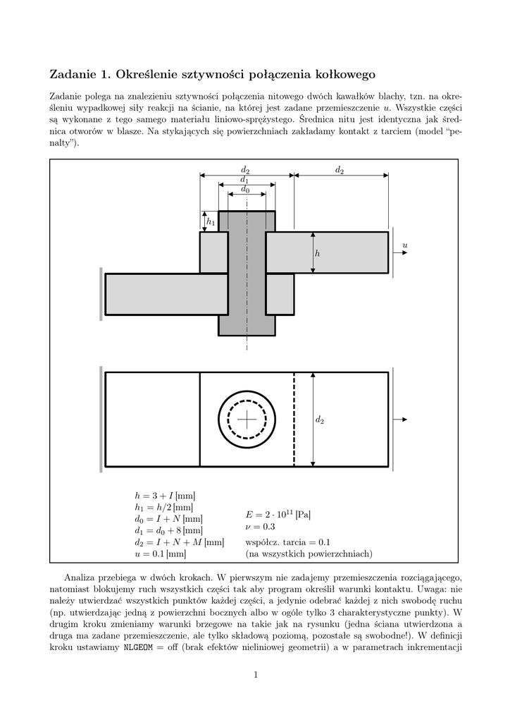 Zadanie 1. Określenie sztywności połączenia kołkowego Zadanie polega na znalezieniu sztywności połączenia nitowego dwóch kawałków blachy, tzn. na określeniu wypadkowej siły reakcji na ścianie, na której jest zadane przemieszczenie u. Wszystkie części są wykonane z tego samego materiału liniowo-sprężystego. Średnica nitu jest identyczna jak średnica otworów w blasze. Na stykających się powierzchniach zakładamy kontakt z tarciem (model “penalty”). d2 d1 d0 d2 h1 h u d2 h = 3 + I [mm] h1 = h/2 [mm] d0 = I + N [mm] d1 = d0 + 8 [mm] d2 = I + N + M [mm] u = 0.1 [mm] E = 2 · 1011 [Pa] ν = 0.3 współcz. tarcia = 0.1 (na wszystkich powierzchniach) Analiza przebiega w dwóch krokach. W pierwszym nie zadajemy przemieszczenia rozciągającego, natomiast blokujemy ruch wszystkich części tak aby program określił warunki kontaktu. Uwaga: nie należy utwierdzać wszystkich punktów każdej części, a jedynie odebrać każdej z nich swobodę ruchu (np. utwierdzając jedną z powierzchni bocznych albo w ogóle tylko 3 charakterystyczne punkty). W drugim kroku zmieniamy warunki brzegowe na takie jak na rysunku (jedna ściana utwierdzona a druga ma zadane przemieszczenie, ale tylko składową poziomą, pozostałe są swobodne!). W definicji kroku ustawiamy NLGEOM = off (brak efektów nieliniowej geometrii) a w parametrach inkrementacji 1 ustawiamy initial increment size = 1. Należy używać elementów z liniowymi funkcjami kształtu c3d8 (nie “reduced integration” c3d8r!). Gęstość siatki powinna być taka, żeby na grubości blachy były 4 warstwy elementów, natomiast nit powinien mieć nieco gęstszą dysktretyzację, np. 11 warstw elementów w części cylindrycznej. Ze względu na to należy również (odwrotnie niż w zadaniu z tutorialu!) oznaczyć powierzchnie nitu jako slave w definicjach par powierzchni kontaktowych — wówczas analiza kontaktu będzie dokładniejsza. Rozwiązaniem jest, tak jak wspomniano, wypadkowa siła reakcji na ścianie, na której zadane jest przemieszczenie. Warunkiem zaliczenia zadania jest przysłanie e-mailem ([email protected]) rozwiązania (liczba i miano) oraz załącznika z plikiem .cae . Wskazówki • Aby uniknąć kłopotów ze zbieżnością przy analizie kontaktu, „łagodzimy” warunki kontaktowe poprzez zadanie pewnej podatności „warstwy kontaktowej” w kierunku normalnym. W definicji modelu kontaktu wybieramy dodatkowo normal behavior: exponential, i zadajemy wartości np. clearance: 1.e−5 [m] oraz pressure: 1.e7 [Pa]. (Oznacza to, że reakcja normalna pojawia się, gdy odstęp między powierzchniami jest mniejszy niż zadana wartość clearance i narasta wykładniczo, osiągając zadaną wartość pressure przy zerowym odstępie.) • Uwaga: proszę nie definiować “reference point” dla nitu — ma to sens tylko w przypadku brył sztywnych! • Przy definiowaniu par kontaktowych proszę nie zapomnieć o płaskich pierścieniowych powierzchniach pod łbami nitu, wchodzących w kontakt z blachami. 2