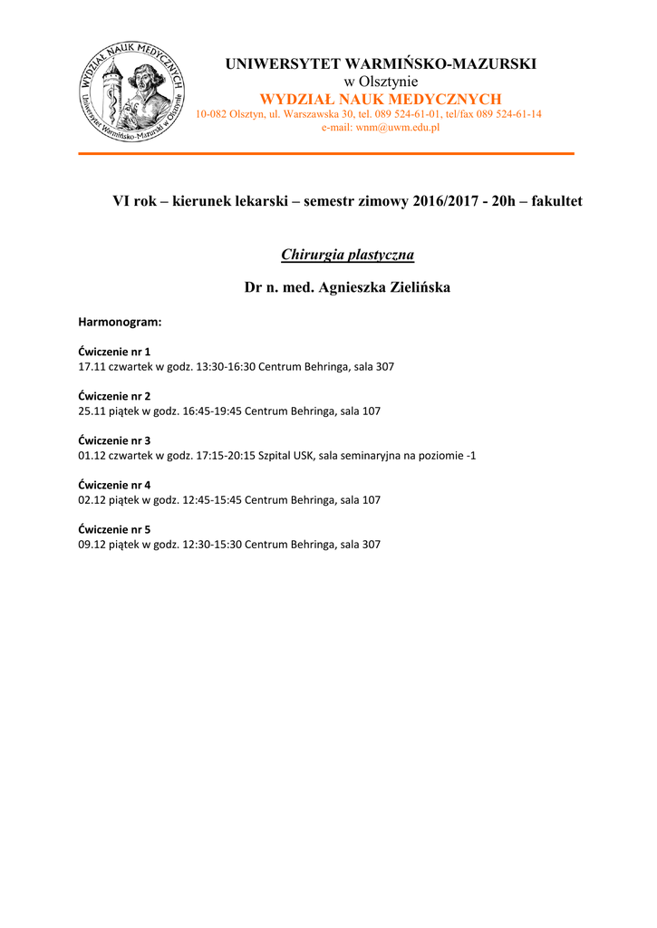 UNIWERSYTET WARMIŃSKO-MAZURSKI w Olsztynie WYDZIAŁ NAUK MEDYCZNYCH 10-082 Olsztyn, ul. Warszawska 30, tel. 089 524-61-01, tel/fax 089 524-61-14 e-mail: [email protected] VI rok – kierunek lekarski – semestr zimowy 2016/2017 - 20h – fakultet Chirurgia plastyczna Dr n. med. Agnieszka Zielińska Harmonogram: Ćwiczenie nr 1 17.11 czwartek w godz. 13:30-16:30 Centrum Behringa, sala 307 Ćwiczenie nr 2 25.11 piątek w godz. 16:45-19:45 Centrum Behringa, sala 107 Ćwiczenie nr 3 01.12 czwartek w godz. 17:15-20:15 Szpital USK, sala seminaryjna na poziomie -1 Ćwiczenie nr 4 02.12 piątek w godz. 12:45-15:45 Centrum Behringa, sala 107 Ćwiczenie nr 5 09.12 piątek w godz. 12:30-15:30 Centrum Behringa, sala 307