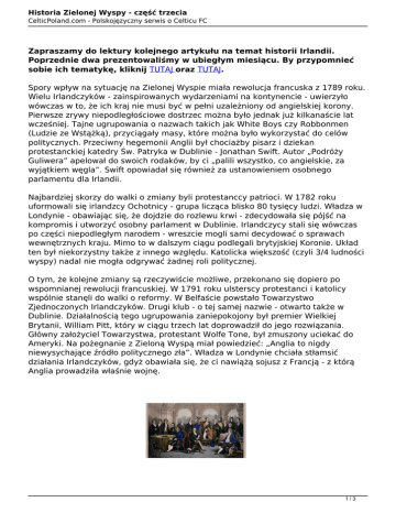 Historia Zielonej Wyspy - część trzecia CelticPoland.com - Polskojęzyczny serwis o Celticu FC Zapraszamy do lektury kolejnego artykułu na temat historii Irlandii. Poprzednie dwa prezentowaliśmy w ubiegłym miesiącu. By przypomnieć sobie ich tematykę, kliknij TUTAJ oraz TUTAJ. Spory wpływ na sytuację na Zielonej Wyspie miała rewolucja francuska z 1789 roku. Wielu Irlandczyków - zainspirowanych wydarzeniami na kontynencie - uwierzyło wówczas w to, że ich kraj nie musi być w pełni uzależniony od angielskiej korony. Pierwsze zrywy niepodległościowe dostrzec można było jednak już kilkanaście lat wcześniej. Tajne ugrupowania o nazwach takich jak White Boys czy Robbonmen (Ludzie ze Wstążką), przyciągały masy, które można było wykorzystać do celów politycznych. Przeciwny hegemonii Anglii był chociażby pisarz i dziekan protestanckiej katedry Św. Patryka w Dublinie - Jonathan Swift. Autor „Podróży Guliwera” apelował do swoich rodaków, by ci „palili wszystko, co angielskie, za wyjątkiem węgla”. Swift opowiadał się również za ustanowieniem osobnego parlamentu dla Irlandii. Najbardziej skorzy do walki o zmiany byli protestanccy patrioci. W 1782 roku uformowali się irlandzcy Ochotnicy - grupa licząca blisko 80 tysięcy ludzi. Władza w Londynie - obawiając się, że dojdzie do rozlewu krwi - zdecydowała się pójść na kompromis i utworzyć osobny parlament w Dublinie. Irlandczycy stali się wówczas po części niepodległym narodem - wreszcie mogli sami decydować o sprawach wewnętrznych kraju. Mimo to w dalszym ciągu podlegali brytyjskiej Koronie. Układ ten był niekorzystny także z innego względu. Katolicka większość (czyli 3/4 ludności wyspy) nadal nie mogła odgrywać żadnej roli politycznej. O tym, że kolejne zmiany są rzeczywiście możliwe, przekonano się dopiero po wspomnianej rewolucji francuskiej. W 1791 roku ulsterscy protestanci i katolicy wspólnie stanęli do walki o reformy. W Belfaście powstało Towarzystwo Zjednoczonych Irlandczyków. Drugi klub - o tej samej nazwie - otwarto także w Dublinie. Działalnością tego ugrupowania zaniepokojony był premier Wielkiej Brytanii, William Pitt, który w ciągu trzech lat doprowadził do jego rozwiązania. Główny założyciel Towarzystwa, protestant Wolfe Tone, był zmuszony uciekać do Ameryki. Na pożegnanie z Zieloną Wyspą miał powiedzieć: „Anglia to nigdy niewysychające źródło politycznego zła”. Władza w Londynie chciała stłamsić działania Irlandczyków, gdyż obawiała się, że ci nawiążą sojusz z Francją - z którą Anglia prowadziła właśnie wojnę. 1/3 Historia Zielonej Wyspy - część trzecia CelticPoland.com - Polskojęzyczny serwis o Celticu FC (Zjednoczeni Irlandczycy) Wspomniany Tone rzeczywiście udał się później do Francji, gdzie prosił o wsparcie zbrojne i namawiał do walki ze wspólnym wrogiem. Premier Brytanii, na wieść o planowanej ekspedycji francuskiej, wprowadził w Ulsterze stan wojenny. Na północy Irlandii zapanował terror, a do głosu zaczęło dochodzić nowe ugrupowanie oranżyści (od 1975 Towarzystwo Orańskie, potem Zakon Orański). Powstało ono w momencie, gdy protestanci zaczęli walczyć z katolickimi Obrońcami (należeli do nich zwykle robotnicy). Zaciekłe walki pochłonęły ponad 30 ofiar. Całe wydarzenie nazwano później Battle of the Diamond (Bitwa o Diament). Wydarzenia w Ulsterze były na rękę brytyjskiego rządu. Towarzystwo Orańskie - nazwane tak na cześć omawianego wcześniej Wilhelma III Orańskiego - pomagało im bowiem pozbyć się Zjednoczonych Irlandczyków. Niezadowolenie z angielskiej władzy osiągnęło szczyt w maju 1798 roku, kiedy wybuchło powstanie, nazwane później „Wielką Rebelią”. Inicjatorami tego narodowego poruszenia byli wykruszający się Zjednoczeni Irlandczycy. W tym okresie wielu przywódców owej organizacji przebywało już w areszcie. Powstanie, które było fatalnie zorganizowane, zakończyło się wielką klęską. Z powstańcami rozprawiła się przede wszystkim miejscowa szlachta. W ciągu sześciu tygodni zginęło blisko 50 tysięcy ludzi. W momencie, gdy Irlandczycy ponosili kolejną klęskę, założyciel Zjednoczonych Irlandczyków, Wolfe Tone, nakłaniał Napoleona Bonaparte, by ten nie cofał francuskiego poparcia dla Zielonej Wyspy. Negocjacje były na tyle pomyślne, że Napoleon zdecydował się wysłać kolejną ekspedycję, która wyruszyła z portów w sierpniu 1798 roku. Po dotarciu do Irlandii francuzi połączyli się z liczącym 5 tysięcy żołnierzy oddziałem powstańczym. Zdołali odnieść kilka zwycięstw nad armią brytyjską, jednak w bitwie pod Lough Swilly oddziały powstańcze zostały rozgromione, a Wolfe Tone dostał się do niewoli. Skazano go na ścięcie głowy. Nie chciał jednak dać satysfakcji Anglikom i popełnił w celi samobójstwo. (Napoleon w Irlandii) 2/3 Historia Zielonej Wyspy - część trzecia CelticPoland.com - Polskojęzyczny serwis o Celticu FC Mimo śmierci Tone’a Napoleon nie porzucił Irlandii i ogłosił ją republiką. Deklaracja ta nie miała jednak żadnego oparcia w rzeczywistości. W odpowiedzi rozwścieczony William Pitt (angielski premier) zaproponował unię Irlandii z Wielką Brytanią. Proponował zlikwidowanie dublińskiego parlamentu, a irlandzkim reprezentantom dawał 100 miejsc w Izbie Gmin parlamentu londyńskiego. Anglicy, Szkoci, Walijczycy i Irlandczycy mieli być w Zjednoczonym Królestwie traktowani jednakowo. Przywódcy z Zielonej Wyspy nie byli jednak przekonani co do tej propozycji. Ostatecznie zostali przekupieni. W zamian za swoje głosy poparcia otrzymali szlacheckie godności, urzędy państwowe oraz łapówki. Unia stała się faktem 1 stycznia 1801 roku. „Wkraczamy w nowy rozdział historii. Nasza unia to dobrowolne połączenie. Interesy naszych krajów będą od teraz nierozerwalne, a wszyscy będziemy cieszyć się równymi prawami” - zapewniał Pi