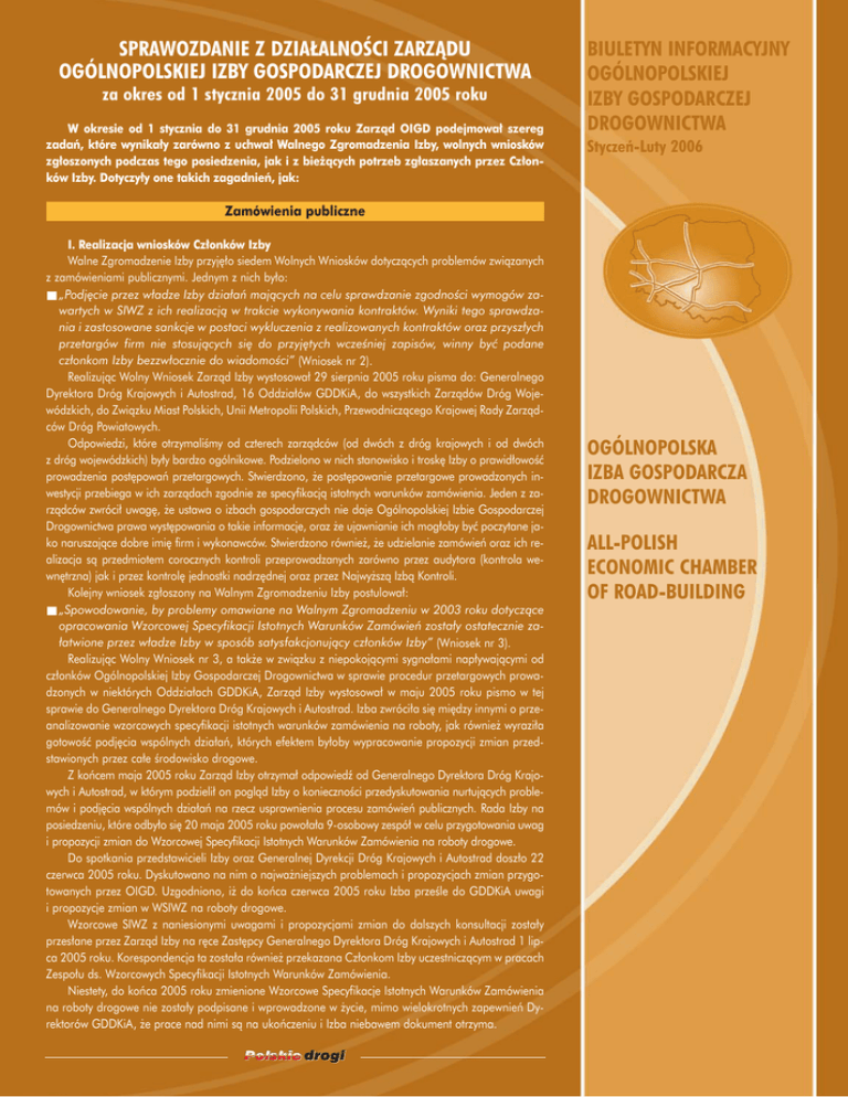 SPRAWOZDANIE Z DZIA¸ALNOÂCI ZARZÑDU OGÓLNOPOLSKIEJ IZBY GOSPODARCZEJ DROGOWNICTWA za okres od 1 stycznia 2005 do 31 grudnia 2005 roku W okresie od 1 stycznia do 31 grudnia 2005 roku Zarzàd OIGD podejmowa∏ szereg zadaƒ, które wynika∏y zarówno z uchwa∏ Walnego Zgromadzenia Izby, wolnych wniosków zg∏oszonych podczas tego posiedzenia, jak i z bie˝àcych potrzeb zg∏aszanych przez Cz∏onków Izby. Dotyczy∏y one takich zagadnieƒ, jak: BIULETYN INFORMACYJNY OGÓLNOPOLSKIEJ IZBY GOSPODARCZEJ DROGOWNICTWA Styczeƒ-Luty 2006 Zamówienia publiczne I. Realizacja wniosków Cz∏onków Izby Walne Zgromadzenie Izby przyj´∏o siedem Wolnych Wniosków dotyczàcych problemów zwiàzanych z zamówieniami publicznymi. Jednym z nich by∏o: ■ „Podj´cie przez w∏adze Izby dzia∏aƒ majàcych na celu sprawdzanie zgodnoÊci wymogów zawartych w SIWZ z ich realizacjà w trakcie wykonywania kontraktów. Wyniki tego sprawdzania i zastosowane sankcje w postaci wykluczenia z realizowanych kontraktów oraz przysz∏ych przetargów firm nie stosujàcych si´ do przyj´tych wczeÊniej zapisów, winny byç podane cz∏onkom Izby bezzw∏ocznie do wiadomoÊci” (Wniosek nr 2). Realizujàc Wolny Wniosek Zarzàd Izby wystosowa∏ 29 sierpnia 2005 roku pisma do: Generalnego Dyrektora Dróg Krajowych i Autostrad, 16 Oddzia∏ów GDDKiA, do wszystkich Zarzàdów Dróg Wojewódzkich, do Zwiàzku Miast Polskich, Unii Metropolii Polskich, Przewodniczàcego Krajowej Rady Zarzàdców Dróg Powiatowych. Odpowiedzi, które otrzymaliÊmy od czterech zarzàdców (od dwóch z dróg krajowych i od dwóch z dróg wojewódzkich) by∏y bardzo ogólnikowe. Podzielono w nich stanowisko i trosk´ Izby o prawid∏owoÊç prowadzenia post´powaƒ przetargowych. Stwierdzono, ˝e post´powanie przetargowe prowadzonych inwestycji przebiega w ich zarzàdach zgodnie ze specyfikacjà istotnych warunków zamówienia. Jeden z zarzàdców zwróci∏ uwag´, ˝e ustawa o izbach gospodarczych nie daje Ogólnopolskiej Izbie Gospodarczej Drogownictwa prawa wyst´powania o takie informacje, oraz ˝e ujawnianie ich mog∏oby byç poczytane jako naruszajàce dobre imi´ firm i wykonawców. Stwierdzono równie˝, ˝e udzielanie zamówieƒ oraz ich realizacja sà przedmiotem corocznych kontroli przeprowadzanych zarówno przez audytora (kontrola wewn´trzna) jak i przez kontrol´ jednostki nadrz´dnej oraz przez Najwy˝szà Izbà Kontroli. Kolejny wniosek zg∏oszony na Walnym Zgromadzeniu Izby postulowa∏: ■ „Spowodowanie, by problemy omawiane na Walnym Zgromadzeniu w 2003 roku dotyczàce opracowania Wzorcowej Specyfikacji Istotnych Warunków Zamówieƒ zosta∏y ostatecznie za∏atwione przez w∏adze Izby w sposób satysfakcjonujàcy cz∏onków Izby” (Wniosek nr 3). Realizujàc Wolny Wniosek nr 3, a tak˝e w zwiàzku z niepokojàcymi sygna∏ami nap∏ywajàcymi od cz∏onków Ogólnopolskiej Izby Gospodarczej Drogownictwa w sprawie procedur przetargowych prowadzonych w niektórych Oddzia∏ach GDDKiA, Zarzàd Izby wystosowa∏ w maju 2005 roku pismo w tej sprawie do Generalnego Dyrektora Dróg Krajowych i Autostrad. Izba zwróci∏a si´ mi´dzy innymi o przeanalizowanie wzorcowych specyfikacji istotnych warunków zamówienia na roboty, jak równie˝ wyrazi∏a gotowoÊç podj´cia wspólnych dzia∏aƒ, których efektem by∏oby wypracowanie propozycji zmian przedstawionych przez ca∏e Êrodowisko drogowe. Z koƒcem maja 2005 roku Zarzàd Izby otrzyma∏ odpowiedê od Generalnego Dyrektora Dróg Krajowych i Autostrad, w którym podzieli∏ on poglàd Izby o koniecznoÊci przedyskutowania nurtujàcych problemów i podj´cia wspólnych dzia∏aƒ na rzecz usprawnienia procesu zamówieƒ publicznych. Rada Izby na posiedzeniu, które odby∏o si´ 20 maja 2005 roku powo∏a∏a 9-osobowy zespó∏ w celu przygotowania uwag i propozycji zmian do Wzorcowej Specyfikacji Istotnych Warunków Zamówienia na roboty drogowe. Do spotkania przedstawicieli Izby oraz Generalnej Dyrekcji Dróg Krajowych i Autostrad dosz∏o 22 czerwca 2005 roku. Dyskutowano na nim o najwa˝niejszych problemach i propozycjach zmian przygotowanych przez OIGD. Uzgodniono, i˝ do koƒca czerwca 2005 roku Izba przeÊle do GDDKiA uwagi i propozycje zmian w WSIWZ na roboty drogowe. Wzorcowe SIWZ z naniesionymi uwagami i propozycjami zmian do dalszych konsultacji zosta∏y przes∏ane przez Zarzàd Izby na r´ce Zast´pcy Generalnego Dyrektora Dróg Krajowych i Autostrad 1 lipca 2005 roku. Korespondencja ta zosta∏a równie˝ przekazana Cz∏onkom Izby uczestniczàcym w pracach Zespo∏u ds. Wzorcowych Specyfikacji Istotnych Warunków Zamówienia. Niestety, do koƒca 2005 roku zmienione Wzorcowe Specyfikacje Istotnych Warunków Zamówienia na roboty drogowe nie zosta∏y podpisane i wprowadzone w ˝ycie, mimo wielokrotnych zapewnieƒ Dyrektorów GDDKiA, ˝e prace nad nimi sà na ukoƒczeniu i Izba niebawem dokument otrzyma. OGÓLNOPOLSKA IZBA GOSPODARCZA DROGOWNICTWA ALL-POLISH ECONOMIC CHAMBER OF ROAD-BUILDING Zarzàd Izby kilkakrotnie w pismach dopytywa∏ si´ o stan zaawansowania prac nad SIWZ, jak równie˝ prosi∏ o pilne za∏atwienie tego problemu – pisma Izby z: 13 wrzeÊnia, 26 paêdziernika, 24 listopada, 8 grudnia jak równie˝ z 30 grudnia 2005 roku. Zarzàd Izby nadal b´dzie prowadzi∏ intensywne dzia∏ania majàce na celu pozytywne za∏atwienie tej niezmiernie wa˝nej dla naszych Cz∏onków sprawy. Kolejne wnioski dotyczy∏y: ■ „Podj´cia przez W∏adze Izby dzia∏aƒ celem spowodowania, aby w ustawie Prawo zamówieƒ publicznych znalaz∏a si´ definicja „cena ra˝àco niska” i aby kryterium to by∏o stosowane przy rozstrzyganiu przetargów” (Wniosek nr 4). ■ „Powo∏ania Zespo∏u sk∏adajàcego si´ z przedstawicieli OIGD do wypracowania i zg∏oszenia propozycji Izby do zapowiadanych zmian w przepisach ustawy Prawo zamówieƒ publicznych, które wzmocnià pozycj´ wykonawców w robotach budowlanych podczas proce
