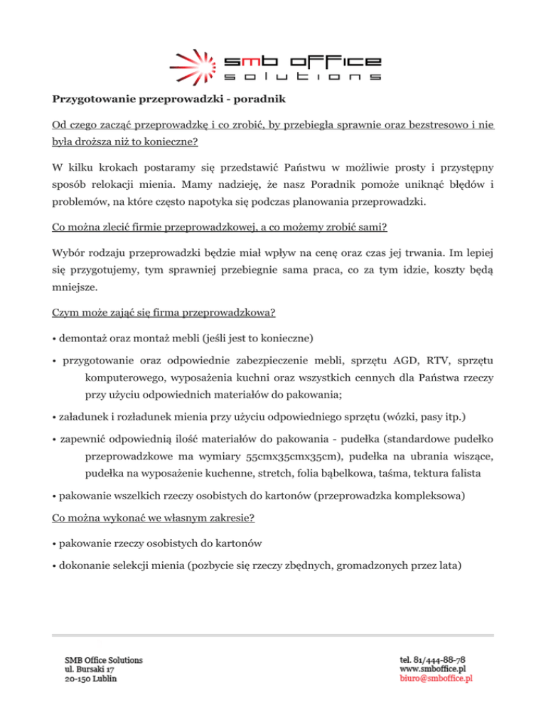 Przygotowanie przeprowadzki - poradnik Od czego zacząć przeprowadzkę i co zrobić, by przebiegła sprawnie oraz bezstresowo i nie była droższa niż to konieczne? W kilku krokach postaramy się przedstawić Państwu w możliwie prosty i przystępny sposób relokacji mienia. Mamy nadzieję, że nasz Poradnik pomoże uniknąć błędów i problemów, na które często napotyka się podczas planowania przeprowadzki. Co można zlecić firmie przeprowadzkowej, a co możemy zrobić sami? Wybór rodzaju przeprowadzki będzie miał wpływ na cenę oraz czas jej trwania. Im lepiej się przygotujemy, tym sprawniej przebiegnie sama praca, co za tym idzie, koszty będą mniejsze. Czym może zająć się firma przeprowadzkowa? • demontaż oraz montaż mebli (jeśli jest to konieczne) • przygotowanie oraz odpowiednie zabezpieczenie mebli, sprzętu AGD, RTV, sprzętu komputerowego, wyposażenia kuchni oraz wszystkich cennych dla Państwa rzeczy przy użyciu odpowiednich materiałów do pakowania; • załadunek i rozładunek mienia przy użyciu odpowiedniego sprzętu (wózki, pasy itp.) • zapewnić odpowiednią ilość materiałów do pakowania - pudełka (standardowe pudełko przeprowadzkowe ma wymiary 55cmx35cmx35cm), pudełka na ubrania wiszące, pudełka na wyposażenie kuchenne, stretch, folia bąbelkowa, taśma, tektura falista • pakowanie wszelkich rzeczy osobistych do kartonów (przeprowadzka kompleksowa) Co można wykonać we własnym zakresie? • pakowanie rzeczy osobistych do kartonów • dokonanie selekcji mienia (pozbycie się rzeczy zbędnych, gromadzonych przez lata) Kiedy, czyli słów kilka o terminie Pierwszym krokiem jest ustalenie terminu przeprowadzki. Do wyboru mamy dzień powszedni lub weekend. Jeśli chodzi o weekend, to polecamy sobotę, gdyż przeprowadzka w niedzielę lub dzień świąteczny będzie znacznie droższa. Termin sobotni z uwagi na jego "atrakcyjność" trzeba rezerwować ze znacznym wyprzedzeniem. Znacznie łatwiej zarezerwować termin od poniedziałku do piątku, jednak wtedy musimy mieć dużo wolnego czasu. Wybierając godzinę przeprowadzki należy wziąć pod uwagę przewidywany czas jej trwania. By oszacować czas przeprowadzki, mogą Państwo skorzystać z pomocy wykwalifikowanego pracownika Naszej firmy. Najlepszą porą na rozpoczęcie przeprowadzki jest poranek - 9:00 bądź 10:00, zwłaszcza jeśli mieszkamy w bloku. Zaczynając około godziny 9:00 unikniemy utrudnień na klatce schodowej a przed budynkiem będzie miejsce dla naszego samochodu. Zaczynając dużą przeprowadzkę rano, mamy pewność, że skończymy tego samego dnia. Wycena przeprowadzki Wyceny przeprowadzki można dokonać telefonicznie ale jeśli jest to większa przeprowadzka, to najlepiej dokonać wyceny osobistej. Pracownik firmy przeprowadzkowej przyjedzie do Państwa w ustalonym terminie, dokona oględzin i sporządzi protokół przeprowadzki, na podstawie którego wykonana zostanie usługa. W protokole znajdą się wszystkie czynności, warunki oraz materiały niezbędne do wykonania usługi. Wycena osobista pozwala obu stronom uniknąć niespodzianek w dniu przeprowadzki. Firma wie, czego ma się spodziewać, jaki sprzęt i materiały materiały będą niezbędne, aby dokonać bezpiecznej relokacji mienia, a klient otrzyma konkretną cenę usługi zamiast tzw. "widełek cenowych". Korzyści z osobistej wyceny mają obie strony. Zanim zadzwonisz do firmy przeprowadzkowej przygotuj sobie odpowiedzi na kilka pytań, które pozwolą ocenić zakres i wielkość przewidywanych prac, a co za tym idzie, cenę usługi. Najlepiej zrób sobie małą listę, którą możesz się posłużyć także wysyłając e-maila z zapytaniem o cenę przeprowadzki. Oto kilka spraw, o które zapyta nas pracownik firmy przeprowadzkowej podczas wyceny przeprowadzki: • lokalizacja miejsca startowego i miejsca docelowego (dokładne adresy) • z którego piętra i czy jest winda (osobowa / towarowa) • na które piętro i czy jest winda (osobowa / towarowa) • ewentualne utrudnienia, które napotkamy w lokalizacji startowej i docelowej (np. długie podejście, brak podjazdu pod klatkę, strome schody, itp.) • rzeczy, które na pewno nie zmieszczą się do windy • meble i inne przedmioty ponadgabarytowe (np. szafa pancerna, sejf, pianino) • rzeczy wymagające specjalnego traktowania (delikatne przedmioty, RTV, szkło, antyki, itp.) • czy sprzęt RTV i sprzęt komputerowy posiada oryginalne opakowania • pakowanie - klient we własnym zakresie czy firma przeprowadzkowa (chodzi tu o pakowanie mienia do kartonów) • czy potrzebne są materiały do pakowania (kartony, inne pojemniki, garderoby przenośne, folie, itp.) jakieś szczególne wymagania dotyczące wykonania usługi (np. niektóre firmy wymagają, aby przeprowadzka nie kolidowała z ich działaniem w żaden sposób i wszystkie prace relokacyjne należy przeprowadzić w godzinach wolnych, np. w nocy) Pakowanie Istota pakowania polega na takim zabezpieczeniu przewożonych przedmiotów, aby dotarły w całości i bez szwanku do miejsca przeznaczenia. Oryginalne opakowania sprzętu RTV oraz sprzętu komputerowego najlepiej zabezpieczą Twój sprzęt podczas transportu. Jeśli posiadasz oryginalne kartony i opakowania, wskazane jest ich użycie. Pakując rzeczy do kartonów należy brać pod uwagę, że ktoś je musi podnieść :-) Zdarzało się, że klient ustawiał sobie na środku salonu wielki karton po telewizorze po czym wrzucał do niego wszystko, co mu wpadło w ręce, od książek, poprzez naczynia, na żywych roślinach kończąc. Efekt był taki, że dwóch ludzi nie bardzo było w stanie podnieść ów karton, a we czwórkę nawet nie próbowali, bo dno by z pewnścią nie wytrzymało :-) Wszystko trzeba było pakować od początku... Naczynia i przedmioty szklane pakujemy w specjalny papier do szkła, owijając dokładnie i ciasno układając w kartonie. Książki należy pakować do średniej wielkości kartonów. 