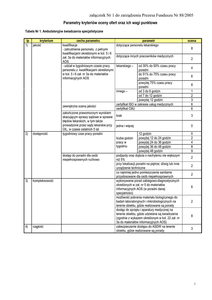 załącznik Nr 1 do zarządzenia Prezesa Funduszu Nr 88/2005 Parametry kryteriów oceny ofert oraz ich wagi punktowe Tabela Nr 1. Ambulatoryjne świadczenia specjalistyczne lp 1) 2) 3) 4) kryterium jakość dostępność kompleksowość ciągłość cecha parametru parametr kwalifikacje dotyczące personelu lekarskiego - zatrudnienie personelu z pełnymi kwalifikacjami określonymi w kol. 5 i 6 dotyczące innych pracowników medycznych zał. 3a do materiałów informacyjnych AOS - udział w tygodniowym czasie pracy lekarskiego – od 30% do 50% czasu pracy personelu z kwalifikacjami określonymi poradni w kol. 5 i 6 zał. nr 3a do materiałów do 51% do 75% czasu pracy informacyjnych AOS poradni powyżej 75% czasu pracy poradni od 3 do 6 godzin innego – od 7 do 12 godzin powyżej 12 godzin certyfikat ISO w zakresie usług medycznych zewnętrzna ocena jakości certyfikat CMJ zakończone prawomocnym wyrokiem skazującym sprawy sądowe w sprawie brak błędów lekarskich, w tym także prowadzone przez sądy lekarskie przy jedna i więcej OIL, w czasie ostatnich 5 lat tygodniowy czas pracy poradni 12 godzin powyżej 12 do 24 godzin liczba godzin pracy w powyżej 24 do 36 godzin tygodniu powyżej 36 do 48 godzin powyżej 48 godzin podjazdy oraz dojścia o nachyleniu nie większym dostęp do poradni dla osób niż 5% niepełnosprawnych ruchowo przy lokalizacji poradni na piętrze; dźwig lub inne urządzenie techniczne co najmniej jedno pomieszczenie sanitarne przystosowane dla osób niepełnosprawnych wykonywanie porad zabiegowo-diagnostycznych określonych w zał. nr 5 do materiałów informacyjnych AOS (w poradni danej specjalności) możliwość pobrania materiału biologicznego do badań laboratoryjnych i mikrobiologicznych na terenie obiektu, gdzie realizowane są porady dostęp do sprzętu i aparatury medycznej na terenie obiektu, gdzie udzielane są świadczenia (zgodnie z wykazem określonym w kol. 22 zał. nr 3a do materiałów informacyjnych AOS) zabezpieczenie dostępu do ASDW na terenie obiektu, gdzie realizowane są porady ocena 8 2 4 6 8 1 2 3 6 6 3 0 0 2 4 8 9 2 2 2 6 2 8 3 2 Tabela Nr 2a. Leczenie szpitalne wg specjalności lp 1) kryterium jakość cecha zewnętrzna ocena jakości kwalifikacje personelu dostęp do badań diagnostycznych w obiekcie warunki lokalowe 2) kompleksowość 3) ciągłość organizacja udzielania świadczeń wyposażenie oddziału i dostęp do szczególnych badań i terapii zakresy świadczeń jednocześnie w ofercie kontynuacja usprawniania parametr (wg warunków rankingujących dla specjalności) certyfikat ISO w zakresie usług medycznych certyfikat CMJ kwalifikacje co najmniej 75 % specjalistów w lekarzy – ogólnej liczbie lekarzy (z wyłączeniem ordynatora i z-cy ordynatora) co najmniej 50 % specjalistów w ogólnej liczbie lekarzy (z wyłączeniem ordynatora i z-cy ordynatora) co najmniej 25 % specjalistów w ogólnej liczbie lekarzy (z wyłączeniem ordynatora i z-cy ordynatora) pielęgniarka/ położna oddziałowa, zastępczyni pielęgniarki/ położnej oddziałowej - wykształcenie wyższe i co najmniej 3 lata pracy w opiece stacjonarnej mikrobiologicznych co najmniej 30% łóżek w salach chorych nie większych niż trzyłóżkowe co najmniej 30% łóżek w salach chorych wyposażonych we własne pomieszczenia higieniczno-sanitarne sala wzmożonego nadzoru ze stałym nadzorem pielęgniarskim – dot. wybranych oddziałów wyposażenie oddziału - po 1 punkcie, za każdy element, nie więcej niż 5 – dot. wybranych oddziałów świadczenia w trybie jednodniowym– dot. wybranych oddziałów ustalone zasady współpracy i koordynacji działań z podmiotem prowadzącym rehabilitację w oparciu o zachowanie zasady kontynuacji leczenia. ocena 5 5 25 12 4 3 3 2 2 5 5 5 10 Tabela Nr 2b. Leczenie szpitalne - Szpitalny Oddział Ratunkowy, Izba Przyjęć lp 1) kryterium jakość cecha zewnętrzna ocena jakości kwalifikacje personelu dostęp do badań diagnostycznych w obiekcie 2) 3) dostępność kompleksowość zakresy świadczeń jednocześnie w ofercie parametr ISO w zakresie usług medycznych CMJ kwalifikacje lekarzy – co najmniej 25 % specjalistów w ogólnej liczbie lekarzy udzielających świadczeń tomografii komputerowej rezonansu magnetycznego dostęp do świadczeń specjalności szczegółowych (neurochirurgia, torakochirurgia, chirurgia szczękowa, okulistyka, otarynolaryngologia) w trybie 24 godzinnym w miejscu – za każdą po 1 dostęp do świadczeń specjalności podstawowych (choroby wewnętrzne, chirurgia ogólna, położnictwo i ginekologia, pediatria) lub świadczeń specjalności szczegółowych, w trybie 24 godzinnym w miejscu w zależności od profilu szpitala - – za każdą po 1 dostęp do świadczeń OIT w obiekcie ambulatoryjna opieka specjalistyczna ocena 5 5 20 7 8 5 10 8 2 3 Tabela Nr 2c. Leczenie szpitalne – programy lekowe lp 1) kryterium jakość cecha kwalifikacje personelu lekarskiego kwalifikacje personelu pielęgniarskiego (przeszkolonego w zakresie podawania cytostatyków/ substancji czynnych stosowanych w programie) opieka psychologa klinicznego (dla programów onkologicznych) zewnętrzna ocena jakości 2) kompleksowość zapewnienie diagnostyki niezbędnej dla realizacji programu w miejscu udzielania świadczeń możliwość pobrania materiału w miejscu udzielania świadczeń 3) dostępność dostępność do specjalistów z dziedziny określonej w programie 4) ciągłość zapewnienie ciągłości terapii (jednocześnie w ofercie) parametr powyżej 4 specjalistów liczba specjalistów 3-4 specjalistów 2 specjalistów powyżej 4 pielęgniarek liczba pielęgniarek 3-4 pielęgniarki 2 pielęgniarki zatrudnienie w pełnym wymiarze wykonywanie zatrudnienie w zawodu przez niepełnym wymiarze psychologa umowa zlecenie lub kontrakt certyfikat CMJ certyfikat ISO w zakresie usług medycznych NMR CT USG jamy brzusznej USG transwaginalne USG gruczołu piersiowego USG stawów echo serca mammografia RTG EKG E