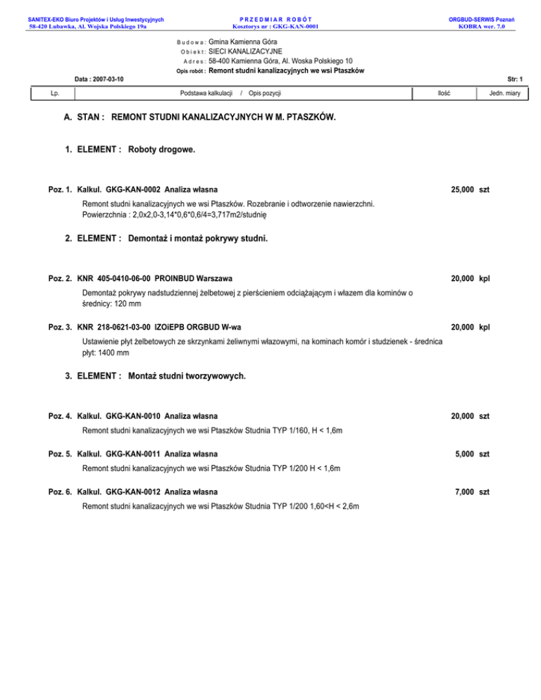 SANITEX-EKO Biuro Projektów i Usług Inwestycyjnych 58-420 Lubawka, Al. Wojska Polskiego 19a PRZEDMIAR ROBÓT Kosztorys nr : GKG-KAN-0001 Budowa: Obiekt: Adres: Opis robót : ORGBUD-SERWIS Poznań KOBRA wer. 7.0 Gmina Kamienna Góra SIECI KANALIZACYJNE 58-400 Kamienna Góra, Al. Woska Polskiego 10 Remont studni kanalizacyjnych we wsi Ptaszków Data : 2007-03-10 Lp. Str: 1 Podstawa kalkulacji / Opis pozycji Ilość Jedn. miary A. STAN : REMONT STUDNI KANALIZACYJNYCH W M. PTASZKÓW. 1. ELEMENT : Roboty drogowe. Poz. 1. Kalkul. GKG-KAN-0002 Analiza własna 25,000 szt Remont studni kanalizacyjnych we wsi Ptaszków. Rozebranie i odtworzenie nawierzchni. Powierzchnia : 2,0x2,0-3,14*0,6*0,6/4=3,717m2/studnię 2. ELEMENT : Demontaż i montaż pokrywy studni. Poz. 2. KNR 405-0410-06-00 PROINBUD Warszawa 20,000 kpl Demontaż pokrywy nadstudziennej żelbetowej z pierścieniem odciążającym i włazem dla kominów o średnicy: 120 mm Poz. 3. KNR 218-0621-03-00 IZOiEPB ORGBUD W-wa 20,000 kpl Ustawienie płyt żelbetowych ze skrzynkami żeliwnymi włazowymi, na kominach komór i studzienek - średnica płyt: 1400 mm 3. ELEMENT : Montaż studni tworzywowych. Poz. 4. Kalkul. GKG-KAN-0010 Analiza własna 20,000 szt Remont studni kanalizacyjnych we wsi Ptaszków Studnia TYP 1/160, H < 1,6m Poz. 5. Kalkul. GKG-KAN-0011 Analiza własna 5,000 szt Remont studni kanalizacyjnych we wsi Ptaszków Studnia TYP 1/200 H < 1,6m Poz. 6. Kalkul. GKG-KAN-0012 Analiza własna Remont studni kanalizacyjnych we wsi Ptaszków Studnia TYP 1/200 1,60<H < 2,6m 7,000 szt SANITEX-EKO Biuro Projektów i Usług Inwestycyjnych 58-420 Lubawka, Al. Wojska Polskiego 19a PRZEDMIAR ROBÓT Kosztorys nr : GKG-KAN-0001 Opis robót : STAN : ELEMENT : ORGBUD-SERWIS Poznań KOBRA wer. 7.0 Remont studni kanalizacyjnych we wsi Ptaszków A. REMONT STUDNI KANALIZACYJNYCH W M. PTASZKÓW. 3. Montaż studni tworzywowych. Data : 2007-03-10 Lp. Str: 2 Podstawa kalkulacji / Opis pozycji Poz. 7. Kalkul. GKG-KAN-0013 Analiza własna Ilość Jedn. miary 1,000 szt Remont studni kanalizacyjnych we wsi Ptaszków Studnia TYP 1/200 H > 2,6m Poz. 8. Kalkul. GKG-KAN-0014 Analiza własna 2,000 szt Remont studni kanalizacyjnych we wsi Ptaszków Studnia TYP 1/1-160, H < 1,6m Poz. 9. Kalkul. GKG-KAN-0015 Analiza własna 1,000 szt Remont studni kanalizacyjnych we wsi Ptaszków Studnia TYP 1/1-160, H > 2,6m Poz. 10. Kalkul. GKG-KAN-0016 Analiza własna 4,000 szt Remont studni kanalizacyjnych we wsi Ptaszków Studnia TYP 2L,2P/160, H < 1,6m Poz. 11. Kalkul. GKG-KAN-0017 Analiza własna 1,000 szt Remont studni kanalizacyjnych we wsi Ptaszków Studnia TYP 2L,2P/200 H < 1,6m Poz. 12. Kalkul. GKG-KAN-0018 Analiza własna 5,000 szt Remont studni kanalizacyjnych we wsi Ptaszków Studnia TYP 2L,2P/200 ; 1,6<H<2,6m Poz. 13. Kalkul. GKG-KAN-0019 Analiza własna 1,000 szt Remont studni kanalizacyjnych we wsi Ptaszków Studnia TYP 2L,2P/1-160, H < 1,6m Poz. 14. Kalkul. GKG-KAN-0020 Analiza własna 1,000 szt Remont studni kanalizacyjnych we wsi Ptaszków Studnia TYP 2L, 2P/1-160; 1,6<H<2,6m Poz. 15. Kalkul. GKG-KAN-0021 Analiza własna 13,000 szt Remont studni kanalizacyjnych we wsi Ptaszków Studnia TYP 2L,2P/1/200 ; 1,6<H<2,6m Poz. 16. Kalkul. GKG-KAN-0022 Analiza własna 2,000 szt Remont studni kanalizacyjnych we wsi Ptaszków Studnia TYP 2L,2P/1/200 ; H>2,6m Poz. 17. Kalkul. GKG-KAN-0023 Analiza własna Remont studni kanalizacyjnych we wsi Ptaszków Studnia TYP 2L,2P/2/200 ; H<1,6m 1,000 szt SANITEX-EKO Biuro Projektów i Usług Inwestycyjnych 58-420 Lubawka, Al. Wojska Polskiego 19a PRZEDMIAR ROBÓT Kosztorys nr : GKG-KAN-0001 Opis robót : STAN : ELEMENT : ORGBUD-SERWIS Poznań KOBRA wer. 7.0 Remont studni kanalizacyjnych we wsi Ptaszków A. REMONT STUDNI KANALIZACYJNYCH W M. PTASZKÓW. 3. Montaż studni tworzywowych. Data : 2007-03-10 Str: 3 Lp. Podstawa kalkulacji / Opis pozycji Ilość Poz. 18. Kalkul. GKG-KAN-0024 Analiza własna Jedn. miary 3,000 szt Remont studni kanalizacyjnych we wsi Ptaszków Studnia TYP 2L,2P/2/200 ; 1,6<H<2,6m Poz. 19. Kalkul. GKG-KAN-0025 Analiza własna 1,000 szt Remont studni kanalizacyjnych we wsi Ptaszków Studnia TYP 2L, 2P/2-160, H < 1,6m Poz. 20. Kalkul. GKG-KAN-0026 Analiza własna 1,000 szt Remont studni kanalizacyjnych we wsi Ptaszków Studnia TYP 3/160, H < 1,6m Poz. 21. Kalkul. GKG-KAN-0027 Analiza własna 2,000 szt Remont studni kanalizacyjnych we wsi Ptaszków Studnia TYP 3/2/200 ; 1,6<H<2,6m Poz. 22. Kalkul. GKG-KAN-0028 Analiza własna 2,000 szt Remont studni kanalizacyjnych we wsi Ptaszków Studnia TYP 3/2/200 ; H>2,6m Poz. 23. Kalkul. GKG-KAN-0029 Analiza własna 4,000 szt Remont studni kanalizacyjnych we wsi Ptaszków Studnia TYP 3/3/200 ; 1,6<H<2,6m Poz. 24. Kalkul. GKG-KAN-0030 Analiza własna 1,000 Remont studni kanalizacyjnych we wsi Ptaszków Remont studni betonowej Nr 1. Poz. 25. KNR 401-0108-19-00 IGM Warszawa 49,000 m3 Wywiezienie gruzu samochodami samowyładowczymi na odległość do 1 km, z załadowaniem i wyładowaniem - z rozbieranych konstrukcji: żwirobetonowych i żelbetowych Opis pozycji obmiaru Wyrażenie arytmetyczne Poz. 26. KNR 401-0108-20-00 IGM Warszawa Dodatek do wywozu gruzu samochodami samowyładowczymi, za każdy 1 km powyżej pierwszego,bez względu na rodzaj konstrukcji Wynik 77*3,717*0,08+77*0,339 = 49,000 Razem obmiar = 49,000 49,000 m3 SANITEX-EKO Biuro Projektów i Usług Inwestycyjnych 58-420 Lubawka, Al. Wojska Polskiego 19a PRZEDMIAR ROBÓT Kosztorys nr : GKG-KAN-0001 Opis robót : STAN : ELEMENT : ORGBUD-SERWIS Poznań KOBRA wer. 7.0 Remont studni kanalizacyjnych we wsi Ptaszków A. REMONT STUDNI KANALIZACYJNYCH W M. PTASZKÓW. 3. Montaż studni tworzywowych. Data : 2007-03-10 Lp. Str: 4 Podstawa kalkulacji / Opis pozycji Poz. 27. Analiza własna Ilość Jedn. miary 77,000 kpl Zamnięcie i otwarcie dopływu, płukanie studni, pompwanie ścieków. --- Koniec wydruku przedmiaru ---
