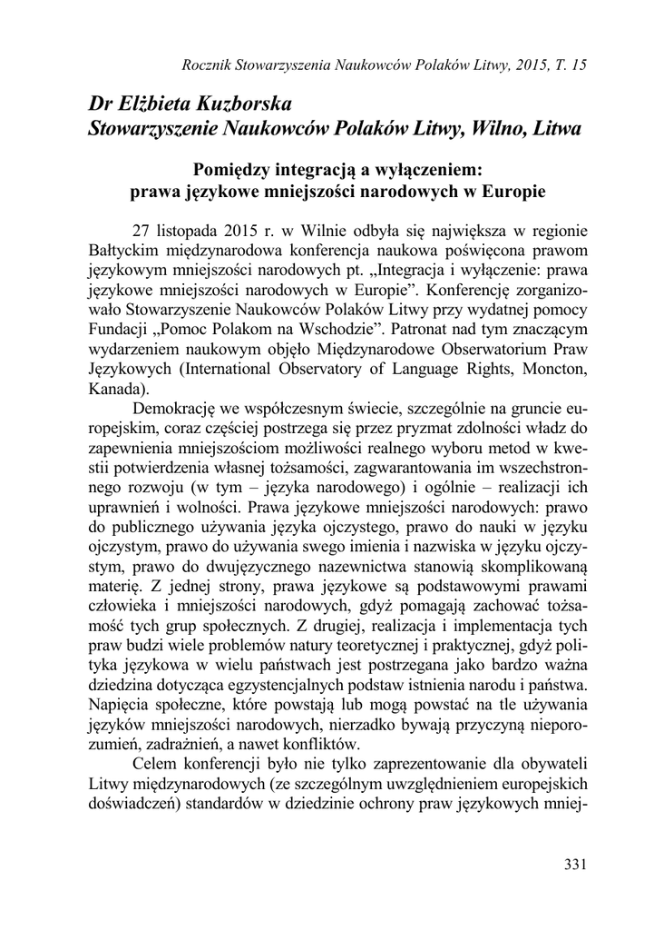 Rocznik Stowarzyszenia Naukowców Polaków Litwy, 2015, T. 15 Dr Elżbieta Kuzborska Stowarzyszenie Naukowców Polaków Litwy, Wilno, Litwa Pomiędzy integracją a wyłączeniem: prawa językowe mniejszości narodowych w Europie 27 listopada 2015 r. w Wilnie odbyła się największa w regionie Bałtyckim międzynarodowa konferencja naukowa poświęcona prawom językowym mniejszości narodowych pt. „Integracja i wyłączenie: prawa językowe mniejszości narodowych w Europie”. Konferencję zorganizowało Stowarzyszenie Naukowców Polaków Litwy przy wydatnej pomocy Fundacji „Pomoc Polakom na Wschodzie”. Patronat nad tym znaczącym wydarzeniem naukowym objęło Międzynarodowe Obserwatorium Praw Językowych (International Observatory of Language Rights, Moncton, Kanada). Demokrację we współczesnym świecie, szczególnie na gruncie europejskim, coraz częściej postrzega się przez pryzmat zdolności władz do zapewnienia mniejszościom możliwości realnego wyboru metod w kwestii potwierdzenia własnej tożsamości, zagwarantowania im wszechstronnego rozwoju (w tym – języka narodowego) i ogólnie – realizacji ich uprawnień i wolności. Prawa językowe mniejszości narodowych: prawo do publicznego używania języka ojczystego, prawo do nauki w języku ojczystym, prawo do używania swego imienia i nazwiska w języku ojczystym, prawo do dwujęzycznego nazewnictwa stanowią skomplikowaną materię. Z jednej strony, prawa językowe są podstawowymi prawami człowieka i mniejszości narodowych, gdyż pomagają zachować tożsamość tych grup społecznych. Z drugiej, realizacja i implementacja tych praw budzi wiele problemów natury teoretycznej i praktycznej, gdyż polityka językowa w wielu państwach jest postrzegana jako bardzo ważna dziedzina dotycząca egzystencjalnych podstaw istnienia narodu i państwa. Napięcia społeczne, które powstają lub mogą powstać na tle używania języków mniejszości narodowych, nierzadko bywają przyczyną nieporozumień, zadrażnień, a nawet konfliktów. Celem konferencji było nie tylko zaprezentowanie dla obywateli Litwy międzynarodowych (ze szczególnym uwzględnieniem europejskich doświadczeń) standardów w dziedzinie ochrony praw językowych mniej- 331 Komunikaty Fot. 1. Migawki z konferencji. Przed rozpoczęciem obrad. Od lewej: Konsul Generalny RP na Litwie Stanisław Cygnarowski, Prezes Fundacji „Pomoc Polakom na Wschodzie” Ambasador Janusz Skolimowski, sekretarz naukowy SNPL dr Elżbieta Kuzborska, wicedyrektor Departamentu Współpracy z Polonią i Polakami za Granicą MSZ RP Wojciech Tyciński Fot. M. Paluszkiewicz. Fot. 2. Migawki z konferencji. Sala obrad Fot. M. Paluszkiewicz. 332 Rocznik Stowarzyszenia Naukowców Polaków Litwy, 2015, T. 15 Fot. 3. Migawki z konferencji. Moderatorzy konferencji, od lewej: prof. Lauri Hannikainen, dr Fernand de Varennes, Belen Rodriguez de Alba, dr Elżbieta Kuzborska Fot. M. Paluszkiewicz. Fot. 4. Migawki z konferencji. Prezes SNPL prof. dr Henryk Malewski Fot. M. Paluszkiewicz. 333 Komunikaty szości narodowych, lecz również przedstawienie doświadczenia i praktyki poszczególnych państw, szczególnie, europejskich. W jaki sposób zagwarantować realizację praw językowych mniejszości narodowych przy jednoczesnym poszanowaniu języka państwowego? Jak kontrolować wynikłe na tym tle napięcia? Jak, zgodnie z międzynarodowymi standardami, powinna wyglądać polityka państwowa w tej dziedzinie? Co jest ważniejsze – ochrona praw językowych mniejszości czy języka państwowego? Na te i wiele innych pytań spróbowali odpowiedzieć wybitni europejscy i światowi eksperci oraz naukowcy. Na konferencję przybyli nie tylko specjaliści: politycy, prawnicy, urzędnicy zajmujący się tematyką praw mniejszości, ale też studenci oraz naukowcy interesujący się prawami mniejszości i polityką państwa w tej dziedzinie. Wśród zaproszonych gości byli parlamentarzyści litewscy z ramienia Akcji Wyborczej Polaków na Litwie: wicemarszałek Sejmu Republiki Litewskiej Jarosław Narkiewicz i Józef Kwiatkowski, a także urzędnicy i przedstawiciele instytucji pozarządowych. Konferencję swoją obecnością zaszczycili Prezes Fundacji „Pomoc Polakom na Wschodzie” Janusz Skolimowski, wicedyrektor Departamentu Współpracy z Polonią i Polakami za Granicą Wojciech Tyciński, dyrektor Wydawnictwa Sejmowego Tomasz Glanz, Konsul Generalny Rzeczypospolitej Polskiej w Wilnie Stanisław Cygnarowski i inne osoby. Konferencję otworzyli dr Elżbieta Kuzborska i prezes SNPL prof. dr Henryk Malewski. Uczestników i gości powitała też Dyrektor Departamentu Mniejszości Narodowych przy Radzie Ministrów Republiki Litewskiej dr Vida Montvidaitė. Z pozdrowieniami i życzeniami owocnych obrad wystąpiła Prezes Rady Wspólnot Narodowych Litwy doc. dr Galina Miškinienė. Merytoryczną część konferencji rozpoczęła Belen Rodriguez de Alba, reprezentująca Wysokiego Komisarza Narodów Zjednoczonych do spraw Praw Człowieka (Indigenous Peoples and Minorities Section of Office of the High Commissioner for Human Rights). Referaty wygłosili: światowej sławy ekspert ds. praw językowych, dziekan Wydziału Prawa Uniwersytetu w Moncton, Kanada, dr Fernand de Varennes; wieloletni członek Europejskiej Komisji Przeciwko Rasizmowi i Nietolerancji (ECRI) prof. Lauri Hannikainen z Uniwersytetu w Helsinkach, Finlandia; pracownicy centrum naukowego European Centre for Minority Issues (ECMI), Flensburg, Niemcy: dr Eva Chylinsky, dr Hanna Vasilevich; przedstawiciel centrum naukowego Institute for Minority Rights of the 334 Rocznik Stowarzyszenia Naukowców Polaków Litwy, 2015, T. 15 Fot. 5. Książka konferencyjna „Integracja i wyłączenie: prawa językowe mniejszości narodowych w Europie” pod red. Elżbiety Kuzborskiej, wydana w języku angielskim Źródło: archiwum własne. European Academy (EURAC) w Bolzano/Bozen, Włochy, Sergiu Constantin; poseł na Sejm Łotwy oraz członek Zgromad