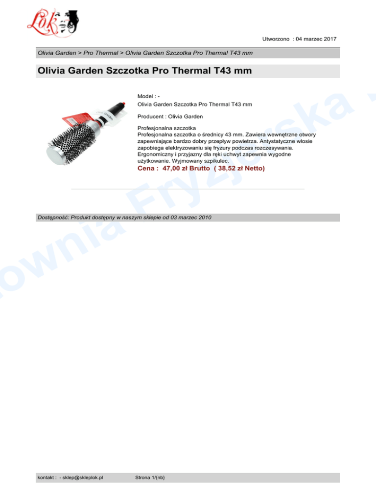 Utworzono : 04 marzec 2017 Olivia Garden > Pro Thermal > Olivia Garden Szczotka Pro Thermal T43 mm L a Olivia Garden Szczotka Pro Thermal T43 mm Model : - k s r Olivia Garden Szczotka Pro Thermal T43 mm Producent : Olivia Garden Profesjonalna szczotka Profesjonalna szczotka o średnicy 43 mm. Zawiera wewnętrzne otwory zapewniające bardzo dobry przepływ powietrza. Antystatyczne włosie zapobiega elektryzowaniu się fryzury podczas rozczesywania. Ergonomiczny i przyjazny dla ręki uchwyt zapewnia wygodne użytkowanie. Wyjmowany szpikulec. e j z y r F Cena : 47,00 zł Brutto ( 38,52 zł Netto) a i n w to Dostępność: Produkt dostępny w naszym sklepie od 03 marzec 2010 kontakt : - [email protected] Strona 1/{nb}