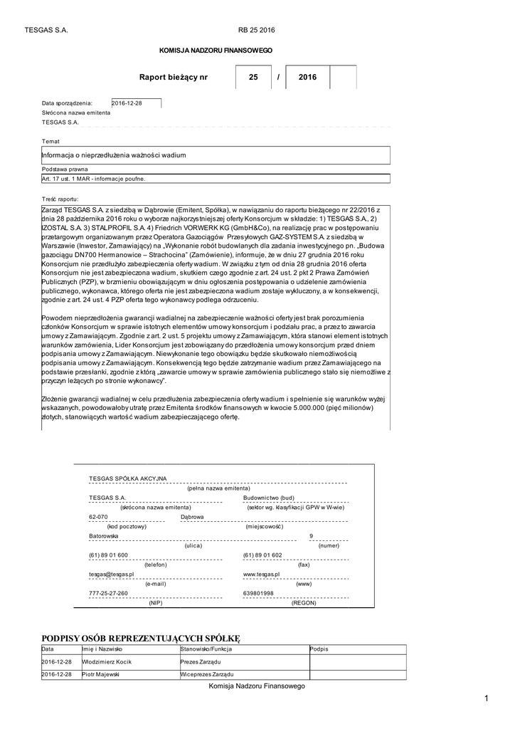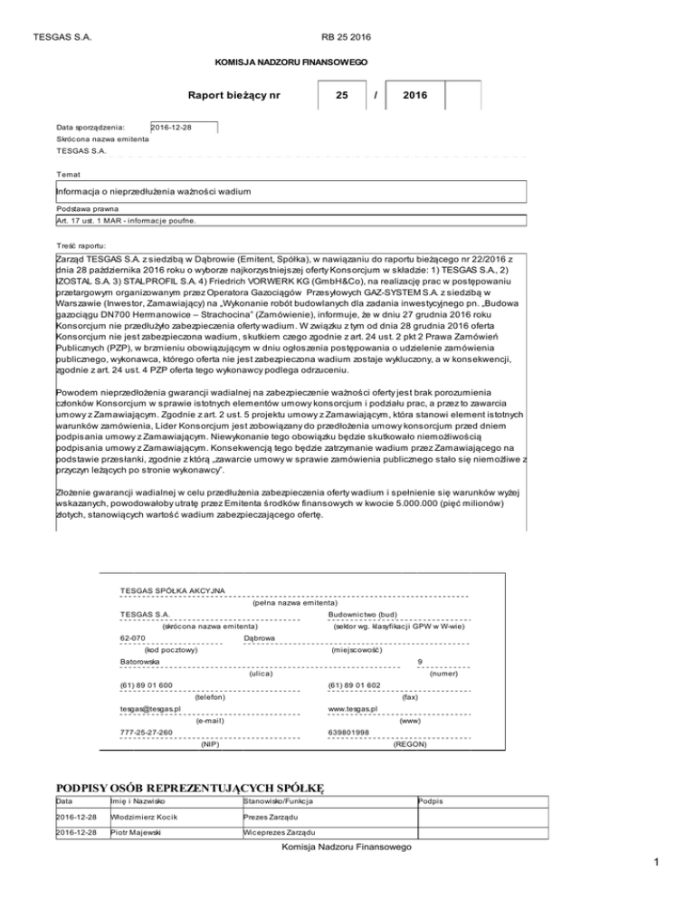 TESGAS S.A. RB 25 2016 KOMISJA NADZORU FINANSOWEGO Raport bieżący nr 25 / 2016 2016-12-28 Data sporządzenia: Skróc ona nazwa emitenta TESGAS S.A. Temat Informacja o nieprzedłużenia ważności wadium Podstawa prawna Art. 17 ust. 1 MAR - informac je poufne. Treść raportu: Zarząd TESGAS S.A. z siedzibą w Dąbrowie (Emitent, Spółka), w nawiązaniu do raportu bieżącego nr 22/2016 z dnia 28 października 2016 roku o wyborze najkorzystniejszej oferty Konsorcjum w składzie: 1) TESGAS S.A., 2) IZOSTAL S.A. 3) STALPROFIL S.A. 4) Friedrich VORWERK KG (GmbH&Co), na realizację prac w postępowaniu przetargowym organizowanym przez Operatora Gazociągów Przesyłowych GAZ-SYSTEM S.A. z siedzibą w Warszawie (Inwestor, Zamawiający) na „Wykonanie robót budowlanych dla zadania inwestycyjnego pn. „Budowa gazociągu DN700 Hermanowice – Strachocina” (Zamówienie), informuje, że w dniu 27 grudnia 2016 roku Konsorcjum nie przedłużyło zabezpieczenia oferty wadium. W związku z tym od dnia 28 grudnia 2016 oferta Konsorcjum nie jest zabezpieczona wadium, skutkiem czego zgodnie z art. 24 ust. 2 pkt 2 Prawa Zamówień Publicznych (PZP), w brzmieniu obowiązującym w dniu ogłoszenia postępowania o udzielenie zamówienia publicznego, wykonawca, którego oferta nie jest zabezpieczona wadium zostaje wykluczony, a w konsekwencji, zgodnie z art. 24 ust. 4 PZP oferta tego wykonawcy podlega odrzuceniu. Powodem nieprzedłożenia gwarancji wadialnej na zabezpieczenie ważności oferty jest brak porozumienia członków Konsorcjum w sprawie istotnych elementów umowy konsorcjum i podziału prac, a przez to zawarcia umowy z Zamawiającym. Zgodnie z art. 2 ust. 5 projektu umowy z Zamawiającym, która stanowi element istotnych warunków zamówienia, Lider Konsorcjum jest zobowiązany do przedłożenia umowy konsorcjum przed dniem podpisania umowy z Zamawiającym. Niewykonanie tego obowiązku będzie skutkowało niemożliwością podpisania umowy z Zamawiającym. Konsekwencją tego będzie zatrzymanie wadium przez Zamawiającego na podstawie przesłanki, zgodnie z którą „zawarcie umowy w sprawie zamówienia publicznego stało się niemożliwe z przyczyn leżących po stronie wykonawcy”. Złożenie gwarancji wadialnej w celu przedłużenia zabezpieczenia oferty wadium i spełnienie się warunków wyżej wskazanych, powodowałoby utratę przez Emitenta środków finansowych w kwocie 5.000.000 (pięć milionów) złotych, stanowiących wartość wadium zabezpieczającego ofertę. TESGAS SPÓŁKA AKCYJNA (pełna nazwa emitenta) TESGAS S.A. Budownic two (bud) (skróc ona nazwa emitenta) 62-070 (sektor wg. klasyfikac ji GPW w W-wie) Dąbrowa (kod poc ztowy) (miejscowość) Batorowska 9 (ulica) (numer) (61) 89 01 600 (61) 89 01 602 (telefon) (fax) [email protected] www.tesgas.pl (e-mail) (www) 777-25-27-260 639801998 (NIP) (REGON) PODPISY OSÓB REPREZENTUJĄCYCH SPÓŁKĘ Data Imię i Nazwisko Stanowisko/Funkc ja 2016-12-28 Włodzimierz Kocik Prezes Zarządu 2016-12-28 Piotr Majewski Wic eprezes Zarządu Podpis Komisja Nadzoru Finansowego 1 TESGAS S.A. RB 25 2016 Komisja Nadzoru Finansowego 2