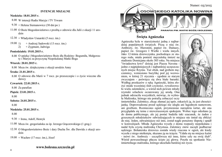 Numer: 03/2015 INTENCJE MSZALNE Niedziela: 18.01.2015 r. 8.00 W intencji Radia Maryja i TV Trwam 9.30 + Helena Siemanowicz (30 dni po ) 11.00 O Boże błogosławieństwo z prośbą o zdrowie dla Julii z okazji 11 urodzin 12.30 + Władysław Usnarski (5 rocz. śm.) 19.00 1) 2) + Andrzej Sadowski (13 rocz. śm.) + Zygmunt, Jadwiga Poniedziałek: 19.01.2015 r. 8.00 O opiekę i błogosławieństwo Boże dla Rodziny: Bogumiła, Małgorzaty i Marysi za przyczyną Niepokalanej Matki Boga Wtorek: 20.01.2015 r. 8.00 Msza św. dziękczynna z okazji urodzin Anny Środa: 21.01.2015 r. 8.00 O zdrowie dla Marii w 7 rocz. po przeszczepie i o życie wieczne dla dawcy Czwartek: 22.01.2015 r. 8.00 Za parafian Piątek: 23.01.2015 r. 8.00 Sobota: 24.01.2015 r. 8.00 Niedziela: 25.01.2015 r. 8.00 9.30 + Irena, Adolf, Henryk 11.00 Msza św. gregoriańska za śp. Jerzego Grączewskiego (1 greg.) 12.30 O błogosławieństwo Boże i dary Ducha Św. dla Dawida z okazji urodzin 19.00 + Wacław (17 rocz. śm.), Józef 4 www.bolesna.szczecin.pl Święta Agnieszka Agnieszka była w starożytności jedną z najbardziej popularnych świętych. Piszą o niej św. Ambroży, św. Hieronim, papież św. Damazy, papież św. Grzegorz I Wielki i wielu innych. Jako 12-letnia dziewczynka, pochodząca ze starego rodu, miała ponieść męczeńską śmierć na stadionie Domicjana około 305 roku. Na miejscu "świadectwa krwi" dzisiaj jest Piazza Navona jedno z najpiękniejszych i najbardziej uczęszczanych miejsc Rzymu. Tuż obok, nad grobem męczennicy, wzniesiono bazylikę pod jej wezwaniem, w której 21 stycznia - zgodnie ze starym zwyczajem - poświęca się dwa białe baranki. Według przekazów o rękę Agnieszki, która złożyć miała wcześniej ślub czystości, rywalizowało wielu zalotników, a wśród nich pewien młody rzymski szlachcic oczarowany jej urodą. Ona jednak odrzuciła wszystkich, mówiąc, że wybrała Małżonka, którego nie potrafią zobaczyć oczy śmiertelnika. Zalotnicy, chcąc złamać jej upór, oskarżyli ją, że jest chrześcijanką. Doprowadzona przed sędziego nie uległa ani łagodnym namowom, ani groźbom. Rozniecono ogień, przyniesiono narzędzia tortur, ale ona przyglądała się temu z niewzruszonym spokojem. Wobec tego odesłano ją do domu publicznego, ale jej postać budziła taki szacunek, że żaden z grzesznych młodzieńców odwiedzających to miejsce nie śmiał się zbliżyć do niej. Jeden, odważniejszy niż inni, został nagle porażony ślepotą i upadł w konwulsjach. Młoda Agnieszka wyszła z domu rozpusty niepokalana i nadal była czystą małżonką Chrystusa. Zalotnicy znów zaczęli podburzać sędziego. Bohaterska dziewica została wtedy rzucona w ogień, ale kiedy wyszła z niego nietknięta, skazano ją na ścięcie. "Udała się na miejsce kaźni - mówi św. Ambroży - szczęśliwsza niż inne, które szły na swój ślub". Wśród powszechnego płaczu ścięto jej głowę. Poszła na spotkanie Nieśmiertelnego małżonka, którego ukochała bardziej niż życie. 1 Liturgia słowa – II niedziela zwykła I czytanie (1 Sm 3,3b-10.19) Samuel spał w przybytku Pańskim, gdzie znajdowała się Arka Przymierza. Wtedy Pan zawołał Samuela, a ten odpowiedział: Oto jestem. Potem pobiegł do Helego mówiąc mu: Oto jestem: przecież mię wołałeś. Heli odrzekł: Nie wołałem cię, wróć i połóż się spać. Położył się zatem spać. Lecz Pan powtórzył wołanie: Samuelu! Wstał Samuel i poszedł do Helego mówiąc: Oto jestem: przecież mię wołałeś. Odrzekł mu: Nie wołałem cię, synu. Wróć i połóż się spać. Samuel bowiem jeszcze nie znał Pana, a słowo Pańskie nie było mu jeszcze objawione. I znów Pan powtórzył po raz trzeci swe wołanie: Samuelu! Wstał więc i poszedł do Helego, mówiąc: Oto jestem: przecież mię wołałeś. Heli spostrzegł się, że to Pan woła chłopca. Rzekł więc Heli do Samuela: Idź spać! Gdyby jednak kto cię wołał, odpowiedz: Mów, Panie, bo sługa Twój słucha. Odszedł Samuel, położył się spać na swoim miejscu. Przybył Pan i stanąwszy zawołał jak poprzednim razem: Samuelu, Samuelu! Samuel odpowiedział: Mów, bo sługa Twój słucha. Samuel dorastał, a Pan był z nim. Nie pozwolił upaść żadnemu jego słowu na ziemię. II czytanie (1 Kor 6,13c-15a.17-20) Ciało nie jest dla rozpusty, lecz dla Pana, a Pan dla ciała. Bóg zaś i Pana wskrzesił i nas również swą mocą wskrzesi z martwych. Czyż nie wiecie, że ciała wasze są członkami Chrystusa? Czyż wziąwszy członki Chrystusa będę je czynił członkami nierządnicy? Przenigdy! Ten zaś, kto się łączy z Panem, jest z Nim jednym duchem. Strzeżcie się rozpusty; wszelki grzech popełniony przez człowieka jest na zewnątrz ciała; kto zaś grzeszy rozpustą, przeciwko własnemu ciału grzeszy. Czyż nie wiecie, że ciało wasze jest świątynią Ducha Świętego, który w was jest, a którego macie od Boga, i że już nie należycie do samych siebie? Za /wielką/ bowiem cenę zostaliście nabyci. Chwalcie więc Boga w waszym ciele! Ewangelia (J 1,35-42) Jan stał z dwoma swoimi uczniami i gdy zobaczył przechodzącego Jezusa, rzekł: Oto Baranek Boży. Dwaj uczniowie usłyszeli, jak mówił, i poszli za Jezusem. Jezus zaś odwróciwszy się i ujrzawszy, że oni idą za Nim, rzekł do nich: Czego szukacie? Oni powiedzieli do Niego: Rabbi! - to znaczy: Nauczycielu - gdzie mieszkasz? Odpowiedział im: Chodźcie, a zobaczycie. Poszli więc i zobaczyli, gdzie mieszka, i tego dnia pozostali u Niego. Było to około godziny dziesiątej. Jednym z dwóch, którzy to usłyszeli od Jana i poszli za Nim, był Andrzej, brat Szymona Piotra. Ten spotkał najpierw swego brata i rzekł do niego: Znaleźliśmy Mesjasza - to znaczy: Chrystusa. I przyprowadził go do Jezusa. A Jezus wejrzawszy na niego rzekł: Ty jesteś Szymon, syn Jana, ty będziesz nazywał się Kefas - to znaczy: Piotr. 2 Ogłoszenia duszpasterskie - 18.01.2015 r. 1. Rozpo
