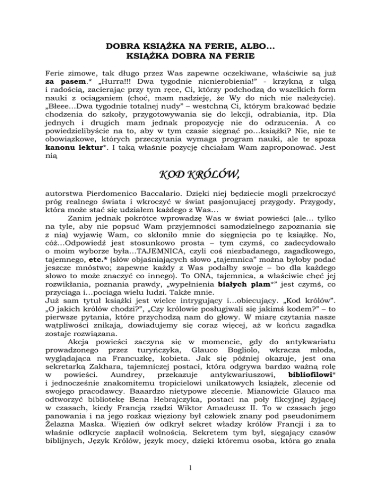 DOBRA KSIĄŻKA NA FERIE, ALBO… KSIĄŻKA DOBRA NA FERIE Ferie zimowe, tak długo przez Was zapewne oczekiwane, właściwie są już za pasem.* „Hurra!!! Dwa tygodnie nicnierobienia!” - krzykną z ulgą i radością, zacierając przy tym ręce, Ci, którzy podchodzą do wszelkich form nauki z ociąganiem (choć, mam nadzieję, że Wy do nich nie należycie). „Błeee…Dwa tygodnie totalnej nudy” – westchną Ci, którym brakować będzie chodzenia do szkoły, przygotowywania się do lekcji, odrabiania, itp. Dla jednych i drugich mam jednak propozycję nie do odrzucenia. A co powiedzielibyście na to, aby w tym czasie sięgnąć po…książki? Nie, nie te obowiązkowe, których przeczytania wymaga program nauki, ale te spoza kanonu lektur*. I taką właśnie pozycję chciałam Wam zaproponować. Jest nią KOD KRÓLÓW, KRÓLÓW, autorstwa Pierdomenico Baccalario. Dzięki niej będziecie mogli przekroczyć próg realnego świata i wkroczyć w świat pasjonującej przygody. Przygody, która może stać się udziałem każdego z Was… Zanim jednak pokrótce wprowadzę Was w świat powieści (ale… tylko na tyle, aby nie popsuć Wam przyjemności samodzielnego zapoznania się z nią) wyjawię Wam, co skłoniło mnie do sięgnięcia po tę książkę. No, cóż…Odpowiedź jest stosunkowo prosta – tym czymś, co zadecydowało o moim wyborze była…TAJEMNICA, czyli coś niezbadanego, zagadkowego, tajemnego, etc.* (słów objaśniających słowo „tajemnica” można byłoby podać jeszcze mnóstwo; zapewne każdy z Was podałby swoje – bo dla każdego słowo to może znaczyć co innego). To ONA, tajemnica, a właściwie chęć jej rozwikłania, poznania prawdy, „wypełnienia białych plam*” jest czymś, co przyciąga i…pociąga wielu ludzi. Także mnie. Już sam tytuł książki jest wielce intrygujący i…obiecujący. „Kod królów”. „O jakich królów chodzi?”, „Czy królowie posługiwali się jakimś kodem?” – to pierwsze pytania, które przychodzą nam do głowy. W miarę czytania nasze wątpliwości znikają, dowiadujemy się coraz więcej, aż w końcu zagadka zostaje rozwiązana. Akcja powieści zaczyna się w momencie, gdy do antykwariatu prowadzonego przez turyńczyka, Glauco Bogliolo, wkracza młoda, wyglądająca na Francuzkę, kobieta. Jak się później okazuje, jest ona sekretarką Zakhara, tajemniczej postaci, która odgrywa bardzo ważną rolę w powieści. Aundrey, przekazuje antykwariuszowi, bibliofilowi* i jednocześnie znakomitemu tropicielowi unikatowych książek, zlecenie od swojego pracodawcy. Baaardzo nietypowe zlecenie. Mianowicie Glauco ma odtworzyć bibliotekę Bena Hebrajczyka, postaci na poły fikcyjnej żyjącej w czasach, kiedy Francją rządzi Wiktor Amadeusz II. To w czasach jego panowania i na jego rozkaz więziony był człowiek znany pod pseudonimem Żelazna Maska. Więzień ów odkrył sekret władzy królów Francji i za to właśnie odkrycie zapłacił wolnością. Sekretem tym był, sięgający czasów biblijnych, Język Królów, język mocy, dzięki któremu osoba, która go znała 1 mogła panować nad innymi, gdyż wypowiadane w tym języku słowa przemawiały bezpośrednio do ludzkiej duszy. Sam Dante nazwał go, znacznie później, językiem diabła, gdyż wpływał na ludzką duszę... To od Żelaznej Maski Ben Hebrajczyk vel* Ben Laqudem dowiaduje się o istnieniu języka. Nie zatrzymuje jednak tej cennej informacji dla siebie, ale przekazuje królowi, który zleca mu odszukanie ksiąg zawierających ten wszechmocny język i sporządzenie słownika zaginionej mowy. W tym celu Ben podróżuje po całym świecie. Po długich poszukiwaniach udaje mu się, w jakimś zakresie, poznać mowę. Jednak im większą ma wiedzę na jej temat, tym groźniejszą ona mu się wydaje. Postanawia więc całą wiedzę o niej ukryć. Tworzy Kod Królów, który szyfruje język w 259 pozycjach książkowych. Sam po jakimś czasie zapada jednak na chorobę psychiczną, a jego bibliotekę, a także katalog, który służy do odczytania mowy strzeże, powołany przez króla a istniejący po dzień dzisiejszy, Zakon Kawalerów Obola. Stowarzyszenie ma za zadanie zapobiec wydostaniu się na światło dzienne wiedzy o tajemnej mowie, która w niepowołanych rękach mogłaby stać się potężną i niszczycielską bronią. Gdy jeden członek odchodzi z Zakonu (umiera lub ginie), wybierany jest kolejny, zaufany jego następca. Jednak, jak to się czasami zdarza, i wśród tych „wybrańców”, ludzi wydawałoby się szlachetnych i honorowych, znajdzie się „czarna owca”, człowiek, który zechce poznać język i użyć go w celu zdobycia nieograniczonej władzy… Czy zleceniodawca Glauco był tylko zwykłym bibliofilem, starającym się skompletować unikatowy księgozbiór Bena Hebrajczyka, czy może właśnie taką czarną owcą pragnącą go posiąść, bo znał sekret królów? Czy Glauco wraz ze swoją czternastoletnią siostrzenicą idąc tropem książek nie wkroczy na ścieżkę, która może zagrozić życiu obojga? Kto pomaga im w poszukiwaniach? Czy wreszcie uda im się dokonać tego, czego nie potrafiło wielu przed nimi (też: Zakharowi) – odnaleźć książki i rozwiązać zagadkę? Mogłabym już teraz zdradzić Wam odpowiedzi na te pytania (i może jeszcze na wiele więcej), ale wyjawiając je, pozbawiłabym Was tym samym przyjemności samodzielnego „dotarcia do informacji”. A przecież tylko samodzielne zdobywanie wiedzy gwarantuje doskonałą rozrywkę… Jest coś jeszcze, co zachwyciło mnie w książce Pierdomenico Baccalario. Jesteście ciekawi, co to takiego? To, widoczne od jej pierwszych wersów, uwielbienie książek przez tego autora. Ze swobodą porusza się on po cudownym świecie starych woluminów. Dzięki niemu poznajemy nie tylko ważne postaci związane z tym światem, sławnych autorów, bibliofilów, którzy całe swoje życie poświęcali na powiększanie cennych księgozbiorów, wyda