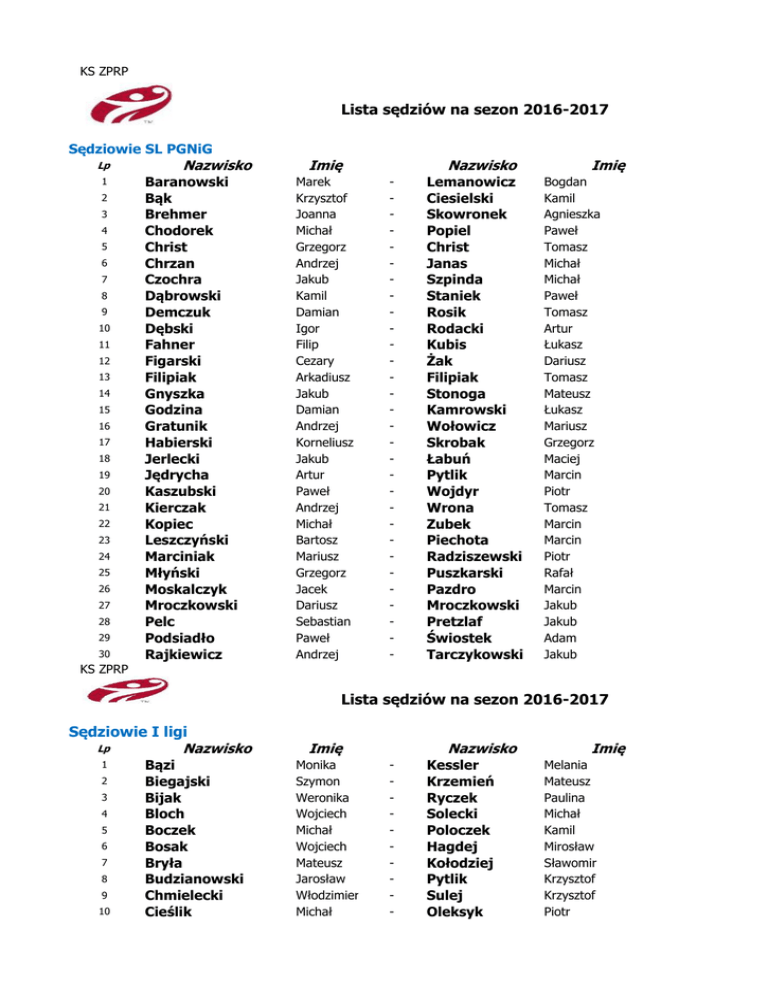 Sędziowie I ligi Lista sędziów na sezon 2016