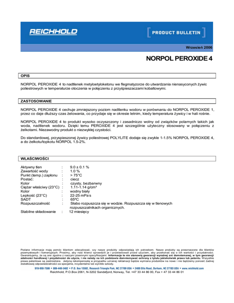 Wrzesień 2006 NORPOL PEROXIDE 4 OPIS NORPOL PEROXIDE 4 to nadtlenek metyloetyloketonu we flegmatyzorze do utwardzania nienasyconych żywic poliestrowych w temperaturze otoczenia w połączeniu z przyśpieszaczami kobaltowymi. ZASTOSOWANIE NORPOL PEROXIDE 4 cechuje zmniejszony poziom nadtlenku wodoru w porównaniu do NORPOL PEROXIDE 1, przez co daje dłuższy czas żelowania, co przydaje się w okresie letnim, kiedy temperatura żywicy i w hali rośnie. NORPOL PEROXIDE 4 to produkt wysoko oczyszczony i zasadniczo wolny od związków polarnych takich jak woda, nadtlenek wodoru. Dzięki temu PEROXIDE 4 jest szczególnie użyteczny stosowany w połączeniu z żelkotami. Niezawodny produkt o niezwykłej czystości. Do standardowej, przyspieszonej żywicy poliestrowej POLYLITE dodaje się zwykle 1-1.5% NORPOL PEROXIDE 4, a do żelkotu/topkotu NORPOL 1.5-2%. WŁAŚCIWOŚCI Aktywny tlen Zawartość wody Punkt (temp.) zapłonu Postać: Kolor Ciężar właściwy (23°C) Kolor Lepkość (23°C) SADT Rozpuszczalność : : : : : : : : : : Stabilne składowanie : 9.0 ± 0.1 % 1.0 % > 75°C ciecz czysty, bezbarwny 1.11-1.14 g/cm³ wodny biały . 22-25 mPa s 65ºC Słabo rozpuszcza się w wodzie. Rozpuszcza się w tlenowych rozpuszczalnikach organicznych. 12 miesięcy Podane informacje mają pomóc klientom zdecydować, czy nasze produkty odpowiadają ich potrzebom. Nasze produkty są przeznaczone dla klientów przemysłowych i komercyjnych. Prosimy, aby nasi klienci sprawdzili je i przetestowali przed użyciem, aby przekonać się o ich wartości i przydatności. Gwarantujemy, że są one zgodne z naszymi pisemnymi specyfikacjami. Informacje te nie stanowią gwarancji wyraźnej ani domniemanej, w tym gwarancji zdatności handlowej i przydatności do użycia, i nie należy na ich podstawie domniemywać ochrony z tytułu jakiekolwiek prawa lub patentu. Wszystkie prawa patentowe są zastrzeżone. Jedyną rekompensatą w przypadku uznanej reklamacji będzie wymiana produktów na nowe i nie będziemy ponosić żadnej dodatkowej odpowiedzialności za specjalne, incydentalne lub wynikłe szkody. Reichhold, P.O.Box 2061, N-3202 Sandefjord, Norway, Tel. +47 33 44 86 00, Fax + 47 33 44 86 01 OPAKOWANIE Standardowe opakowania to 5kg i 25kg netto. UTWARDZANIE Żywica: : POLYLITE 440-000 Temp. żywicy: Przyśpieszacz: : 1% ACCELERATOR 9802P PEROXIDE : 1% Inicjator NORPOL PEROXIDE 4 NORPOL PEROXIDE 1 Czas żelowania [min] 20 11 Czas do piku [min] 62 48 21ºC Pik egzotermiczny [min] 47 47 Test utwardzania z żelkotem dał następujące rezultaty: Metoda: Cienka błona (500um, na mokro) Temperatura: 23°C Żelkot: Niewielka ilość lotnych związków organicznych, ISO-NPG biały żelkot natryskiwany TTC: czas do wyschnięcia Inicjator %: 2,0 Inicjator NORPOL PEROXIDE 4 NORPOL PEROXIDE 1 Czas żel.[min] 31 19 NORPOL PEROXIDE 4 2 TTC [min] 110 113 PRZECHOWYWANIE • • • • Przechowywać w temperaturze nie wyższej niż 25°C. Przechowywanie w temperaturze poniżej 20°C pozwala maksymalnie wydłużyć czas przydatności do użycia produktu. Przechowywać w oryginalnych pojemnikach z dala od materiałów łatwopalnych i źródeł ciepła, iskier i płomieni; nie wystawiać na bezpośrednie działanie słońca; trzymać z dala od przyśpieszaczy, promotorów, środków redukujących oraz silnych kwasów i zasad. Przeciekający pojemnik – Usunąć i zabezpieczyć w bezpiecznym miejscu. Produkt natychmiast przepakować lub usunąć (patrz dalej). Nigdy nie przechowywać w lodówkach zawierających jedzenie i/lub napoje. UŻYCIE • • • • • • • Poinformować pracowników, jak bezpiecznie obchodzić się z produktem i zapoznać ich z Kartą Charakterystyki Preparatu Niebezpiecznego. Pobierać z magazynu tylko taką ilość nadtlenku, jaka zostanie wykorzystana na jednej zmianie. Stosować okulary lub gogle i rękawice ochronne. Trzymać z dala od źródeł ciepła, płomieni i iskier. Nie wdychać oparów. Nigdy nie dodawać nadtlenków bezpośrednio do promotorów i na odwrót, może dojść do gwałtownego rozpadu Zapobiegać zanieczyszczeniu nadtlenku wskutek kontaktu z materiałami z drewna, pyłem, pyłem z natrysku żywicy lub żelkotu lub materiałami palnymi. Nie dopuszczać do kontaktu z metalem z wyjątkiem stali chemoodpornej. PIERWSZA POMOC • • • OCZY – Natychmiast przemyć dużą ilością czystej wody i płukać przez 15 minut. Jak najszybciej skontaktować się z lekarzem. SKÓRA – Umyć mydłem z wodą. POŁKNIĘCIE – A Pić duże ilości mleka i wody i natychmiast skontaktować się z lekarzem w celu przeprowadzenia płukania żołądka. Nie wywoływać wymiotów. WYCIEK • • • Natychmiast wytrzeć używając chłonnego, obojętnego materiału: vermikulitu, perlitu lub piasku. Kiedy materiał nasiąknie należy go zmoczyć wodą, a następnie umieścić w czystym, plastikowym pojemniku wyłożonym folia. Usunąć w sposób zgodny z obowiązującymi przepisami. UWAGA: jeśli nie usunie się rozlanych nadtlenków może dojść do ich zanieczyszczenia i samoczynnego, gwałtownego zapłonu lub rozpadu. OGIEŃ • • • • Nadtlenek nie jest łatwopalny, ale przyśpieszony pali się bardzo intensywnie. Gasić z bezpiecznej odległości, najlepiej używając dyszy tworzącej mgłę wodną. W przypadku małego ognia można użyć gaśnicy z dwutlenkiem węgla, pianowej lub proszkowej. W razie pożaru w pobliżu miejsca przechowywania nadtlenków należy chłodzić pojemniki poprzez natryskiwanie ich wodą. NORPOL PEROXIDE 4 3