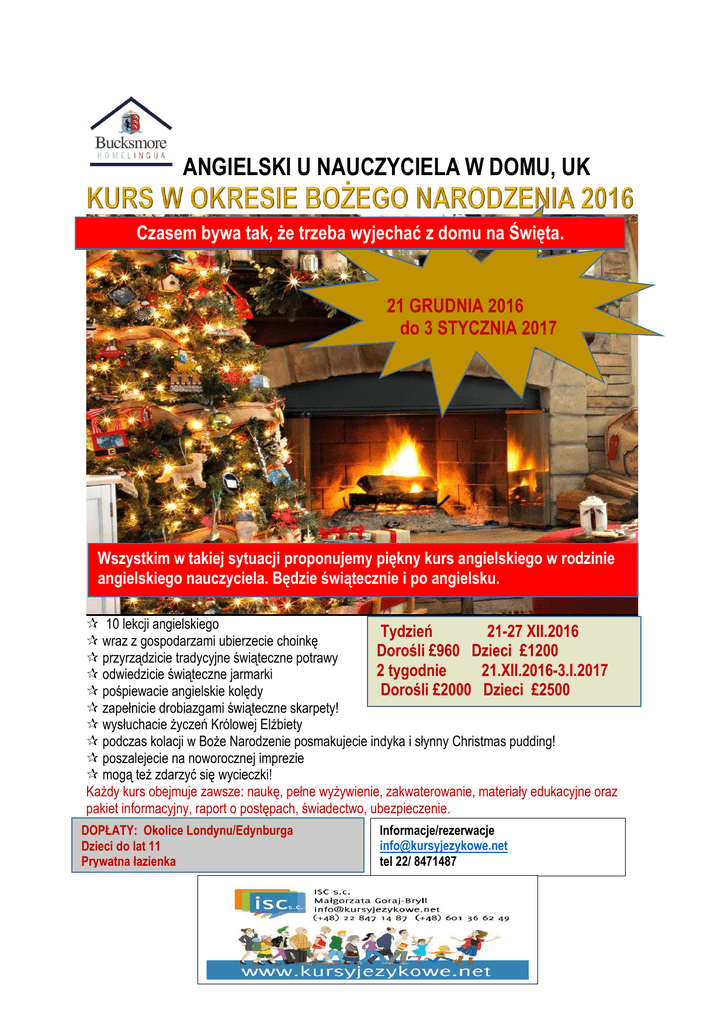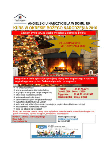 ANGIELSKI U NAUCZYCIELA W DOMU, UK Czasem bywa tak, że trzeba wyjechać z domu na Święta. 21 GRUDNIA 2016 do 3 STYCZNIA 2017 Wszystkim w takiej sytuacji proponujemy piękny kurs angielskiego w rodzinie angielskiego nauczyciela. Będzie świątecznie i po angielsku. 10 lekcji angielskiego Tydzień 21-27 XII.2016 wraz z gospodarzami ubierzecie choinkę Dorośli £960 Dzieci £1200 przyrządzicie tradycyjne świąteczne potrawy 2 tygodnie 21.XII.2016-3.I.2017 odwiedzicie świąteczne jarmarki Dorośli £2000 Dzieci £2500 pośpiewacie angielskie kolędy zapełnicie drobiazgami świąteczne skarpety! wysłuchacie życzeń Królowej Elżbiety podczas kolacji w Boże Narodzenie posmakujecie indyka i słynny Christmas pudding! poszalejecie na noworocznej imprezie mogą też zdarzyć się wycieczki! Każdy kurs obejmuje zawsze: naukę, pełne wyżywienie, zakwaterowanie, materiały edukacyjne oraz pakiet informacyjny, raport o postępach, świadectwo, ubezpieczenie. DOPŁATY: Okolice Londynu/Edynburga Dzieci do lat 11 Prywatna łazienka Informacje/rezerwacje [email protected] tel 22/ 8471487
