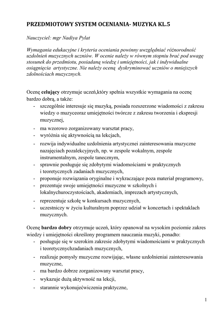 PRZEDMIOTOWY SYSTEM OCENIANIA- MUZYKA KL.5 Nauczyciel: mgr Nadiya Pylat Wymagania edukacyjne i kryteria oceniania powinny uwzględniać różnorodność uzdolnień muzycznych uczniów. W ocenie należy w równym stopniu brać pod uwagę stosunek do przedmiotu, posiadaną wiedzę i umiejętności, jak i indywidualne osiągnięcia artystyczne. Nie należy oceną dyskryminować uczniów o mniejszych zdolnościach muzycznych. Ocenę celujący otrzymuje uczeń,który spełnia wszystkie wymagania na ocenę bardzo dobrą, a także: - szczególnie interesuje się muzyką, posiada rozszerzone wiadomości z zakresu wiedzy o muzyceoraz umiejętności twórcze z zakresu tworzenia i ekspresji muzycznej, - ma wzorowo zorganizowany warsztat pracy, - wyróżnia się aktywnością na lekcjach, - rozwija indywidualne uzdolnienia artystycznei zainteresowania muzyczne nazajęciach pozalekcyjnych, np. w zespole wokalnym, zespole instrumentalnym, zespole tanecznym, - sprawnie posługuje się zdobytymi wiadomościami w praktycznych i teoretycznych zadaniach muzycznych, - proponuje rozwiązania oryginalne i wykraczające poza materiał programowy, - prezentuje swoje umiejętności muzyczne w szkolnych i lokalnychuroczystościach, akademiach, imprezach artystycznych, - reprezentuje szkołę w konkursach muzycznych, - uczestniczy w życiu kulturalnym poprzez udział w koncertach i spektaklach muzycznych. Ocenę bardzo dobry otrzymuje uczeń, który opanował na wysokim poziomie zakres wiedzy i umiejętności określony programem nauczania muzyki, ponadto: - posługuje się w szerokim zakresie zdobytymi wiadomościami w praktycznych i teoretycznychzadaniach muzycznych, - realizuje pomysły muzyczne rozwijając, własne uzdolnieniai zainteresowania muzyczne, - ma bardzo dobrze zorganizowany warsztat pracy, - wykazuje dużą aktywność na lekcji, - starannie wykonujećwiczenia praktyczne, 1 - bardzo dobrze wywiązuje się z powierzonych zadań, - potrafi bronić swoich poglądów i własną twórczą postawę, - jest zawsze przygotowany do zajęć. Ocenę dobry otrzymuje uczeń, któryopanował zakres wiedzy w stopniu dobrym, a także: - potrafi wykorzystać zdobyte wiadomości i umiejętności w ćwiczeniach i zadaniach muzycznych, - stara się wywiązywać ze swoich obowiązków, - ma dobrze zorganizowany warsztat pracy, - samodzielnie rozwiązuje typowe zadania praktyczne i teoretyczne, - pracuje systematycznie i efektywnie (indywidualnie i w zespole), - poprawnie formułuje wnioski, - dobrze wywiązuje się z powierzonych zadań, - bierzeczynny udział w zajęciach lekcyjnych. Ocenę dostateczny otrzymuje uczeń, który częściowo opanował zakres wiedzy i umiejętności określony programem nauczania muzyki oraz: - najczęściej uzyskuje dostateczne oceny cząstkowe, - wykonuje typowe ćwiczenia i zadania muzyczne o średnim stopniu trudności, często z pomocą nauczyciela, - nie pracuje systematycznie, - rzadko uczestniczy w dyskusjach i pracach zespołowo-grupowych, - przejawia niezdecydowanie i powściągliwość w działaniach muzycznych, - ma słabo zorganizowany warsztat pracy. Ocenę dopuszczający otrzymuje uczeń, który na poziomie elementarnym opanował zakres wiedzy i umiejętności określony programem nauczania muzyki, a także: - z pomocą nauczyciela realizuje ćwiczenia i zadania muzyczne o łatwym stopniu trudności, - nie potrafi samodzielnie wykonać działań w poszczególnych formach aktywności, - nie pracuje systematycznie, - niestarannie wykonuje ćwiczenia, - niechętnie podejmuje działania muzyczne, - biernie uczestniczy w zajęciach, - trudno organizuje swój warsztat pracy, - nie wywiązuje się z obowiązków i powierzonych zadań. 2 Ocenę niedostateczny otrzymuje uczeń, który nie opanował minimum wiadomości określonych programem nauczania oraz: - nie przejawia zainteresowania przedmiotem oraz żadnej aktywności muzycznej, - wyraża lekceważący stosunek do przedmiotu, - nie opanował żadnych umiejętności muzycznych, - jest stale nieprzygotowany do lekcji, - nie prowadzi zeszytu przedmiotowego, nie uzupełnia ćwiczeń, - nie wykazuje żadnej chęci poprawy oceny, - wykazuje całkowitą niechęć do przedmiotu oraz pracy. METODY SPRAWDZANIA OSIĄGNIĘĆ I POSTĘPÓW UCZNIÓW Elementy oceniane: 1.Umiejętności praktyczne: •śpiew– sprawdzenie stopnia opanowania utworów wokalnych: - śpiewanie piosenek, pieśni lub ich fragmentów solo, - śpiewanie piosenek, pieśni lub ich fragmentów w małej grupie, -śpiewanie piosenek, pieśni w zespole klasowym. •gra na instrumentach - sprawdzenie stopnia opanowania utworu instrumentalnego: - zagranie utworu lub jego fragmentu, - zagranie akompaniamentu rytmicznego na instrumencie perkusyjnym, - zagranie w zespole odpowiedniej partii instrumentalnej utworu, • taniec – sprawdzenie stopnia opanowania kroków i figur tanecznych wybranych tańców ludowych, narodowych, towarzyskich: - taniec solo, - taniecz partnerem, - taniec w zespole – wykonanie układu choreograficznego wybranego tańca, •umiejętność formułowania problemów, wyciągania wniosków i poszukiwania własnych rozwiązań, • umiejętność współpracy w grupie. 2. Wiedza z zakresu kultury muzycznej: - pisemne testy i sprawdziany wiadomości–krótkie prace pisemnesprawdzające wiadomości i umiejętności uczniów. Nauczyciel sprawdza i ocenia wyniki testów i sprawdzianów zgodnie z przyjętymi kryteriami oceny poszczególnych zadań oraz zasadamioceniania prac pisemnych przyjętych w PSO, - muzyczne ćwiczenia, quizy, zagadki, - wypowiedzi na temat słuchanych utworów, - przygotowanie materiałów do lekcji na określony temat. 3 3. Aktywność na zajęciach -ocenianejest czynne uczestnictwo ucznia podczas zajęć w: rozwiązywaniu problemu, zbiorowej dyskusji, itp. 4. Praca z zeszytem ćwiczeń. Ocenie podlega: - systematyczność, poprawność oraz estetyka wykonywanych ćwiczeń i prac domowych, - podejmowanie zadań dodatkowych, np. Ćwi