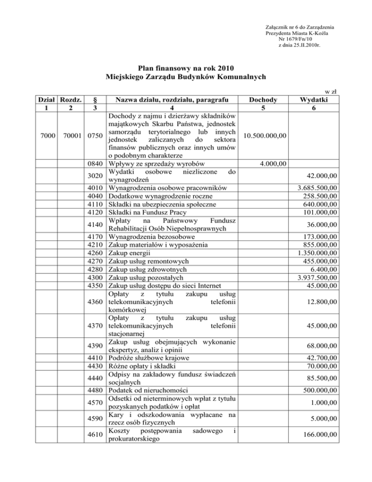 Załącznik nr 6 do Zarządzenia Prezydenta Miasta K-Koźla Nr 1679/Fn/10 z dnia 25.II.2010r. Plan finansowy na rok 2010 Miejskiego Zarządu Budynków Komunalnych w zł Dział Rozdz. 1 2 7000 § 3 70001 0750 0840 3020 4010 4040 4110 4120 4140 4170 4210 4260 4270 4280 4300 4350 4360 4370 4390 4410 4430 4440 4480 4570 4590 4610 Nazwa działu, rozdziału, paragrafu 4 Dochody z najmu i dzierżawy składników majątkowych Skarbu Państwa, jednostek samorządu terytorialnego lub innych jednostek zaliczanych do sektora finansów publicznych oraz innych umów o podobnym charakterze Wpływy ze sprzedaży wyrobów Wydatki osobowe niezliczone do wynagrodzeń Wynagrodzenia osobowe pracowników Dodatkowe wynagrodzenie roczne Składki na ubezpieczenia społeczne Składki na Fundusz Pracy Wpłaty na Państwowy Fundusz Rehabilitacji Osób Niepełnosprawnych Wynagrodzenia bezosobowe Zakup materiałów i wyposażenia Zakup energii Zakup usług remontowych Zakup usług zdrowotnych Zakup usług pozostałych Zakup usług dostępu do sieci Internet Opłaty z tytułu zakupu usług telekomunikacyjnych telefonii komórkowej Opłaty z tytułu zakupu usług telekomunikacyjnych telefonii stacjonarnej Zakup usług obejmujących wykonanie ekspertyz, analiz i opinii Podróże służbowe krajowe Różne opłaty i składki Odpisy na zakładowy fundusz świadczeń socjalnych Podatek od nieruchomości Odsetki od nieterminowych wpłat z tytułu pozyskanych podatków i opłat Kary i odszkodowania wypłacane na rzecz osób fizycznych Koszty postępowania sadowego i prokuratorskiego Dochody 5 Wydatki 6 10.500.000,00 4.000,00 42.000,00 3.685.500,00 258.500,00 640.000,00 101.000,00 36.000,00 173.000,00 855.000,00 1.350.000,00 455.000,00 6.400,00 3.937.500,00 45.000,00 12.800,00 45.000,00 68.000,00 42.700,00 70.000,00 85.500,00 500.000,00 1.000,00 5.000,00 166.000,00 2 1 2 3 4700 4740 4750 6050 700 70001 --- ----- 4 5 Szkolenia pracowników niebędących członkami korpusu służby cywilnej Zakup materiałów papierniczych do sprzętu drukarskiego i urządzeń kserograficznych Zakup akcesoriów komputerowych, w tym programów i licencji Wydatki inwestycyjne jednostek budżetowych Zakłady gospodarki mieszkaniowej 10.504.000,00 Gospodarka mieszkaniowa 10.504.000,00 OGÓŁEM Miejski Zarząd Budynków Komunalnych Kędzierzyn-Koźle, luty 2010r 10.504.000,00 6 48.100,00 21.000,00 75.000,00 960.000,00 13.685.000,00 13.685.000,00 13.685.000,00