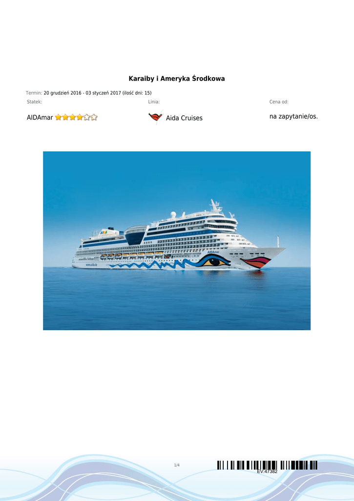 Karaiby i Ameryka Środkowa Termin: 20 grudzień 2016 - 03 styczeń 2017 (ilość dni: 15) Statek: AIDAmar Linia: Cena od: Aida Cruises na zapytanie/os. 1/4 EV:47382 TRASA REJSU Data Port Wpłynięcie Wypłynięcie wtorek 20.12.2016 Montego Bay --:-- 21:00 dzień 2 środa 21.12.2016 Dzień na morzu --:-- --:-- dzień 3 czwartek 22.12.2016 Samana 09:00 16:00 Republika Dominikańska piątek 23.12.2016 10:00 19:00 Brytyjskie Wyspy Dziewicze 09:00 18:00 08:00 18:00 dzień 1 dzień 4 dzień 5 Jamajka Road Town, Tortola sobota 24.12.2016 Philipsburg niedziela 25.12.2016 Saint John's, Antigua dzień 7 poniedziałek 26.12.2016 Dzień na morzu --:-- --:-- dzień 8 wtorek 27.12.2016 Santo Domingo 08:00 20:00 08:00 18:00 dzień 6 dzień 9 środa 28.12.2016 Sint Maarten Antigua i Barbuda Republika Dominikańska La Romana Republika Dominikańska dzień 10 czwartek 29.12.2016 Dzień na morzu --:-- --:-- dzień 11 piątek 30.12.2016 Cartagena de Indias 09:00 16:00 10:00 19:00 08:00 18:00 --:-- --:-- dzień 12 dzień 13 dzień 14 sobota 31.12.2016 Kolumbia Colon Panama niedziela 01.01.2017 Puerto Limon poniedziałek 02.01.2017 Dzień na morzu Kostaryka 2/4 EV:47382 Legenda dzień 15 Data Port Wpłynięcie Wypłynięcie wtorek 03.01.2017 Montego Bay 08:00 --:-- Legenda Jamajka CENNIK Cena katalogowa Kabina wewnętrzna na zapytanie Kabina zewnętrzna z oknem na zapytanie Kabina zewnętrzna z balkonem na zapytanie Suite (apartament) na zapytanie Kabina jednoosobowa na zapytanie 3 i 4 osoba dorosła w kabinie na zapytanie młodzież od 16 do 24 lat na zapytanie dziecko od 2 do 15 lat jako 3 i 4 osoba w kabinie na zapytanie Opłaty portowe Cena promocyjna w cenie Uwaga! Ceny za osobę w kabinie dwuosobowej. Ważna informacja: Armator niemieckojęzyczny. Cena zawiera: zakwaterowanie w kabinie wybranej kategorii; wyżywienie - 3 główne posiłki oraz napoje serwowane podczas posiłków; serwis bagażowy podczas wejścia i zejścia ze statku; serwis kabinowy; napiwki dla obsługi statku; korzystanie ze wszystkich urządzeń sportowo rekreacyjnych znajdujących się na pokładzie statku (basen, jacuzzi, sala fitness, itp.); udział we wszystkich imprezach organizowanych na statku (przedstawienia w teatrze, koncerty, programy animacyjne itp.). Cena nie zawiera: kosztów dojazdu do portu (na życzenie możliwość rezerwacji przelotu z niemieckich lotnisk w atrakcyjnej cenie); ewentualnych noclegów w hotelu przed/po rejsie i transferów; wycieczek fakultatywnych w trakcie rejsu; korzystania z barów, mini baru w kabinie oraz napojów zamawianych poza porami posiłków; korzystania z punktów usługowych (fryzjer, pralnia, fotograf, salon piękności i odnowy biologicznej, internet) i wydatków osobistych; ubezpieczenia KL, NNW i bagaż (około €1 - €1,5 osoba/dzień), kosztów wiz (tam gdzie wymagane). Pakiety napojów: AIDA Light: idealna oferta dla dzieci i nastolatków oraz osób, które chcą spędzić wolny czas bez alkoholu. W tym pakiecie zawarte są wszystkie napoje puszkowane oraz koktajle bezalkoholowe. Cena €9,90/osoba/dzień AIDA Comfort: pakiet zawiera napoje z pakietu Light oraz dodatkowo bezalkoholowe kawy i herbaty, gorącą czekoladę, domowe wina i szampana, dwa gatunki piwa z beczki, dwa kupony na koktajle o wartości do €7,50/rejs. Cena €19,90/osoba/dzień AIDA Family: pakiet rodzinny zawiera kombinację pakietów Light i Comfort w specjalnie skalkulowanych cenach: Small - 1 dorosły i 1 3/4 EV:47382 dziecko - €24,90/osoba/dzień Medium - 2 dorosłych i 1 dziecko - €39,90/osoba/dzień Large - 2 dorosłych i 2 dzieci - €44,90/osoba/dzień XLarge - 2 dorosłych i 3 dzieci - €49,90/osoba/dzień AIDA Genisser: pakiet oprócz bogatej oferty napojów zawiera także ofertę gastronomiczną. Pakiety są kwotowe i dają możliwość korzystania z restauracji a la carte i zamówienia wina w butelkach. Można je dokupować na pokładzie statku. Pakiety dostępne są dla osób powyżej 18 lat i mają wartość: €100 - płaci się €90 €200 - płaci się €180 €300 - płaci się €265 €400 - płaci się €350 4/4 EV:47382