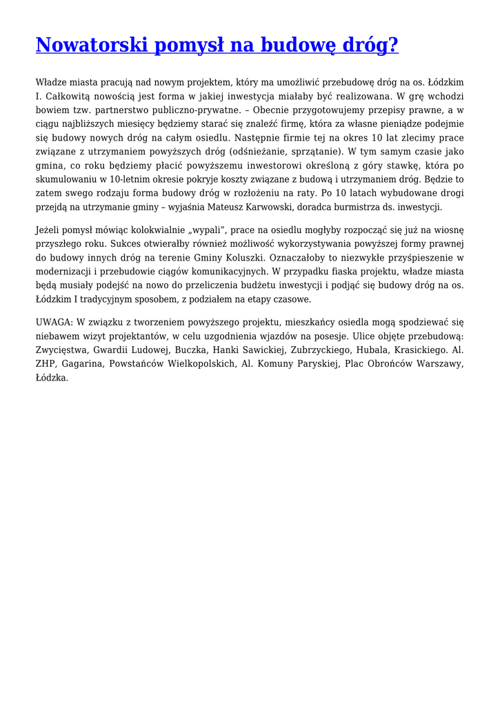 Nowatorski pomysł na budowę dróg? Władze miasta pracują nad nowym projektem, który ma umożliwić przebudowę dróg na os. Łódzkim I. Całkowitą nowością jest forma w jakiej inwestycja miałaby być realizowana. W grę wchodzi bowiem tzw. partnerstwo publiczno-prywatne. – Obecnie przygotowujemy przepisy prawne, a w ciągu najbliższych miesięcy będziemy starać się znaleźć firmę, która za własne pieniądze podejmie się budowy nowych dróg na całym osiedlu. Następnie firmie tej na okres 10 lat zlecimy prace związane z utrzymaniem powyższych dróg (odśnieżanie, sprzątanie). W tym samym czasie jako gmina, co roku będziemy płacić powyższemu inwestorowi określoną z góry stawkę, która po skumulowaniu w 10-letnim okresie pokryje koszty związane z budową i utrzymaniem dróg. Będzie to zatem swego rodzaju forma budowy dróg w rozłożeniu na raty. Po 10 latach wybudowane drogi przejdą na utrzymanie gminy – wyjaśnia Mateusz Karwowski, doradca burmistrza ds. inwestycji. Jeżeli pomysł mówiąc kolokwialnie „wypali”, prace na osiedlu mogłyby rozpocząć się już na wiosnę przyszłego roku. Sukces otwierałby również możliwość wykorzystywania powyższej formy prawnej do budowy innych dróg na terenie Gminy Koluszki. Oznaczałoby to niezwykłe przyśpieszenie w modernizacji i przebudowie ciągów komunikacyjnych. W przypadku fiaska projektu, władze miasta będą musiały podejść na nowo do przeliczenia budżetu inwestycji i podjąć się budowy dróg na os. Łódzkim I tradycyjnym sposobem, z podziałem na etapy czasowe. UWAGA: W związku z tworzeniem powyższego projektu, mieszkańcy osiedla mogą spodziewać się niebawem wizyt projektantów, w celu uzgodnienia wjazdów na posesje. Ulice objęte przebudową: Zwycięstwa, Gwardii Ludowej, Buczka, Hanki Sawickiej, Zubrzyckiego, Hubala, Krasickiego. Al. ZHP, Gagarina, Powstańców Wielkopolskich, Al. Komuny Paryskiej, Plac Obrońców Warszawy, Łódzka.