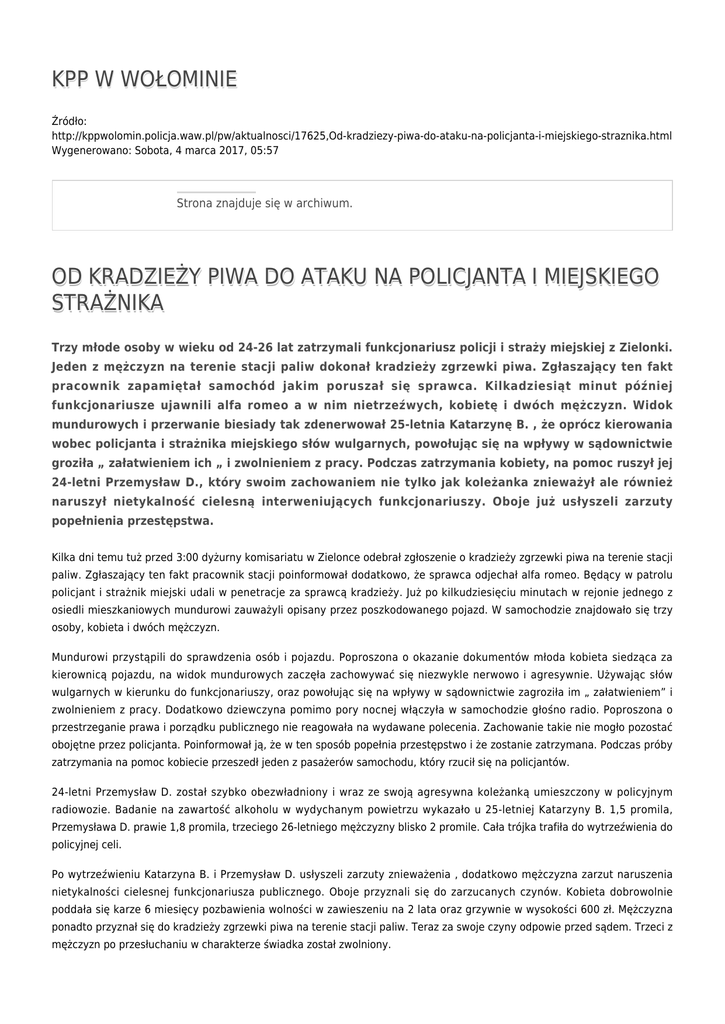 KPP W WOŁOMINIE Źródło: http://kppwolomin.policja.waw.pl/pw/aktualnosci/17625,Od-kradziezy-piwa-do-ataku-na-policjanta-i-miejskiego-straznika.html Wygenerowano: Sobota, 4 marca 2017, 05:57 Strona znajduje się w archiwum. OD KRADZIEŻY PIWA DO ATAKU NA POLICJANTA I MIEJSKIEGO STRAŻNIKA Trzy młode osoby w wieku od 24-26 lat zatrzymali funkcjonariusz policji i straży miejskiej z Zielonki. Jeden z mężczyzn na terenie stacji paliw dokonał kradzieży zgrzewki piwa. Zgłaszający ten fakt pracownik zapamiętał samochód jakim poruszał się sprawca. Kilkadziesiąt minut później funkcjonariusze ujawnili alfa romeo a w nim nietrzeźwych, kobietę i dwóch mężczyzn. Widok mundurowych i przerwanie biesiady tak zdenerwował 25-letnia Katarzynę B. , że oprócz kierowania wobec policjanta i strażnika miejskiego słów wulgarnych, powołując się na wpływy w sądownictwie groziła „ załatwieniem ich „ i zwolnieniem z pracy. Podczas zatrzymania kobiety, na pomoc ruszył jej 24-letni Przemysław D., który swoim zachowaniem nie tylko jak koleżanka znieważył ale również naruszył nietykalność cielesną interweniujących funkcjonariuszy. Oboje już usłyszeli zarzuty popełnienia przestępstwa. Kilka dni temu tuż przed 3:00 dyżurny komisariatu w Zielonce odebrał zgłoszenie o kradzieży zgrzewki piwa na terenie stacji paliw. Zgłaszający ten fakt pracownik stacji poinformował dodatkowo, że sprawca odjechał alfa romeo. Będący w patrolu policjant i strażnik miejski udali w penetracje za sprawcą kradzieży. Już po kilkudziesięciu minutach w rejonie jednego z osiedli mieszkaniowych mundurowi zauważyli opisany przez poszkodowanego pojazd. W samochodzie znajdowało się trzy osoby, kobieta i dwóch mężczyzn. Mundurowi przystąpili do sprawdzenia osób i pojazdu. Poproszona o okazanie dokumentów młoda kobieta siedząca za kierownicą pojazdu, na widok mundurowych zaczęła zachowywać się niezwykle nerwowo i agresywnie. Używając słów wulgarnych w kierunku do funkcjonariuszy, oraz powołując się na wpływy w sądownictwie zagroziła im „ załatwieniem” i zwolnieniem z pracy. Dodatkowo dziewczyna pomimo pory nocnej włączyła w samochodzie głośno radio. Poproszona o przestrzeganie prawa i porządku publicznego nie reagowała na wydawane polecenia. Zachowanie takie nie mogło pozostać obojętne przez policjanta. Poinformował ją, że w ten sposób popełnia przestępstwo i że zostanie zatrzymana. Podczas próby zatrzymania na pomoc kobiecie przeszedł jeden z pasażerów samochodu, który rzucił się na policjantów. 24-letni Przemysław D. został szybko obezwładniony i wraz ze swoją agresywna koleżanką umieszczony w policyjnym radiowozie. Badanie na zawartość alkoholu w wydychanym powietrzu wykazało u 25-letniej Katarzyny B. 1,5 promila, Przemysława D. prawie 1,8 promila, trzeciego 26-letniego mężczyzny blisko 2 promile. Cała trójka trafiła do wytrzeźwienia do policyjnej celi. Po wytrzeźwieniu Katarzyna B. i Przemysław D. usłyszeli zarzuty znieważenia , dodatkowo mężczyzna zarzut naruszenia nietykalności cielesnej funkcjonariusza publicznego. Oboje przyznali się do zarzucanych czynów. Kobieta dobrowolnie poddała się karze 6 miesięcy pozbawienia wolności w zawieszeniu na 2 lata oraz grzywnie w wysokości 600 zł. Mężczyzna ponadto przyznał się do kradzieży zgrzewki piwa na terenie stacji paliw. Teraz za swoje czyny odpowie przed sądem. Trzeci z mężczyzn po przesłuchaniu w charakterze świadka został zwolniony. ts Ocena: 0/5 (0) Tweetnij