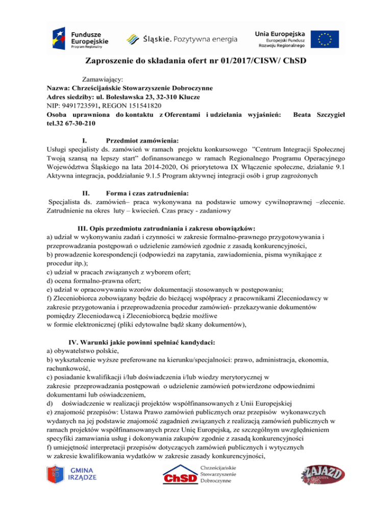 Zaproszenie do składania ofert nr 01/2017/CISW/ ChSD Zamawiający: Nazwa: Chrześcijańskie Stowarzyszenie Dobroczynne Adres siedziby: ul. Bolesławska 23, 32-310 Klucze NIP: 9491723591, REGON 151541820 Osoba uprawniona do kontaktu z Oferentami i udzielania wyjaśnień: tel.32 67-30-210 Beata Szczygieł I. Przedmiot zamówienia: Usługi specjalisty ds. zamówień w ramach projektu konkursowego ”Centrum Integracji Społecznej Twoją szansą na lepszy start” dofinansowanego w ramach Regionalnego Programu Operacyjnego Województwa Śląskiego na lata 2014-2020, Oś priorytetowa IX Włączenie społeczne, działanie 9.1 Aktywna integracja, poddziałanie 9.1.5 Program aktywnej integracji osób i grup zagrożonych II. Forma i czas zatrudnienia: Specjalista ds. zamówień– praca wykonywana na podstawie umowy cywilnoprawnej –zlecenie. Zatrudnienie na okres luty – kwiecień. Czas pracy - zadaniowy III. Opis przedmiotu zatrudniania i zakresu obowiązków: a) udział w wykonywaniu zadań i czynności w zakresie formalno-prawnego przygotowywania i przeprowadzania postępowań o udzielenie zamówień zgodnie z zasadą konkurencyjności, b) prowadzenie korespondencji (odpowiedzi na zapytania, zawiadomienia, pisma wynikające z procedur itp.); c) udział w pracach związanych z wyborem ofert; d) ocena formalno-prawna ofert; e) udział w opracowywaniu wzorów dokumentacji stosowanych w postępowaniu; f) Zleceniobiorca zobowiązany będzie do bieżącej współpracy z pracownikami Zleceniodawcy w zakresie przygotowania i przeprowadzenia procedur zamówień- przekazywanie dokumentów pomiędzy Zleceniodawcą i Zleceniobiorcą będzie możliwe w formie elektronicznej (pliki edytowalne bądź skany dokumentów), IV. Warunki jakie powinni spełniać kandydaci: a) obywatelstwo polskie, b) wykształcenie wyższe preferowane na kierunku/specjalności: prawo, administracja, ekonomia, rachunkowość, c) posiadanie kwalifikacji i/lub doświadczenia i/lub wiedzy merytorycznej w zakresie przeprowadzania postępowań o udzielenie zamówień potwierdzone odpowiednimi dokumentami lub oświadczeniem, d) doświadczenie w realizacji projektów współfinansowanych z Unii Europejskiej e) znajomość przepisów: Ustawa Prawo zamówień publicznych oraz przepisów wykonawczych wydanych na jej podstawie znajomość zagadnień związanych z realizacją zamówień publicznych w ramach projektów współfinansowanych przez Unię Europejską, ze szczególnym uwzględnieniem specyfiki zamawiania usług i dokonywania zakupów zgodnie z zasadą konkurencyjności f) umiejętność interpretacji przepisów dotyczących zamówień publicznych i wytycznych w zakresie kwalifikowania wydatków w zakresie zasady konkurencyjności, g) posiadanie pełnej zdolności do czynności prawnych, oraz korzystanie z pełni praw publicznych, h) niekaralność za przestępstwa umyślne; i) samodzielność i dobra organizacja pracy; V. Sposób przygotowania oferty: Oferty należy sporządzić w języku polskim, w formie pisemnej w zamkniętej kopercie odpowiednio z dopiskiem np. „specjalista ds. zamówień– projekt konkursowy „Centrum Integracji Społecznej Twoją szansą na lepszy start”. Do oferty należy dołączyć: a) Formularz oferty – zał. nr 1 do zapytania. b) CV (zał nr 2). c) Kopie dokumentów potwierdzających wykształcenie, uprawnienia. d) Kopie dokumentów lub oświadczenie potwierdzających doświadczenie/wiedzę merytoryczną. f) Oświadczenie kandydata o niekaralności w rozumieniu art. 6 ust. 3 pkt 2 ustawy o pracownikach samorządowych /Dz. U. z 2008 r. Nr 223 poz. 1458/ o następującej treści: treści: „Oświadczam, że nie byłem/am karany/a za przestępstwo popełnione umyślnie i nie toczy się przeciwko mnie postępowanie karne.” g) Oświadczenie kandydata o wyrażeniu zgody na przetwarzanie danych osobowych zawartych w ofercie dla potrzeb procesu rekrutacji zgodnie z ustawą o ochronie danych osobowych /Dz. U z 2002 r. Nr 101 poz. 926 z póź. zm./ „Wyrażam zgodę na przetwarzanie danych osobowych zawartych w ofercie pracy dla potrzeb niezbędnych do realizacji procesu rekrutacji na stanowisko specjalisty ds. zamówień na rzecz realizacji projektu konkursowego „Centrum Integracji Społecznej twoją szansą na lepszy start”, zgodnie z ustawą z dnia 29.08.1997r. o ochronie danych osobowych (tekst jednolity Dz. U. z 2008 r. Nr 223, poz. 1458)” VI Kryteria wyboru oferty : Najkorzystniejsza oferta spełniającą wymagania pracy na w/w stanowisku (100 % cena) VII. Miejsce i termin składania dokumentów: Wymagane dokumenty aplikacyjne należy składać osobiście ( sekretariat w Łazach) lub korespondencyjnie na adres: Chrześcijańskie Stowarzyszenie Dobroczynne z siedzibą w Kluczach 42-450 Łazy ul. Brzozowa 19 z dopiskiem: „specjalista ds. zamówień”, w zamkniętej kopercie, w terminie od dnia 20.01.2017 do dnia 30.01.2017 r. do godz. 12.00 ( decyduje data wpływu do sekretariacie. Oferty niekompletne lub te, które wpłyną po wyżej określonym terminie nie będą rozpatrywane.