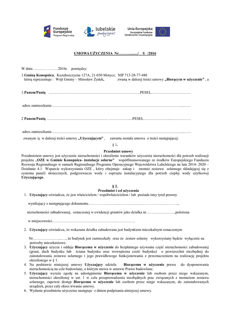 UMOWA UŻYCZENIA Nr………......../ S /2016 W dniu ………. ………2016r. pomiędzy: 1.Gminą Konopnica, Kozubszczyzna 127A, 21-030 Motycz, NIP 713-28-77-488 którą reprezentuje : Wójt Gminy – Mirosław Żydek, zwaną w dalszej treści umowy „Biorącym w użyczenie” , a 1.Panem/Panią …………………………………………….…………………PESEL…………………..……… adres zamieszkania …………………………………………………………………………………………..…… 2 Panem/Panią …………………………………………. ……………….PESEL…………………..…………… adres zamieszkania .…………………………………………………………………………………………..…… zwanym /ą w dalszej treści umowy „Użyczającym” , zawarta została umowa o treści następującej: § 1. Przedmiot umowy Przedmiotem umowy jest użyczenie nieruchomości i określenie warunków użyczenia nieruchomości dla potrzeb realizacji projektu „OZE w Gminie Konopnica- instalacje solarne” współfinansowanego ze środków Europejskiego Funduszu Rozwoju Regionalnego w ramach Regionalnego Programu Operacyjnego Województwa Lubelskiego na lata 2014- 2020 – Działanie 4.1 Wsparcie wykorzystania OZE , który obejmuje zakup i montaż zestawu solarnego składającej się z systemu paneli słonecznych, podgrzewacza wody i osprzętu instalacyjnego dla potrzeb ciepłej wody użytkowej Użyczającego. § 2. Przedmiot i cel użyczenia 1. Użyczający oświadcza, że jest właścicielem / współwłaścicielem / lub posiada inny tytuł prawny wynikający z następującego dokumentu……………………..………………………………………., nieruchomości zabudowanej, oznaczonej w ewidencji gruntów jako działka nr…………………...położona w miejscowości………………………….………………...…………… 2. Użyczający oświadcza, że wskazana działka zabudowana jest budynkiem mieszkalnym oznaczonym 3. 4. 5. 6. Nr…………………...…, że budynek jest zamieszkały oraz że zestaw solarny wykorzystany będzie wyłącznie na potrzeby mieszkaniowe. Użyczający użycza i oddaje Biorącemu w użyczenie do bezpłatnego używania część nieruchomości zabudowanej (grunt, dach budynku lub ściana budynku oraz wewnętrzna cześć budynku) o powierzchni niezbędnej do zainstalowania zestawu solarnego i jego prawidłowego funkcjonowania z przeznaczeniem na realizację projektu określonego w § 1. Na podstawie niniejszej umowy Użyczający udziela Biorącemu w użyczenie prawa do dysponowania nieruchomością na cele budowlane, o którym mowa w ustawie Prawo budowlane. Użyczający wyraża zgodę na udostępnienie Biorącemu w użyczenie lub osobom przez niego wskazanym, nieruchomości określonej w ust. 1 w celu przeprowadzenia niezbędnych prac związanych z montażem zestawu solarnego, zapewni dostęp Biorącemu w użyczenie lub osobom przez niego wskazanym, do zainstalowanych urządzeń, przez cały okres trwania umowy. Wydanie przedmiotu użyczenia następuje z dniem podpisania niniejszej umowy. 7. Wykonawca robót budowlanych wybrany przez Biorącego w użyczenie zobowiązany będzie do uporządkowania terenu budowy oraz do naprawy uszkodzeń urządzeń i budynku będących skutkiem montażu zestawu solarnego. 8. Biorący w użyczenie zapewnia, że będzie używał użyczonej rzeczy zgodnie z jej przeznaczeniem.. § 3. Okres użyczenia 1. Umowa zostaje zawarta na czas określony od dnia podpisania umowy do dnia 31.12.2023r. 2. W przypadku zmiany harmonogramu realizacji projektu niniejsza umowa ulega automatycznej zmianie i obowiązuje do upływu 5 lat od dnia zatwierdzenia końcowego raportu z realizacji projektu określonego § 1, bez zawierania odrębnego aneksu do umowy. 1. 2. 3. 4. 1. 2. 3. 1. 2. 3. 4. 5. 6. 7. 8. 9. § 4. Warunki wygaśnięcia, odstąpienia, rozwiązania umowy Umowa użyczenia wygasa w przypadku gdy nie dojdzie do podpisania umowy o dofinansowanie projektu określonego w §1 Biorący w użyczenie odstąpi od umowy w terminie 7 dni od dnia stwierdzenia, że budynek mieszkalny dla którego planowany jest montaż zestawu solarnego nie jest użytkowany lub jest użytkowany niezgodnie z przepisami prawa oraz w okolicznościach określonych w § 6 ust 8, ust 11 i ust 12 niniejszej umowy. Umowa może zostać rozwiązana w przypadku stwierdzenia braku możliwości technicznych zamontowania zestawu solarnego, zaistnienia sytuacji losowych, których Użyczający nie mógł przewidzieć w dniu zawarcia umowy oraz w innych uzasadnionych okolicznościach. Z tytułu rozwiązania umowy Użyczającemu nie przysługuje żadne roszczenie wobec Biorącego w użyczenie. Umowa użyczenia wygasa w przypadku gdy Użyczający uniemożliwia prowadzenie prac przez ekipę montażową. W tym przypadku wszelkie dotychczasowe koszty związane z realizacją umowy pokryje Użyczający. § 5. Zwrot przedmiotu użyczenia Po zakończeniu okresu użyczenia, Biorący w użyczenie obowiązany jest zwrócić przedmiot umowy bez dodatkowego wezwania ze strony Użyczającego protokołem podpisanym przez obie strony. Biorący w użyczenie nie ponosi odpowiedzialności za zużycie rzeczy będące następstwem używania przez Użyczającego lub czynników niezależnych od Biorącego w użyczenie. Zwrócony przedmiot użyczenia może wykazywać różnice w stosunku do stanu pierwotnego w zakresie kolorystyki malatury, uzupełnienia wykładzin podłóg, okładzin ścian, a także w stosunku do innych elementów wykończeniowych budynku. Wraz ze zwrotem przedmiotu umowy zamontowany zestaw solarny przechodzi na własność Użyczającego § 6. Zasady finansowania Biorący w użyczenie zobowiązuje się do wniesienia wkładu własnego do projektu w wysokości 1% całkowitej wartości zestawu solarnego. Wartość zestawu solarnego stanowią koszty niezbędnych dokumentów, doku