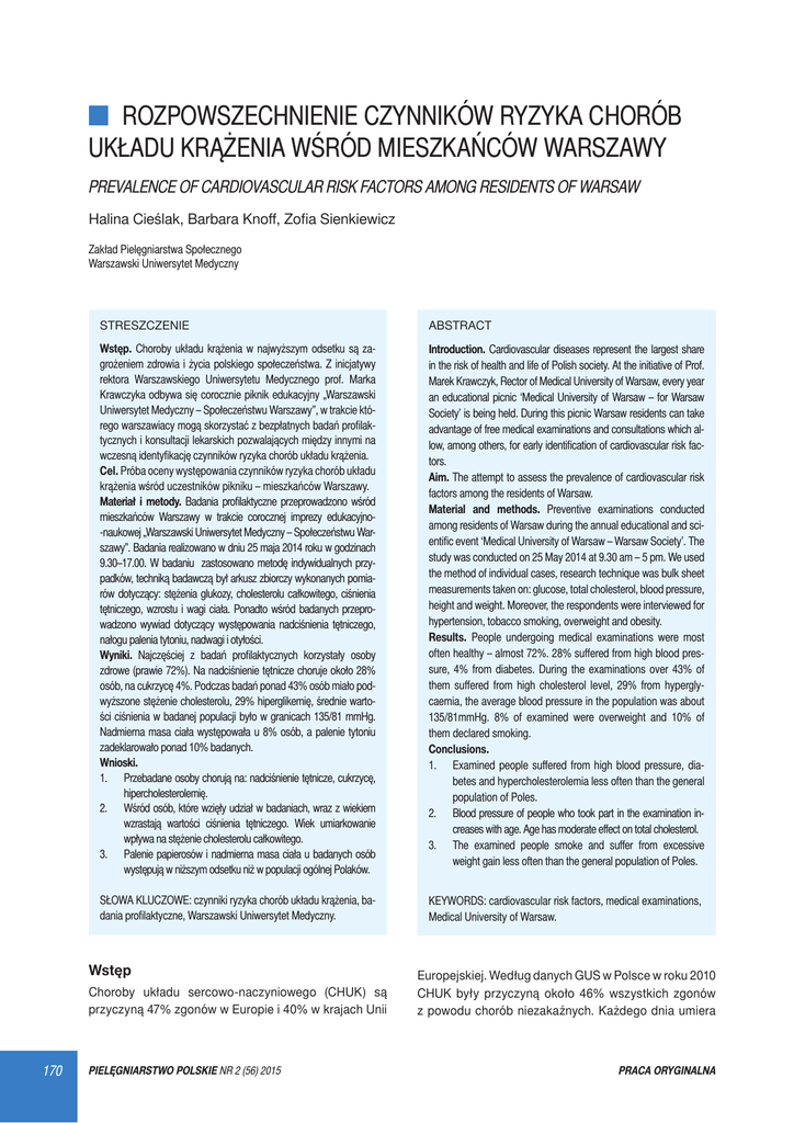 ROZPOWSZECHNIENIE CZYNNIKÓW RYZYKA CHORÓB UKŁADU KRĄŻENIA WŚRÓD MIESZKAŃCÓW WARSZAWY PREVALENCE OF CARDIOVASCULAR RISK FACTORS AMONG RESIDENTS OF WARSAW Halina Cieślak, Barbara Knoff, Zofia Sienkiewicz Zakład Pielęgniarstwa Społecznego Warszawski Uniwersytet Medyczny STRESZCZENIE ABSTRACT Wstęp. Choroby układu krążenia w najwyższym odsetku są zagrożeniem zdrowia i życia polskiego społeczeństwa. Z inicjatywy rektora Warszawskiego Uniwersytetu Medycznego prof. Marka Krawczyka odbywa się corocznie piknik edukacyjny „Warszawski Uniwersytet Medyczny – Społeczeństwu Warszawy”, w trakcie którego warszawiacy mogą skorzystać z bezpłatnych badań profilaktycznych i konsultacji lekarskich pozwalających między innymi na wczesną identyfikację czynników ryzyka chorób układu krążenia. Cel. Próba oceny występowania czynników ryzyka chorób układu krążenia wśród uczestników pikniku – mieszkańców Warszawy. Materiał i metody. Badania profilaktyczne przeprowadzono wśród mieszkańców Warszawy w trakcie corocznej imprezy edukacyjno-naukowej „Warszawski Uniwersytet Medyczny – Społeczeństwu Warszawy”. Badania realizowano w dniu 25 maja 2014 roku w godzinach 9.30–17.00. W badaniu zastosowano metodę indywidualnych przypadków, techniką badawczą był arkusz zbiorczy wykonanych pomiarów dotyczący: stężenia glukozy, cholesterolu całkowitego, ciśnienia tętniczego, wzrostu i wagi ciała. Ponadto wśród badanych przeprowadzono wywiad dotyczący występowania nadciśnienia tętniczego, nałogu palenia tytoniu, nadwagi i otyłości. Wyniki. Najczęściej z badań profilaktycznych korzystały osoby zdrowe (prawie 72%). Na nadciśnienie tętnicze choruje około 28% osób, na cukrzycę 4%. Podczas badań ponad 43% osób miało podwyższone stężenie cholesterolu, 29% hiperglikemię, średnie wartości ciśnienia w badanej populacji było w granicach 135/81 mmHg. Nadmierna masa ciała występowała u 8% osób, a palenie tytoniu zadeklarowało ponad 10% badanych. Wnioski. 1. Przebadane osoby chorują na: nadciśnienie tętnicze, cukrzycę, hipercholesterolemię. 2. Wśród osób, które wzięły udział w badaniach, wraz z wiekiem wzrastają wartości ciśnienia tętniczego. Wiek umiarkowanie wpływa na stężenie cholesterolu całkowitego. 3. Palenie papierosów i nadmierna masa ciała u badanych osób występują w niższym odsetku niż w populacji ogólnej Polaków. Introduction. Cardiovascular diseases represent the largest share in the risk of health and life of Polish society. At the initiative of Prof. Marek Krawczyk, Rector of Medical University of Warsaw, every year an educational picnic ‘Medical University of Warsaw – for Warsaw Society’ is being held. During this picnic Warsaw residents can take advantage of free medical examinations and consultations which allow, among others, for early identification of cardiovascular risk factors. Aim. The attempt to assess the prevalence of cardiovascular risk factors among the residents of Warsaw. Material and methods. Preventive examinations conducted among residents of Warsaw during the annual educational and scientific event ‘Medical University of Warsaw – Warsaw Society’. The study was conducted on 25 May 2014 at 9.30 am – 5 pm. We used the method of individual cases, research technique was bulk sheet measurements taken on: glucose, total cholesterol, blood pressure, height and weight. Moreover, the respondents were interviewed for hypertension, tobacco smoking, overweight and obesity. Results. People undergoing medical examinations were most often healthy – almost 72%. 28% suffered from high blood pressure, 4% from diabetes. During the examinations over 43% of them suffered from high cholesterol level, 29% from hyperglycaemia, the average blood pressure in the population was about 135/81mmHg. 8% of examined were overweight and 10% of them declared smoking. Conclusions. 1. Examined people suffered from high blood pressure, diabetes and hypercholesterolemia less often than the general population of Poles. 2. Blood pressure of people who took part in the examination increases with age. Age has moderate effect on total cholesterol. 3. The examined people smoke and suffer from excessive weight gain less often than the general population of Poles. SŁOWA KLUCZOWE: czynniki ryzyka chorób układu krążenia, badania profilaktyczne, Warszawski Uniwersytet Medyczny. KEYWORDS: cardiovascular risk factors, medical examinations, Medical University of Warsaw. Wstęp Choroby układu sercowo-naczyniowego (CHUK) są przyczyną 47% zgonów w Europie i 40% w krajach Unii 170 PIELĘGNIARSTWO POLSKIE NR 2 (56) 2015 Europejskiej. Według danych GUS w Polsce w roku 2010 CHUK były przyczyną około 46% wszystkich zgonów z powodu chorób niezakaźnych. Każdego dnia umiera PRACA ORYGINALNA średnio 476 osób, co piąty zgon jest przedwczesny (poniżej 65 roku życia) [1, 3, 4]. Czynniki ryzyka sercowo-naczyniowego to grupa objawów i danych z wywiadów, których obecność zwiększa ryzyko chorób sercowo-naczyniowych. Aktualnie do tych czynników zaliczamy między innymi: nadciśnienie tętnicze; wiek: mężczyźni powyżej 55 r.ż., kobiety powyżej 65 r.ż.; palenie tytoniu; dodatni wywiad rodzinny w kierunku występowania w rodzinie przedwczesnej choroby układu krążenia; zaburzenia lipidowe; otyłość brzuszną; naczyniową chorobę mózgu (TIA, udar mózgu niedokrwienny lub krwotoczny); chorobę niedokrwienną serca; chorobę nerek: cukrzycową chorobę nerek, białkomocz, niewydolność nerek; chorobę naczyń obwodowych; retinopatię w okresie III i IV i inne choroby [7]. Na podstawie wyników Ogólnopolskiego Badania Rozpowszechnienia Czynników Ryzyka Chorób Układu Krążenia – NATPOL 2011 w populacji dorosłych Polaków zaobserwowano zmiany w występowaniu czynników ryzyka chorób układu krążenia w porównaniu z wcześniejszym badaniem populacyjnym – NATPOL PLUS z roku 20
