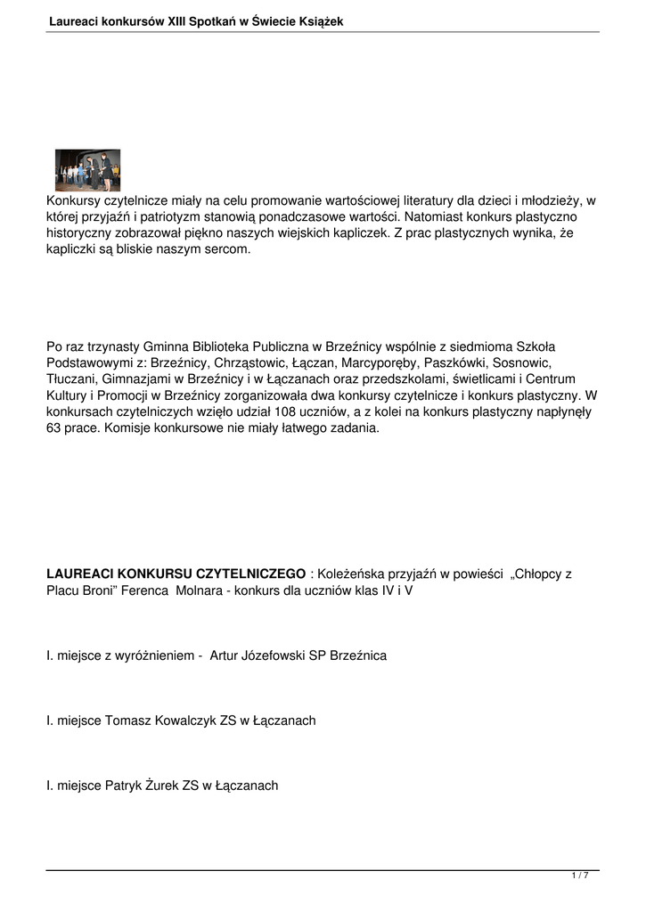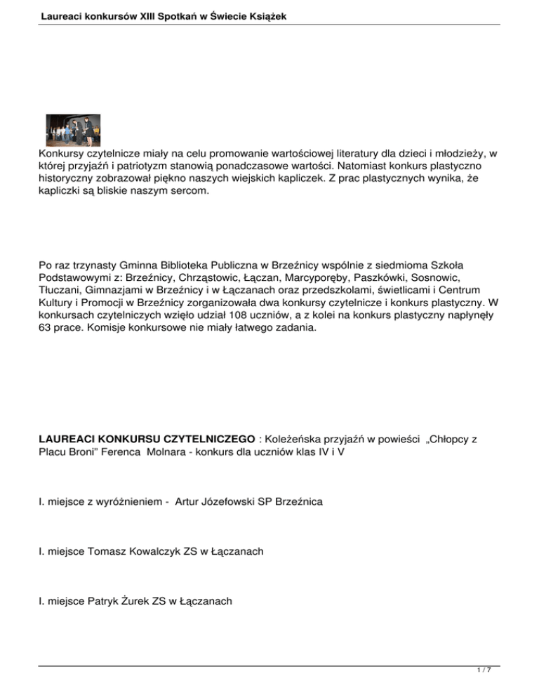 Laureaci konkursów XIII Spotkań w Świecie Książek Konkursy czytelnicze miały na celu promowanie wartościowej literatury dla dzieci i młodzieży, w której przyjaźń i patriotyzm stanowią ponadczasowe wartości. Natomiast konkurs plastyczno historyczny zobrazował piękno naszych wiejskich kapliczek. Z prac plastycznych wynika, że kapliczki są bliskie naszym sercom. Po raz trzynasty Gminna Biblioteka Publiczna w Brzeźnicy wspólnie z siedmioma Szkoła Podstawowymi z: Brzeźnicy, Chrząstowic, Łączan, Marcyporęby, Paszkówki, Sosnowic, Tłuczani, Gimnazjami w Brzeźnicy i w Łączanach oraz przedszkolami, świetlicami i Centrum Kultury i Promocji w Brzeźnicy zorganizowała dwa konkursy czytelnicze i konkurs plastyczny. W konkursach czytelniczych wzięło udział 108 uczniów, a z kolei na konkurs plastyczny napłynęły 63 prace. Komisje konkursowe nie miały łatwego zadania. LAUREACI KONKURSU CZYTELNICZEGO : Koleżeńska przyjaźń w powieści „Chłopcy z Placu Broni” Ferenca Molnara - konkurs dla uczniów klas IV i V I. miejsce z wyróżnieniem - Artur Józefowski SP Brzeźnica I. miejsce Tomasz Kowalczyk ZS w Łączanach I. miejsce Patryk Żurek ZS w Łączanach 1/7 Laureaci konkursów XIII Spotkań w Świecie Książek I. miejsce Karolina Wójcik SP w Marcyporębie II. miejsce Kamil Wacławek SP w Brzeźnicy II. miejsce Mateusz Moskała SP w Sosnowicach II. miejsce Arkadiusz Czerwiński ZS w Łączanach III. miejsce Mateusz Gałek SP w Brzeźnicy WYRÓŻNIENIA Kinga Scąber ZS w Łączanach Paulina Ślósarczyk SP w Paszkówce Dawid Gugała SP w Brzeźnicy LAUREACI KONKURSU CZYTELNICZEGO: Dylematy i patriotyzm gimnazjalistów sprzed wieku na podstawie powieści„Syzyfowe prace” Stefana Żeromskiego - konkurs dla gimnazjalistów i uczniów klas VI 2/7 Laureaci konkursów XIII Spotkań w Świecie Książek I miejsce Alicja Kozioł SP w Chrząstowicach II miejsce Marzena Maj kl.III d Gimnazjum w Brzeźnicy II miejsce Anna Zając kl. II e Gimnazjum w Brzeźnicy II miejsce Jakub Wojnowski kl. III e. Gimnazjum w Brzeźnicy II miejsce Bartosz Zielnik kl. II d. Gimnazjum w Brzeźnicy III miejsce Wojciech Książek kl. I d. Gimnazjum w Brzeźnicy III miejsce Katarzyna Radoń kl. III d. Gimnazjum w Brzeźnicy WYRÓŻNIENIA Piotr Wacław kl. III c Gimnazjum w Brzeźnicy Gabriela Jezierska kl. II e Gimnazjum w Brzeźnicy Martyna Czyżowska kl. III Gimnazjum ZS w Łączanach Angelika Dudek kl. II d Gimnazjum w Brzeźnicy 3/7 Laureaci konkursów XIII Spotkań w Świecie Książek Anna Grzesiek kl. III b Gimnazjum w Brzeźnicy Jakub Tracz kl. III a Gimnazjum w Brzeźnicy Łukasz Śmigielski III c Gimnazjum w Brzeźnicy Maciej Dankiewicz kl. II d Gimnazjum w Brzeźnicy Ida Linnert kl. II e Gimnazjum w Brzeźnicy LAUREACI KONKURSU PLASTYCZNO-HISTORYCZNEGO „Kiedy myślę kapliczka w mojej miejscowości – w gminie Brzeźnica” Młodsza kategoria wiekowa, w której przyznano równorzędne I miejsca Dominik Nicieja SP w Brzeźnicy – klasa „O” 4/7 Laureaci konkursów XIII Spotkań w Świecie Książek Anastazja Wojtas SP w Brzeźnicy – klasa „O” Julia Całus SP w Brzeźnicy – kl. I Aleksandra Kozioł Przedszkole Samorządowe w Łączanach Agnieszka Brania Przedszkole Samorządowe w Łączanach Wiktoria Piorun Przedszkole ze SP w Tłuczani Prace zbiorowe Klasa O Szkoły Podstawowej w Marcyporębie Świetlica Środowiskowa w Paszkówce Starsza kategoria wiekowa I miejsce - Marcin Marszałek kl. VI SP w Chrząstowicach II miejsce – Kamila Zontek kl. V ZS w Łączanach 5/7 Laureaci konkursów XIII Spotkań w Świecie Książek II miejsce - Kamila i Aleksandra Kubas SP w Tłuczani II miejsce -Paulina Ślósarczyk kl. IV SP w Paszkówce III miejsce – Klaudia Kozioł kl. VI ZS w Łączanach III miejsce - Ewa Błach kl. V SP w Tłuczani III miejsce- Oliwia Bałazy kl. III SP w Brzeźnicy III miejsce - Klaudia Antos kl. VI SP w Brzeźnicy Laureatom zostały wręczone piękne albumy książkowe podczas finałowej gali Gminnego Święta Książki w Brzeźnicy. Wójt Gminy Bogusław Antos nagradzając dzieci ogłosił, że będzie opracowywany folder, dokumentujący niezwykły urok kapliczek Obok zdjęć z terenu znajdą się w nim zdjęcia nadesłanych na konkurs prac. Wójt dziękował też rodzicom i nauczycielom, którzy inspirowali dzieci do twórczej pracy. Warto dbać o kapliczki i zwrócić uwagę w jakim są stanie. Stanowią one bowiem część naszego dziedzictwa kulturowego, pięknie wkomponowanego w wiejski pejzaż. Dziękujemy dyrektorom szkół, polonistom i historykom z miejscowych szkół za pomoc i przygotowanie dzieci. Gratulujemy zwycięzcom, a wszystkim dziękujemy za udział. Zapraszamy na kolejne Spotkania w Świecie Książek. 6/7 Laureaci konkursów XIII Spotkań w Świecie Książek Wiesława Jarguz Galeria Fotograficzna dalej>>> 7/7