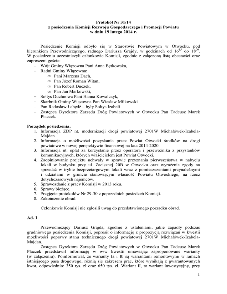 Protokół Nr 31/14 z posiedzenia Komisji Rozwoju Gospodarczego i Promocji Powiatu w dniu 19 lutego 2014 r. Posiedzenie Komisji odbyło się w Starostwie Powiatowym w Otwocku, pod kierunkiem Przewodniczącego, radnego Dariusza Grajdy, w godzinach od 1615 do 1800. W posiedzeniu uczestniczyli członkowie Komisji, zgodnie z załączoną listą obecności oraz zaproszeni goście: − Wójt Gminy Wiązowna Pani Anna Bętkowska, − Radni Gminy Wiązowna: • Pani Marzena Dach, • Pan Józef Roman Witan, • Pan Robert Duczek, • Pan Jan Markowski, − Sołtys Duchnowa Pani Hanna Kowalczyk, − Skarbnik Gminy Wiązowna Pan Wiesław Miłkowski − Pan Radosław Łabędź – były Sołtys Izabeli − Zastępca Dyrektora Zarządu Dróg Powiatowych w Otwocku Pan Tadeusz Marek Płaczek. Porządek posiedzenia: 1. Informacja ZDP nt. modernizacji drogi powiatowej 2701W Michałówek-IzabelaMajdan. 2. Informacja o możliwości pozyskania przez Powiat Otwocki środków na drogi powiatowe w nowej perspektywie finansowej na lata 2014-2020. 3. Informacja nt. opłat za korzystanie przez operatora i przewoźnika z przystanków komunikacyjnych, których właścicielem jest Powiat Otwocki. 4. Zaopiniowanie projektu uchwały w sprawie przyznania pierwszeństwa w nabyciu lokali w budynku przy ul. Zacisznej 20B w Otwocku oraz wyrażenia zgody na sprzedaż w trybie bezprzetargowym lokali wraz z pomieszczeniami przynależnymi i udziałami w gruncie stanowiącym własność Powiatu Otwockiego, na rzecz dotychczasowych najemców. 5. Sprawozdanie z pracy Komisji w 2013 roku. 6. Sprawy bieżące. 7. Przyjęcie protokołów Nr 29-30 z poprzednich posiedzeń Komisji. 8. Zakończenie obrad. Członkowie Komisji nie zgłosili uwag do przedstawionego porządku obrad. Ad. 1 Przewodniczący Dariusz Grajda, zgodnie z ustaleniami, jakie zapadły podczas grudniowego posiedzenia Komisji, poprosił o informację z propozycją rozwiązań w kwestii możliwości poprawy stanu technicznego drogi powiatowej 2701W Michałówek-IzabelaMajdan. Zastępca Dyrektora Zarządu Dróg Powiatowych w Otwocku Pan Tadeusz Marek Płaczek przedstawił informację w w/w kwestii omawiając zaproponowane warianty (w załączeniu). Poinformował, że warianty Ia i Ib są wariantami remontowymi w ramach istniejącego pasa drogowego, różnią się zakresem prac, które wynikają z gwarantowanych kwot, odpowiednio: 350 tys. zł oraz 650 tys. zł. Wariant II, to wariant inwestycyjny, przy 1 czym wykonanie inwestycji uzależnione jest od przeprowadzenia wykupów gruntów pod poszerzenie pasa drogowego drogi powiatowej Nr 2701W w miejscowościach: Majdan, Izabela, Michałówek, Duchnów. Łączna wartość wykupu gruntów szacowana jest na ponad 2 mln zł. Dyrektor powiedział, że wykonanie 1 km drogi w wariancie inwestycyjnym, to kwota w wysokości 2.230.000 zł. Według posiadanej dokumentacji do wybudowania pozostaje 3932 mb drogi, co daje łączną wartość blisko 9 mln zł, a z uwzględnieniem wykupu gruntów pod poszerzenie pasa drogowego kwotę ok. 10 mln zł. Wójt Gminy Wiązowna Anna Bętkowska odczytała notatkę ze spotkania w dniu 17 lutego br. z Wicestarostą Mirosławem Pszonką w sprawie realizacji zadania inwestycyjnego – remont drogi powiatowej Nr 2701W na terenie Gminy Wiązowna. Poinformowała o przyjętych ustaleniach, mianowicie, że: 1) nastąpi rezygnacja z wykonania zadania pt. „Projekt budowlano-wykonawczy budowy drogi Nr 2701W” w ramach specustawy; 2) zostanie podjęte działanie w celu przygotowania dokumentacji technicznej budowy drogi, zgodnie z prawem budowlanym; 3) Gmina Wiązowna i Sołectwo Izabela zobowiązują się do przygotowania dokumentów celem nieodpłatnego, notarialnego przekazania gruntów, jako darowiznę pod budowę drogi na budowę drogi według dokumentacji opisanej w pkt. 1; 4) Gmina Wiązowna, Sołectwo Izabela i Radny Andrzej Cholewa zobowiązują się w terminie do końca marca br. przekazać Powiatowi Otwockiemu oświadczenia o przekazaniu gruntów dla Powiatu Otwockiego, jako nieodpłatne darowizny mieszkańców, właścicieli. Po otrzymaniu oświadczeń Powiat Otwocki, ZDP przedstawi Gminie Wiązowna harmonogram realizacji zadania, o którym mowa w w/w notatce. Zastępca Dyrektora ZDP nadmienił, iż intencją spotkania było podjęcie pewnych ustaleń, dzięki którym będzie możliwe rozpoczęcie inwestycji. Biorąc pod uwagę sumy przedstawione podczas dzisiejszego posiedzenia na wykonanie całej inwestycji, czyli blisko 11 mln zł, to na chwilę obecną projekt nie ma szansy powodzenia z uwagi na brak środków finansowych. Wartość wykupu gruntów jest znacząca (ponad 2 mln zł). Nieodpłatne przekazanie na rzecz Powiatu gruntów pozwoliłoby na przystąpienie Powiatu oraz Gminy do wspólnej realizacji zadania. Dyrektor powiedział, że obecnie można byłoby wysypać sam tłuczeń, przy zaniżeniu terenu, ale nie wbudowując krawężników i nie budując zjazdów. Jednakże wykonanie tego rodzaju prac nie rozwiąże tematu, nie wszyscy będą usatysfakcjonowani z takiego obrotu spraw. Powiat w tegorocznym budżecie ma zabezpieczone 150 tys. zł, natomiast Gmina – 300 tys. zł, z czego 200 tys. zł podzielone jest na pół i w dodatku zaskarżone. Wójt Gminy Wiązowna Anna Bętkowska powiedziała, że w budżecie Gminy na 2014 rok są zabezpieczone środki finansowe na drogę 2701W, mianowicie zgodnie z planem: Góry Warszawskie (w Duchnowie) 100 tys. zł, Izabela 100 tys. zł, jak również dodatkowe środki na ul. Widoczną w Majdanie. Dodała, że doszło do takiej sytuacji, że mieszkańcy Izabeli porównali się z Duchnowem konfrontując ruch, jaki jest na drodze. Radny Andrzej Cholewa, który posiada dane z badania natężenia ruchu, podczas sesji Rady Gminy stwierdził, że zaproponowane przez Gminę środki po 100 tys. zł na pomoc Powiatowi z przeznaczeniem na drogę powiatową w miejscowościach Izabela i Duchnów, powinny zostać przeznaczone w całości (200 tys. zł) na dr