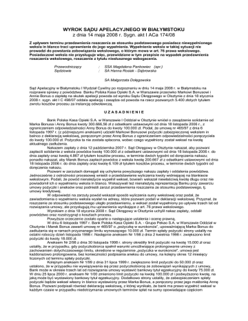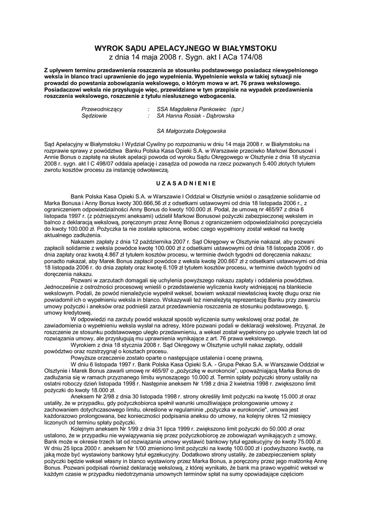 WYROK SĄDU APELACYJNEGO W BIAŁYMSTOKU z dnia 14 maja 2008 r. Sygn. akt I ACa 174/08 Z upływem terminu przedawnienia roszczenia ze stosunku podstawowego posiadacz niewypełnionego weksla in blanco traci uprawnienie do jego wypełnienia. Wypełnienie weksla w takiej sytuacji nie prowadzi do powstania zobowiązania wekslowego, o którym mowa w art. 76 prawa wekslowego. Posiadaczowi weksla nie przysługuje więc, przewidziane w tym przepisie na wypadek przedawnienia roszczenia wekslowego, roszczenie z tytułu niesłusznego wzbogacenia. Przewodniczący Sędziowie : : SSA Magdalena Pankowiec (spr.) SA Hanna Rosiak - Dąbrowska SA Małgorzata Dołęgowska Sąd Apelacyjny w Białymstoku I Wydział Cywilny po rozpoznaniu w dniu 14 maja 2008 r. w Białymstoku na rozprawie sprawy z powództwa Banku Polska Kasa Opieki S.A. w Warszawie przeciwko Markowi Bonusowi i Annie Bonus o zapłatę na skutek apelacji powoda od wyroku Sądu Okręgowego w Olsztynie z dnia 18 stycznia 2008 r. sygn. akt I C 498/07 oddala apelację i zasądza od powoda na rzecz pozwanych 5.400 złotych tytułem zwrotu kosztów procesu za instancję odwoławczą. UZASADNIENIE Bank Polska Kasa Opieki S.A. w Warszawie I Oddział w Olsztynie wniósł o zasądzenie solidarnie od Marka Bonusa i Anny Bonus kwoty 300.666,56 zł z odsetkami ustawowymi od dnia 18 listopada 2006 r., z ograniczeniem odpowiedzialności Anny Bonus do kwoty 100.000 zł. Podał, że umową nr 465/97 z dnia 6 listopada 1997 r. (z późniejszymi aneksami) udzielił Markowi Bonusowi pożyczki zabezpieczonej wekslem in balnco z deklaracją wekslową, poręczonym przez Annę Bonus z ograniczeniem odpowiedzialności poręczyciela do kwoty 100.000 zł. Pożyczka ta nie została spłacona, wobec czego wypełniony został weksel na kwotę aktualnego zadłużenia. Nakazem zapłaty z dnia 12 października 2007 r. Sąd Okręgowy w Olsztynie nakazał, aby pozwani zapłacili solidarnie z weksla powódce kwotę 100.000 zł z odsetkami ustawowymi od dnia 18 listopada 2006 r. do dnia zapłaty oraz kwotą 4.867 zł tytułem kosztów procesu, w terminie dwóch tygodni od doręczenia nakazu; ponadto nakazał, aby Marek Bonus zapłacił powódce z weksla kwotę 200.667 zł z odsetkami ustawowymi od dnia 18 listopada 2006 r. do dnia zapłaty oraz kwotę 6.109 zł tytułem kosztów procesu, w terminie dwóch tygodni od doręczenia nakazu. Pozwani w zarzutach domagali się uchylenia powyższego nakazu zapłaty i oddalenia powództwa. Jednocześnie z ostrożności procesowej wnieśli o przedstawienie wyliczenia kwoty widniejącej na blankiecie wekslowym. Podali, że powód nienależycie wypełnił weksel, bowiem wskazał niewłaściwą kwotę długu oraz nie powiadomił ich o wypełnieniu weksla in blanco. Wskazywali też nienależytą reprezentację Banku przy zawarciu umowy pożyczki i aneksów oraz podnieśli zarzut przedawnienia roszczenia ze stosunku podstawowego, tj. umowy kredytowej. W odpowiedzi na zarzuty powód wskazał sposób wyliczenia sumy wekslowej oraz podał, że zawiadomienia o wypełnieniu weksla wysłał na adresy, które pozwani podali w deklaracji wekslowej. Przyznał, że roszczenie ze stosunku podstawowego uległo przedawnieniu, a weksel został wypełniony po upływie trzech lat od rozwiązania umowy, ale przysługują mu uprawnienia wynikające z art. 76 prawa wekslowego. Wyrokiem z dnia 18 stycznia 2008 r. Sąd Okręgowy w Olsztynie uchylił nakaz zapłaty, oddalił powództwo oraz rozstrzygnął o kosztach procesu. Powyższe orzeczenie zostało oparte o następujące ustalenia i ocenę prawną. W dniu 6 listopada 1997 r. Bank Polska Kasa Opieki S.A. - Grupa Pekao S.A. w Warszawie Oddział w Olsztynie i Marek Bonus zawarli umowę nr 465/97 o „pożyczkę w eurokoncie”, upoważniającą Marka Bonus do zadłużania się w ramach przyznanego limitu wynoszącego 10.000 zł. Termin spłaty pożyczki strony ustaliły na ostatni roboczy dzień listopada 1998 r. Następnie aneksem Nr 1/98 z dnia 2 kwietnia 1998 r. zwiększono limit pożyczki do kwoty 18.000 zł. Aneksem Nr 2/98 z dnia 30 listopada 1998 r. strony określiły limit pożyczki na kwotę 15.000 zł oraz ustaliły, że w przypadku, gdy pożyczkobiorca spełnił warunki umożliwiające prolongowanie umowy z zachowaniem dotychczasowego limitu, określone w regulaminie „pożyczka w eurokoncie", umowa jest każdorazowo prolongowana, bez konieczności podpisania aneksu do umowy, na kolejny okres 12 miesięcy liczonych od terminu spłaty pożyczki. Kolejnym aneksem Nr 1/99 z dnia 31 lipca 1999 r. zwiększono limit pożyczki do 50.000 zł oraz ustalono, że w przypadku nie wywiązywania się przez pożyczkobiorcę ze zobowiązań wynikających z umowy, Bank może w okresie trzech lat od rozwiązania umowy wystawić bankowy tytuł egzekucyjny do kwoty 75.000 zł. W dniu 25 lipca 2000 r. aneksem Nr 1/00 zmieniono limit pożyczki na kwotę 100.000 zł i podwyższono kwotę, na jaką może być wystawiony bankowy tytuł egzekucyjny. Dodatkowo strony ustaliły, że zabezpieczeniem spłaty pożyczki będzie weksel własny in blanco wystawiony przez Marka Bonus, a poręczony przez jego małżonkę Annę Bonus. Pozwani podpisali również deklarację wekslową, z której wynikało, że bank ma prawo wypełnić weksel w każdym czasie w przypadku niedotrzymania umownych terminów spłat na sumy opowiadające częściom wykorzystanego, a nie spłaconego przez pozwanych kredytu wraz odsetkami, prowizją i innymi należnościami banku. Pozwani zobowiązali się również do każdorazowego informowania powoda o zmianie adresu. Umowy pożyczki, jak i późniejsze aneksy z pozwanym, w imieniu powodowego banku zawierały osoby do tego umocowane. Marek Bonus nie spłacił udzielonej mu pożyczki, wobec czego Bank PKO S. A., w dniu 30 października 2006 r. wypełnił weksel in blanco. Weksel został opatrzony datą wystawienia, którą stanowiła data podpisania deklaracji wekslowej, tj. 25 lipca 2000 r., data płatności sumy