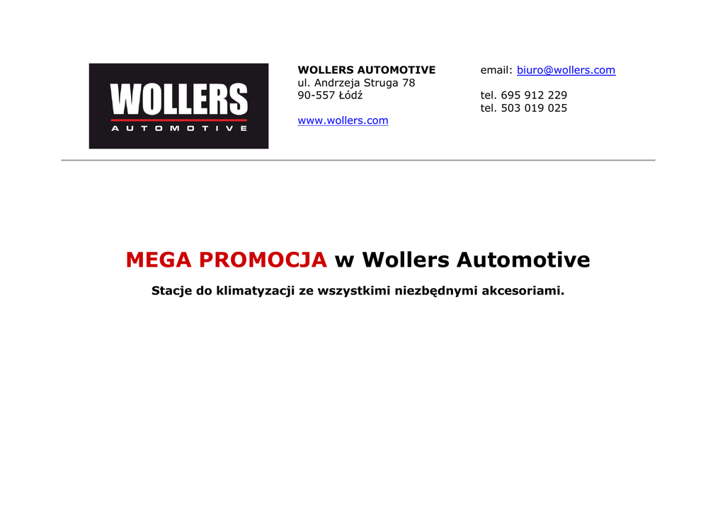 WOLLERS AUTOMOTIVE ul. Andrzeja Struga 78 90-557 Łódź email: [email protected] tel. 695 912 229 tel. 503 019 025 www.wollers.com MEGA PROMOCJA w Wollers Automotive Stacje do klimatyzacji ze wszystkimi niezbędnymi akcesoriami. WAECO SmartMate Waeco ASC 1000 cena netto: 9 755 zł cena netto: 12 195 zł Waeco ASC 2000 cena netto: 14 845 zł PODSTAWOWY MODEL AUTOMATYCZNEJ STACJI DO W PEŁNI AUTOMATYCZNA STACJA DO OBSŁUGI Wysokiej klasy urządzenie to suma unikalnego know-how i SERWISOWANIA KLIMATYZACJI Z WSZYSTKIMI KLIMATYZACJI bogactwa doświadczeń firmy WAECO. Skonstruowana z NIEZBĘDNYMI FUNKCJAMI. KOMPAKTOWE, PRZYJAZNE DLA myślą o profesjonalistach, w pełni automatyczna stacja do UŻYTKOWNIKA WZORNICTWO. W pełni automatyczna stacja do obsługi klimatyzacji dla obsługi klimatyzacji ASC 2000 w samochodach ciężarowych i wszystkich specjalistów w tym zakresie. Ta stacja ma osobowych, minimalizuje wysiłek operatora i znacznie - Wykonywanie czynności serwisowych automatycznie lub wszystko, czego potrzeba do przeprowadzania prac skraca czas serwisowania. manualnie „krok po kroku“ serwisowych w zakresie obsługi klimatyzacji - Automatyczna stacja na czynnik R 134a z wielojęzycznym samochodowych. Z funkcją szybkiego uruchamiania Stacja ASC 2000 wykonuje poniższe procesy całkowicie menu i graficznym wyświetlaczem wystarczy wprowadzić ilość czynnika chłodniczego, który ma automatycznie: - Automatyczny test próżniowy zostać podany oraz podać trzy niezbędne dane, aby › Odzyskiwanie i oczyszczanie czynnika chłodniczego - Automatyczne usuwanie gazów nieskraplających się urządzenie automatycznie wykonało wszystkie wymagane › Pomiar ciśnienia w układzie klimatyzacji - Automatyczna kontrola ilości czynnika pozostającego w funkcje. › Odzyskiwanie zużytego oleju przewodach › Odzyskiwanie i oczyszczanie czynnika chłodniczego › Opróżnianie - Wbudowana baza danych pojazdów › Pomiar ciśnienia w układzie klimatyzacji › Kontrola szczelności - Wbudowane oprogramowanie do płukania układu › Odzyskiwanie zużytego oleju › Podawanie świeżego oleju i dodatku UV klimatyzacji › Opróżnianie › Podawanie czynnika chłodniczego z kompensacją ilości › Kontrola szczelności czynnika w elastycznych przewodach serwisowych - Manometry wysokiego i niskiego ciśnienia oraz manometr › Podawanie świeżego oleju i dodatku UV ciśnienia w zbiorniku › Podawanie czynnika chłodniczego z kompensacją ilości Ponadto urządzenie ASC 2000 posiada: - Automatyczne zawory elektromagnetyczne czynnika w elastycznych przewodach serwisowych › Zbiornik na czynnik chłodniczy o dużej pojemności (21 kg) - Pojemność zbiornika na czynnik: 9 kg › Wszystkie fazy procesu są w pełni automatyczne i › Pokrowiec w komplecie - Pas podgrzewający zbiornik w standardzie monitorowane przez system. Błędy są wskazywane przez › System precyzyjnego zarządzania olejem z 3 oddzielnymi - Wydajność pompy próżniowej: 100 l/min sygnały akustyczne i wizualne na wskaźnikach wagami - Moc kompresora: 1060 W zamocowanych na przegubie. - Chłodzony wentylatorem skraplacz - Wytrzymała metalowa obudowa - Filtr z osuszaczem - Wytrzymała metalowa obudowa - Pojemność zbiornika na czynnik chłodniczy21 kg, - 2 zbiorniki na olej (nowy i zużyty) - Pojemność zbiornika na czynnik chłodniczy: 10 kg, - pojemność pompy próżniowej: 5 pojazdów/godz. - Przewody ciśnieniowe o dł. 3 m w zestawie - wydajność pompy próżniowej: 4 pojazdy/godz. - Opatentowany układ dozowania świeżego oleju i dodatku - Pomiar temperatury czynnika w zbiorniku - Opcja: opatentowany układ dozowania świeżego oleju i uV z butelkami testowymi - Dokładność wagi czynnika chłodniczego: 5% dodatku uV - Wydruk ważnych danych serwisowych, możliwość wielu - Wydruk ważnych danych serwisowych, możliwość wielu wydruków wydruków - Pokrowiec w komplecie - W pełni automatyczne odzyskiwanie czynnika - W pełni automatyczne odzyskiwanie czynnika chłodniczego, zarządzanie olejem i dodatkami chłodniczego, zarządzanie olejem i dodatkami - Automatyczny test próżniowy - Automatyczny test próżniowy - Automatyczne dozowanie dodatku UV wykrywającego - Automatyczna dozowanie dodatku UV wykrywającego nieszczelności nieszczelności - zintegrowane zarządzanie dozowaniem czynnika - zintegrowane zarządzanie dozowaniem czynnika chłodniczego i odzyskiwanymi ilościami chłodniczego i odzyskiwanymi ilościami - Zintegrowana baza danych serwisowych dla różnych - Zintegrowana baza danych serwisowych dla różnych modeli samochodów modeli samochodów - Zgodność z normami SAE J 2099 i SAE J 2788 - Zgodność z normami SAE J 2099 i SAE J 2788 - Spersonalizowana baza danych ilości podawania: - Spersonalizowana baza danych ilości podawania - Wskazówki dla operatora na dużym wyświetlaczu i - Wskazówki dla operatora na dużym wyświetlaczu i manometrze manometrze - Wskaźniki z manometrami zamocowane na przegubie - Wskaźniki z manometrami zamocowane na przegubie - Podgrzewany zbiornik na czynnik chłodniczy do szybkiego - Podgrzewany zbiornik na czynnik chłodniczy do szybkiego napełniania, podgrzewanie jest możliwe również podczas napełniania, podgrzewanie jest możliwe również podczas procesu napełniania procesu napełniania - Specjalna platforma ważąca zamontowana na 8 elastycznych poduszkach - Specjalna funkcja przepłukiwania klimatyzacji - Duża półka na narzędzia - Odpowiednia również dla niemieckich pojazdów hybrydowych - Pojemnik 500 ml na zużyty olej z dłuższym terminem wymiany - Specjalna platforma ważąca zamontowana na 8 elastycznych poduszkach - Specjalna funkcja przepłukiwania klimatyzacji - Duża półka na narzędzia - Pojemnik 500 ml na zużyty olej z dłuższym terminem wymiany - Odpowiednia również dla niemieckich pojazdów hybrydowych Do każdego z powyższych urządzeń otrzymają Państwo: Uruchomienie i szkolenie z obsługi urządzenia oraz 