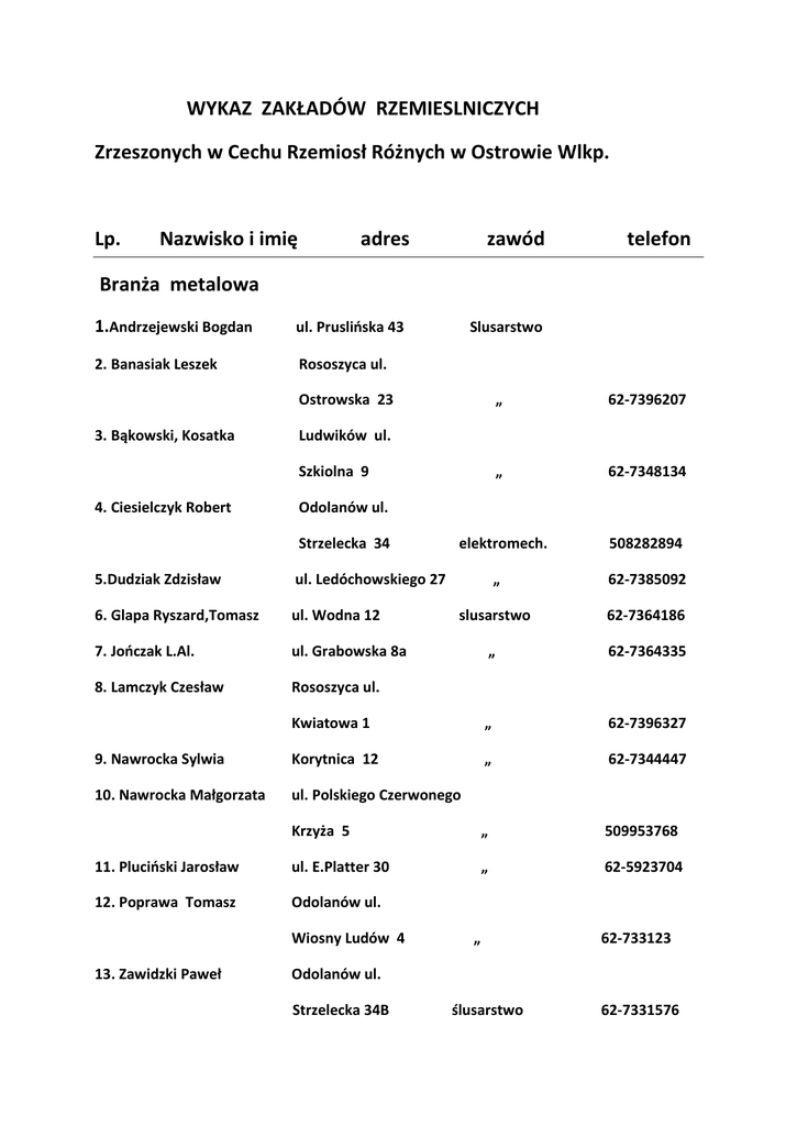 WYKAZ ZAKŁADÓW RZEMIESLNICZYCH Zrzeszonych w Cechu Rzemiosł Różnych w Ostrowie Wlkp. Lp. Nazwisko i imię adres zawód telefon Branża metalowa 1.Andrzejewski Bogdan ul. Pruslińska 43 2. Banasiak Leszek Rososzyca ul. Slusarstwo Ostrowska 23 3. Bąkowski, Kosatka „ 62-7396207 „ 62-7348134 elektromech. 508282894 Ludwików ul. Szkiolna 9 4. Ciesielczyk Robert Odolanów ul. Strzelecka 34 5.Dudziak Zdzisław ul. Ledóchowskiego 27 „ 62-7385092 6. Glapa Ryszard,Tomasz ul. Wodna 12 slusarstwo 62-7364186 7. Jończak L.Al. ul. Grabowska 8a „ 62-7364335 8. Lamczyk Czesław Rososzyca ul. Kwiatowa 1 „ 62-7396327 9. Nawrocka Sylwia Korytnica 12 „ 62-7344447 10. Nawrocka Małgorzata ul. Polskiego Czerwonego Krzyża 5 „ 509953768 11. Pluciński Jarosław ul. E.Platter 30 „ 62-5923704 12. Poprawa Tomasz Odolanów ul. Wiosny Ludów 4 13. Zawidzki Paweł „ 62-733123 Odolanów ul. Strzelecka 34B ślusarstwo 62-7331576 Branża Motoryzacyjna 1.Danielak Marian Skalmierzyce ul. Dąbkowa 11A 2. Filipek Hieronim 62-7621070 mechanika poj. 62-7203899 Janków Przyg. Ul. Sosnowa 8 3. Garcarek Jan.Andrzej elektromech.poj. Ociąż, ul. Ostrowska 6 „ 62-7629200 4. Glinkowski Marian Topola Mala 41A „ 62-7346741 5. Golicki Eugeniusz Latowice ul. Zielona 2A elektromech.poj. 62-7396466 6. Herbik Paweł Sliwniki ul. Nowa 43 mechanika poj. 62-7621750 7. Idzikowski Bolesław Lamki „ 62-7349211 8. Jurasik Jarosław ul. Prof..Kaliny 18 „ 691261277 9. Kołodziej Stanisław ul. Sowińskiego 54 „ 62-7365249 10. Kowalski Mieczysław ul. Limanowskiego 103 „ 62-7371665 11. Kusiński Sławomir ul. MJodrzewiowa 20 „ 62-7382945 12. Kwiatkowski Paweł ul. Wrocławska 234 elektromech.poj. 62-7351330 13. Lesniak G.Z. ul. Klasztorna 2a mechanika poj. 62-7364102 14.Lisiecki Piotr ul. Okopowa 5 elektromech.poj. 62-7351280 15. Maciejewscy s.c. ul. Krotoszyńska 95 mechanika poj. 62-7355066 16. Mocek Sławoń Granowiec ul. Pilarska 12 „ 62-7391231 17. Morisson Mirosław ul. Chopina 3 „ 62-5928092 18. Pieprzka Marcin Raczyce ul. Odolanowska 185 mechanika poj. 693379362 19.lRatajek Zbigniew Odolanów ul. Strzelecka 14 „ 62-7332285 20.Suchorski Roman ul. Wusocka 15 „ 62-7366011 21. Szkudłabski Zbigniew ul. Wysocka 55 „ 62-7365303 22. Sztukowski Ryszard Huta 2 blacharstwo poj. 62-7331405 23. Wawrzyniak Robert Węgry 4 mechanika poj. 62-7623252 24. Woźniak Dariusz ul. Długa 64 „ 62-7356784 25. Zawidzki Remigiusz Kaczory ul. Rzemieslnicza 3 lakiernik poj. 62-7332275 26. Zdunek Władysław ul. Łąkowa 21 mechanika poj. 62-7368515 27. Zdunek Zdzisław ul. Łąkowa 19 lakiernik poj. 62-7367089 28.Zybała Jan Raczyce ul. Lesna 5 mechanika poj. 29. Woźniczak Mirosław Rososzyca ul. Kwiatowa 18 30. Wróblewski Mieczysław ul. Wiklinowa 23 31.Zaradny Wojciech 508264716 blach.pojazdowe 627368887 mech.pojazdowy 608869646 Radłów, ul. Krotoszyńska 41 32.Grzela Tomasz „ 62-7332842 Topola Mała ul. Odolanowska 20 „ Branża Drzewna 1.Adaszak Feliks Skalm.Osada 25 2.Cierniewski Mariusz Koryta 66 3. Ćwiertniak Dominik Odolanów, ul. 4. Doktór Tadeusz stolarstwo „ 62-7621092 663916565 Wiatraczna 23 „ Swieca 55 „ 62-7332637 5. Kaczmarek Józef Sieroszewice ul. Nowa 5 6. Kardas Maria tapicerstwo 62-7396401 stolarstwo 62-5926453 Wysocko Małe, ul. Koscielna 14 7.Kostrzewski Paweł ul. Wenecja 45 8. Larek Rafał Lamki 48c 9. Molka Mirosław Szczury 88 „ 60212755 10. Nawrocki Aleksander ul. Batorego 17 „ 62-7362850 11. Pasiak Roman Ołobok ul. „ 62-7390302 „ 693334167 Brylińskiego 15 12. Prokop Andrzej stolarstwo 62-7371780 62-7349306 Odolanów ul. Krótka 5 13. Skurzewski Robert „ Przygodzice ul. Wrocławska 122 tapicerstwo 62-7366395 14. Smętek Robert Franklinów 21 stoolarstwo 62-7350674 15. Stachurski Mirosław ul. Bukowa 23 16. Sniady Jan Uciechów ul. Nowa 8 „ 62-7385319 „ 62-7332603 17. Urban Eugeniusz ul. Jarzębinowa 12 tapicerstwo 62-7385324 18. Woźniak Marek Boników ul. Spacerowa 1 stolarstwo 505357936 19. Zybała Grzegorz Wysocko Małe ul. Górna 10 „ 62-5929268 Branża Spożywcza 1.Antczak Roman ul. Bratnia 26 wędliniarstwo 62-7365308 2. Dzióbek Andrzej Skalmierzyce ul. Powstańców Wlkp. 6 cukiernictwo 62-7621425 3.Janicki Roman ul. Kolejowa 26 piekarstwo 607730520 4.Jaźwiec Teresa Masanów ul. Ceglana 4 cukiernictwo 6. Musialska Jolanta ul. 3 Maja 32 7. Nowacka Renata Szczurawice 54 cukiernictwo 602792013 8. Przerwa Jan ul. Topolowa 124 cukiernictwo 62-7368861 9. Stasiak Piotr Skalmierzyce ul. cukiernictwo 62-7622699 piekarstwo 62-7622367 „ 500176567 Kaliska 36 10. Walczak Andrzej 604089721 Skalmierzyce ul. Ostrowska 30 11. Wieczorek Z.K. ul. Odolanowska 42 12. Zawidzki Ryszard Odolanów ul. Kaliska 9 13. Szczeblewski Zbigniew ul. Strzelecka 119 Branża Budowlana „ cukiernictwo „ 62-7331538 62-7361533 1.Bugajski Jan Raszków ul. Powstańców Wlkp. 5 2.Fischer Wojciech malarstwo 605690457 Odolanów, ul. Ceglana 5 „ 3.Dutkowski Maciej ul. Slusarska 6 inst.sanitarny 604471617 4. Garncarek Marcin ul. Polna 19 malarstwo 506851454 5. Goliński Józef ul. Zana 12B/7 murarstwo 606857316 6. Gremblewski Andrzej Odolanów, ul. Krotoszyńska 127A 7. Grobelny Tomasz ul. Rejtana 8 8. Kaczmarek Andrzej Dzierżanów 29 9. Kałmucki Roman Radłów, ul. inst.sanitarne „ inst.sanitarne Truskawkowa 1 malarstwo 606228392 10. Kasprzak Andrzej Lewkow, ul. Krótka 17 murarstwo 601922088 11. Kasprzak Marek Kaczory, ul. Raszkowska 12 12. Kasprzak Tomasz „ 627332493 „ 601891632 Sieroszewice, ul. Ostrowska 56 13. Krajewski Stanisław Moszczanka 110 inst.sanitarny 62-7343833 14. Krause Artur ul. Olszynowa 12 eketryk 604660503 15. Kuroszczyk Stanisław ul. Limbowa 35 malarstwo 607407760 16. Kupiec Robert Kaczory ul. Milenijna 1 17. Malesa Jan ul. Smigielskiego 14a 18. Mus Andrzej Odolanów, ul. Krotoszyńska 9A „ murarstwo 627351552 elektryk 602462651 19. Nędzyński Damian Odolanów, ul. L.Namysł 29 malarstwo 20. Nowak Wojciech Jaskółki 3a 21. Nowicki Roman ul. Grabowska 93 i