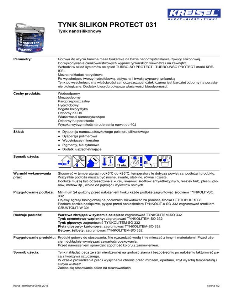 TYNK SILIKON PROTECT 031 Tynk nanosilikonowy Parametry: Gotowa do użycia barwna masa tynkarska na bazie nanocząsteczkowej żywicy silikonowej. Do wykonywania cienkowarstwowych wypraw tynkarskich wewnątrz i na zewnątrz. Wchodzi w skład systemów ociepleń TURBO-SO PROTECT i TURBO-WSO PROTECT marki KREISEL Można nakładać natryskowo Po wyschnięciu tworzy hydrofobową, elstyczną i trwałą wyprawę tynkarską Tynk po wyschnięciu ma właściwości samoczyszczące, dzięki czemu jest bardziej odporny na porastanie biologiczne. Dodatek biocydu polepsza właściwości bioodporności. Cechy produktu: Wodoodporny Mrozoodporny Paroprzepuszczalny Hydrofobowy Bogata kolorystyka Odporny na UV Właściwości samoczyszczące Odporny na porastanie Wysoka wytrzymałość na uderzenia nawet do 40J Skład: ● ● ● ● ● Dyspersja nanocząsteczkowego polimeru silikonowego Dyspersja polimerowa Wypełniacze mineralne Pigmenty, biel tytanowa Dodatki uszlachetniające Sposób użycia: Warunki wykonywania prac: Stosować w temperaturach od+5°C do +25°C, temperatury te dotyczą powietrza, podłoża i produktu. Wszystkie podłoża muszą być nośne, zwarte, stabilne, równe i czyste. Podłoża muszą być oczyszczone z kurzu, smarów, środków antyadhezyjnych, resztek farb, pleśni, glonów, mchów itp., wolne od pęknięć i wykwitów solnych Przygotowanie podłoża: Minimum 24 godziny przed nałożeniem tynku każde podłoże zagruntować środkiem TYNKOLIT-SO 332 Objawy agresji biologicznej na podłożach zlikwidować za pomocą środka SEPTOBUD 1008. Podłoża bardzo nasiąkliwe, pylące przed naniesieniem TYNKOLIT-u SO 332 zagruntować środkiem GRUNTOLIT-W 301 Rodzaje podłoża: Warstwa zbrojąca w systemie ociepleń: zagruntować TYNKOLITEM-SO 332 Tynk cementowo-wapienny: zagruntować TYNKOLITEM-SO 332 Tynk gipsowy: zagruntować TYNKOLITEM-SO 332 Płyta gipsowo- kartonowa: zagruntować TYNKOLITEM-SO 332 Betony, żelbety: zagruntować TYNKOLITEM-SO 332 Przygotowanie produktu: Produkt gotowy do stosowania. Nie rozrzedzać wodą i nie mieszać z innymi materiałami. Przed użyciem dokładnie wymieszać zawartość opakowania. Przed nanoszeniem sprawdzić zgodność koloru z zamówieniem. Sposób użycia: Karta techniczna 08.06.2015 Tynk nakładać pacą ze stali nierdzewnej na grubość ziarna i bezpośrednio po nałożeniu fakturować pacą z tworzywa sztucznego. W czasie prowadzenia prac i wysychania chronić przed mrozem, opadami, zbyt wysoką temperaturą i silnym wiatrem. Zaleca się stosowanie osłon na rusztowaniach strona 1/2 TYNK SILIKON PROTECT 031 Tynk nanosilikonowy W celu wyrównania barwy i struktury tynków zaleca się, aby w trakcie ich nanoszenia nie dopuszczać do całkowitego opróżnienia kubła z masą tynkarską, lecz uzupełniać go po opróżnieniu do połowy świażą masą z nowego kubła i starannie wymieszać obie cześci. Uwagi wykonawcze: Należy stosować pełen zestaw wyrobów systemu ociepleń. Na jednej płaszczyźnie stosować tynki z jednej szarży produkcyjnej. Daną płaszczyznę wykonywać w sposób ciągły, metodą "mokre na mokre" aby uniknąć widocznych połączeń. Pod tynki kolorowe stosować odpowiednio zabarwiony podkład tynkarski. W przypadku systemów ocieplania ścian, przy układaniu tynku na dużych powierzchniach elewacji, zaleca się stosowanie barw o współczynniku jasności (odbicia rozproszonego) nie mniejszym niż 25%. Wartości tego współczynnika podane są we wzorniku barw tynków i farb firmy KREISEL. Przechowywanie: Maksymalnie 12 miesięcy W miejscach suchych, w nie uszkodzonych opakowaniach fabrycznych i temperaturze od +5°C do +25°C. Parametry techniczne Orientacyjne zużycie Uziarnienie 2 2 2 drapany 1,5mm - ok. 1,7kg/m ; 2,0mm - ok. 2,4kg/m ; 3,0mm - ok. 3,7kg/m ; 2 2 2 baranek 1,5mm - ok. 2,4kg/m ; 2,0mm - ok. 3,4kg/m ; 3,0mm - ok. 5,0kg/m 1,5mm lub 2,0mm lub 3,0mm Czas wysychania od 12 do 48 godzin Wskazówki ogólne: Ta karta zastępuje wszystkie poprzednie wersje. Informacje zawarte w niniejszej karcie technicznej reprezentuje naszą aktualną wiedzę i praktyczne doświadczenie. Są to jedynie ogólne informacje i nie stanowią o odpowiedzialności producenta za wykonawstwo i sposób użytkowania. Mogą bowiem występować różnice i specyficzne warunki sposobu wykonania. Produkt należy stosować zgodnie z wymaganą wiedzą techniczną, oraz zasadami BHP. Należy unikać kontaktu ze skórą oraz chronić oczy. W przypadku kontaktu z oczami, przemyć je obficie czystą wodą i zasięgnąć porady lekarza. Zaleca się używanie rękawic, okularów i odzieży ochronnej. Karta techniczna 08.06.2015 strona 2/2