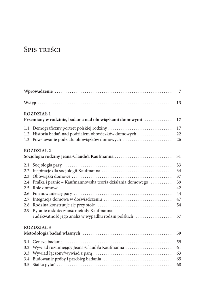 Spis treści Wprowadzenie . . . . . . . . . . . . . . . . . . . . . . . . . . . . . . . . . . . . . . . . . . . . . . . . . . . . . . . 7 Wstęp . . . . . . . . . . . . . . . . . . . . . . . . . . . . . . . . . . . . . . . . . . . . . . . . . . . . . . . . . . . . . . . 13 ROZDZIAŁ 1 Przemiany w rodzinie, badania nad obowiązkami domowymi . . . . . . . . . . . . . 17 1.1. Demograficzny portret polskiej rodziny . . . . . . . . . . . . . . . . . . . . . . . . . . . . . . 1.2. Historia badań nad podziałem obowiązków domowych . . . . . . . . . . . . . . . . 1.3. Powstawanie podziału obowiązków domowych . . . . . . . . . . . . . . . . . . . . . . . 17 22 26 ROZDZIAŁ 2 Socjologia rodziny Jeana-Claude’a Kaufmanna . . . . . . . . . . . . . . . . . . . . . . . . . . . 31 2.1. 2.2. 2.3. 2.4. 2.5. 2.6. 2.7. 2.8. 2.9. Socjologia pary . . . . . . . . . . . . . . . . . . . . . . . . . . . . . . . . . . . . . . . . . . . . . . . . . . . Inspiracje dla socjologii Kaufmanna . . . . . . . . . . . . . . . . . . . . . . . . . . . . . . . . . Obowiązki domowe . . . . . . . . . . . . . . . . . . . . . . . . . . . . . . . . . . . . . . . . . . . . . . . Pralka i pranie – Kaufmannowska teoria działania domowego . . . . . . . . . . Role domowe . . . . . . . . . . . . . . . . . . . . . . . . . . . . . . . . . . . . . . . . . . . . . . . . . . . . Formowanie się pary . . . . . . . . . . . . . . . . . . . . . . . . . . . . . . . . . . . . . . . . . . . . . . Integracja domowa w doświadczeniu . . . . . . . . . . . . . . . . . . . . . . . . . . . . . . . . Rodzina konstruuje się przy stole . . . . . . . . . . . . . . . . . . . . . . . . . . . . . . . . . . . Pytanie o skuteczność metody Kaufmanna i adekwatność jego analiz w wypadku rodzin polskich . . . . . . . . . . . . . . . . . 33 34 37 39 42 44 47 54 57 ROZDZIAŁ 3 Metodologia badań własnych . . . . . . . . . . . . . . . . . . . . . . . . . . . . . . . . . . . . . . . . . . 59 3.1. 3.2. 3.3. 3.4. 3.5. 59 61 63 65 68 Geneza badania . . . . . . . . . . . . . . . . . . . . . . . . . . . . . . . . . . . . . . . . . . . . . . . . . . Wywiad rozumiejący Jeana-Claude’a Kaufmanna . . . . . . . . . . . . . . . . . . . . . . Wywiad łączony/wywiad z parą . . . . . . . . . . . . . . . . . . . . . . . . . . . . . . . . . . . . . Budowanie próby i przebieg badania . . . . . . . . . . . . . . . . . . . . . . . . . . . . . . . . Siatka pytań . . . . . . . . . . . . . . . . . . . . . . . . . . . . . . . . . . . . . . . . . . . . . . . . . . . . . . 6 3.6. 3.7. 3.8. 3.9. Spis treści Badani i sytuacja wywiadu . . . . . . . . . . . . . . . . . . . . . . . . . . . . . . . . . . . . . . . . . Rola badaczki . . . . . . . . . . . . . . . . . . . . . . . . . . . . . . . . . . . . . . . . . . . . . . . . . . . . Analiza treści – wytwarzanie teorii . . . . . . . . . . . . . . . . . . . . . . . . . . . . . . . . . . Nasycenie modelu – koniec badań . . . . . . . . . . . . . . . . . . . . . . . . . . . . . . . . . . 69 71 75 77 ROZDZIAŁ 4 Zamieszkanie razem i uwspólnianie przestrzeni . . . . . . . . . . . . . . . . . . . . . . . . . . 79 4.1. 4.2. 4.3. 4.4. 4.5. Para jako proces – początki pary i fazy jej rozwoju . . . . . . . . . . . . . . . . . . . . . 79 Urodzenie dziecka i brak dziecka . . . . . . . . . . . . . . . . . . . . . . . . . . . . . . . . . . . 93 Integracja domowa: jak tworzy się podział obowiązków domowych . . . . . . 103 Taniec wokół zmywarki . . . . . . . . . . . . . . . . . . . . . . . . . . . . . . . . . . . . . . . . . . . . 108 Posiłek – mały teatr rodzinny . . . . . . . . . . . . . . . . . . . . . . . . . . . . . . . . . . . . . . . 122 ROZDZIAŁ 5 Czy można nauczyć się partnerstwa? . . . . . . . . . . . . . . . . . . . . . . . . . . . . . . . . . . . . 149 5.1. O rodzinach pochodzenia i innych grupach odniesienia. Historie rodzinne . . . . . . . . . . . . . . . . . . . . . . . . . . . . . . . . . . . . . . . . . . . . . . . . . 5.2. Prasowanie – walka gestów z ideami. Historie par z żelazkiem w tle . . . . . . 5.3. Kompetencja prania . . . . . . . . . . . . . . . . . . . . . . . . . . . . . . . . . . . . . . . . . . . . . . . 5.3.1. Pranie jako nieświadoma niekompetencja . . . . . . . . . . . . . . . . . . . . . . 5.3.2. Pranie jako świadoma niekompetencja . . . . . . . . . . . . . . . . . . . . . . . . . 5.3.3. Pranie jako świadoma kompetencja . . . . . . . . . . . . . . . . . . . . . . . . . . . . 5.3.4. Pranie jako nieświadoma kompetencja . . . . . . . . . . . . . . . . . . . . . . . . . 5.4. Mąż uczniem żony . . . . . . . . . . . . . . . . . . . . . . . . . . . . . . . . . . . . . . . . . . . . . . . . 5.5. Jak kobieta opiera się równouprawnieniu? Przykład samochodu . . . . . . . . . 5.6. Nowa para i partnerstwo . . . . . . . . . . . . . . . . . . . . . . . . . . . . . . . . . . . . . . . . . . . 149 171 185 187 188 189 190 193 198 201 Zakończenie . . . . . . . . . . . . . . . . . . . . . . . . . . . . . . . . . . . . . . . . . . . . . . . . . . . . . . . . . 213 ZAŁĄCZNIK 1 Opis Par . . . . . . . . . . . . . . . . . . . . . . . . . . . . . . . . . . . . . . . . . . . . . . . . . . . . . . . . . . . . . 221 ZAŁĄCZNIK 2 Rady dla Par . . . . . . . . . . . . . . . . . . . . . . . . . . . . . . . . . . . . . . . . . . . . . . . . . . . . . . . . . 245 ZAŁĄCZNIK 3 Słowniczek . . . . . . . . . . . . . . . . . . . . . . . . . . . . . . . . . . . . . . . . . . . . . . . . . . . . . . . . . . 247 Literatura . . . . . . . . . . . . . . . . . . . . . . . . . . . . . . . . . . . . . . . . . . . . . . . . . . . . . . . . . . . 251