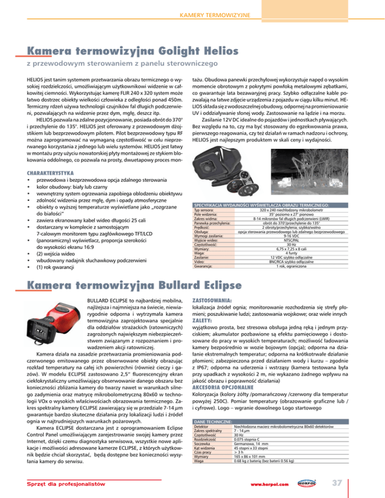 KAMERY TERMOWIZYJNE Kamera termowizyjna Golight Helios z przewodowym sterowaniem z panelu sterowniczego HELIOS jest tanim systemem przetwarzania obrazu termicznego o wysokiej rozdzielczości, umożliwiającym użytkownikowi widzenie w całkowitej ciemności. Wykorzystując kamerę FLIR 240 x 320 system może łatwo dostrzec obiekty wielkości człowieka z odległości ponad 450m. Termiczny rdzeń używa technologii czujników fal długich podczerwieni, pozwalających na widzenie przez dym, mgłę, deszcz itp. HELIOS pozwala na zdalne pozycjonowanie, posiada obrót do 370° i przechylenie do 135°. HELIOS jest oferowany z przewodowym dżojstikiem lub bezprzewodowym pilotem. Pilot bezprzewodowy typu RF można zaprogramować na wymaganą częstotliwość w celu nieprzerwanego korzystania z jednego lub wielu systemów. HELIOS jest łatwy w montażu przy użyciu nowatorskiej płyty montażowej ze stykiem blokowania oddolnego, co pozwala na prosty, dwuetapowy proces mon- tażu. Obudowa panewki przechyłowej wykorzystuje napęd o wysokim momencie obrotowym z pokrytymi powłoką metalowymi zębatkami, co gwarantuje lata bezawaryjnej pracy. Szybko odłączalne kable pozwalają na łatwe zdjęcie urządzenia z pojazdu w ciągu kilku minut. HELIOS składa się z wodoszczelnej obudowy, odpornej na promieniowanie UV i oddziaływanie słonej wody. Zastosowanie na lądzie i na morzu. Zasilanie 12V DC idealne do pojazdów i jednostkach pływających. Bez względu na to, czy ma być stosowany do egzekwowania prawa, pierwszego reagowania, czy też działań w ramach nadzoru i ochrony, HELIOS jest najlepszym produktem w skali ceny i wydajności. CHARAKTERYSTYKA • • • • • • • • • • • przewodowa i bezprzewodowa opcja zdalnego sterowania kolor obudowy: biały lub czarny wewnętrzny system ogrzewania zapobiega oblodzeniu obiektywu zdolność widzenia przez mgłę, dym i opady atmosferyczne obiekty o wyższej temperaturze wyświetlane jako „rozgrzane do białości” zawiera ekranowany kabel wideo długości 25 cali dostarczany w komplecie z samostojącym 7-calowym monitorem typu zagłówkowego TFT/LCD (panoramiczny) wyświetlacz, proporcja szerokości do wysokości ekranu 16:9 (2) wejścia wideo wbudowany nadajnik słuchawkowy podczerwieni (1) rok gwarancji SPECYFIKACJA WYDAJNOŚCI WYŚWIETLACZA OBRAZU TERMICZNEGO: Typ sensora: Pole widzenia: Zakres widma: Panewka przechylenia: Prędkość: Obsługa: Wymogi zasilania: Wyjście wideo: Częstotliwość: Wymiary: Waga: Zasilanie: Video: Gwarancja: 320 x 240 niechłodzony mikrobolometr 35° poziomo x 27° pionowo 8-14 mikronów fal długich podczerwieni (LWIR) obrót do 370°/przechylenie do 135° 2 obroty/przechylenia; szybko/wolno opcja sterowania przewodowego lub zdalnego bezprzewodowego 9-16 VDC NTSC/PAL 30 Hz 6,75 x 7,25 x 8 cali 4 funty 12 VDC szybko odłączalne BNC/RCA szybko odłączalne 1 rok, ograniczona Kamera termowizyjna Bullard Eclipse BULLARD ECLIPSE to najbardziej mobilna, najlżejsza i najmniejsza na świecie, niewiarygodnie odporna i wytrzymała kamera termowizyjna zaprojektowana specjalnie dla oddziałów strażackich (ratowniczych) zagrożonych największym niebezpieczeństwem związanym z rozpoznaniem i prowadzeniem akcji ratowniczej. Kamera działa na zasadzie przetwarzania promieniowania podczerwonego emitowanego przez obserwowane obiekty obrazując rozkład temperatury na całej ich powierzchni (również cieczy i gazów). W modelu ECLIPSE zastosowano 2,5” fluorescencyjny ekran ciekłokrystaliczny umożliwiający obserwowanie danego obszaru bez konieczności zbliżania kamery do twarzy nawet w warunkach silnego zadymienia oraz matrycę mikrobolometryczną 80x60 w technologii VOx o wysokich właściwościach obrazowania termicznego. Zakres spektralny kamery ECLIPSE zawierający się w przedziale 7-14 μm gwarantuje bardzo skuteczne działania przy lokalizacji ludzi i źródeł ognia w najtrudniejszych warunkach pożarowych. Kamera ECLIPSE dostarczana jest z oprogramowaniem Eclipse Control Panel umożliwiającym zarejestrowanie swojej kamery przez Internet, dzięki czemu diagnostyka serwisowa, wszystkie nowe aplikacje i możliwości adresowane kamerze ECLIPSE, z których użytkownik będzie chciał skorzystać, będą dostępne bez konieczności wysyłania kamery do serwisu. ZASTOSOWANIA: lokalizacja źródeł ognia; monitorowanie rozchodzenia się strefy płomieni; poszukiwanie ludzi; zastosowania wojskowe; oraz wiele innych ZALETY: wyjątkowo prosta, bez stresowa obsługa jedną ręką i jednym przyciskiem; akumulator pozbawione są efektu pamięciowego i dostosowane do pracy w wysokich temperaturach; możliwość ładowania kamery bezpośrednio w wozie bojowym (opcja); odporna na działanie ekstremalnych temperatur; odporna na krótkotrwałe działanie płomieni; zabezpieczona przed działaniem wody i kurzu – zgodnie z IP67; odporna na uderzenia i wstrząsy (kamera testowana była przy upadkach z wysokości 2 m, nie wykazano żadnego wpływu na jakość obrazu i poprawność działania) AKCESORIA OPCJONALNE Koloryzacja (kolory żółty /pomarańczowy /czerwony dla temperatur powyżej 250C). Pomiar temperatury (obrazowanie graficzne lub / i cyfrowe). Logo – wgranie dowolnego Logo startowego DANE TECHNICZNE: Detektor Zakres spektralny Częstotliwość Rozdzielczość Soczewka Kąt widzenia Czas pracy Wymiary Waga Niechłodzona macierz mikrobolometryczna 80x60 detektorów 7 - 14 μm 30 Hz 0.075 stopnia C Germanowa, 14 mm 45 stopni x 33 stopni >3h 165 x 86 x 101 mm 0.68 kg z baterią (bez baterii 0.56 kg) 37