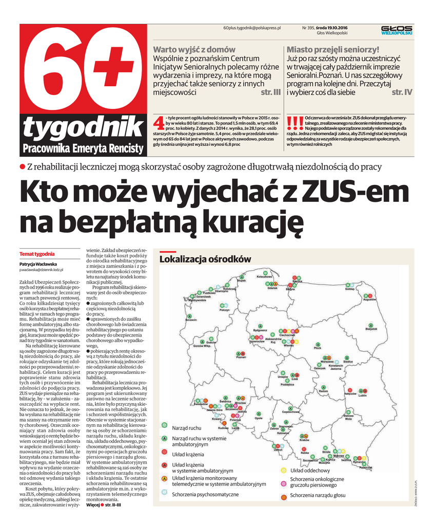 [email protected] Nr 395, środa 19.10.2016 Głos Wielkopolski Warto wyjść z domów Miasto przejęli seniorzy! – tyle procent ogółu ludności stanowiły w Polsce w 2015 r. osoby w wieku 80 lat i starsze. To ponad 1,5 mln osób, w tym 69,4 proc. to kobiety. Z danych z 2014 r. wynika, że 28,1 proc. osób starszych w Polsce żyje samotnie. 5,4 proc. osób w przedziale wiekowym od 65 do 84 lat jest w Polsce aktywnych zawodowo, podczas gdy średnia unijna jest wyższa i wynosi 6,8 proc Od czerwca do września br. ZUS dokonał przeglądu emerytalnego, zrealizowanego na zlecenie ministerstwa pracy. Na jego podstawie sporządzone zostały rekomendacje dla rządu. Jedna z rekomendacji zaleca, aby ZUS mógł stać się instytucją odpowiedzialną za wszystkie rodzaje ubezpieczeń społecznych, w tym również rolniczych Wspólnie z poznańskim Centrum Inicjatyw Senioralnych polecamy różne wydarzenia i imprezy, na które mogą przyjechać także seniorzy z innych str. III miejscowości 4 Już po raz szósty można uczestniczyć w trwającej cały październik imprezie Senioralni.Poznań. U nas szczegółowy program na kolejne dni. Przeczytaj str. IV i wybierz coś dla siebie !!! A Z rehabilitacji leczniczej mogą skorzystać osoby zagrożone długotrwałą niezdolnością do pracy Kto może wyjechać z ZUS-em na bezpłatną kurację Patrycja Wacławska [email protected] Zakład Ubezpieczeń Społecznych od 1996 roku realizuje program rehabilitacji leczniczej w ramach prewencji rentowej. Co roku kilkadziesiąt tysięcy osób korzysta z bezpłatnej rehabilitacji w ramach tego programu. Rehabilitacja może mieć formę ambulatoryjną albo stacjonarną. W przypadku tej drugiej, kuracjusz może spędzić ponad trzy tygodnie w sanatorium. Na rehabilitację kierowane są osoby zagrożone długotrwałą niezdolnością do pracy, ale rokujące odzyskanie tej zdolności po przeprowadzeniu\ rehabilitacji. Celem kuracji jest poprawienie stanu zdrowia tych osób i przywrócenie im zdolności do podjęcia pracy. ZUS wydaje pieniądze na rehabilitację, by – w założeniu – zaoszczędzić na wypłacie rent. Nie oznacza to jednak, że osoba wysłana na rehabilitację nie ma szansy na otrzymanie renty chorobowej. Orzecznik oceniający stan zdrowia osoby wnioskującej o rentę będzie bowiem oceniał jej stan zdrowia w aspekcie możliwości kontynuowania pracy. Sam fakt, że korzystała ona z turnusu rehabilitacyjnego, nie będzie miał wpływu na wydanie orzeczenia o niezdolności do pracy lub też odmowę wydania takiego orzeczenia. Koszt pobytu, który pokrywa ZUS, obejmuje całodobową opiekę medyczną, zabiegi lecznicze, zakwaterowanie i wyży- wienie. Zakład ubezpieczeń refunduje także koszt podróży do ośrodka rehabilitacyjnego z miejsca zamieszkania i z powrotem do wysokości ceny biletu na najtańszy środek komunikacji publicznej. Program rehabilitacji skierowany jest do osób ubezpieczonych: a zagrożonych całkowitą lub częściową niezdolnością do pracy, a uprawnionych do zasiłku chorobowego lub świadczenia rehabilitacyjnego po ustaniu podstawy do ubezpieczenia chorobowego albo wypadkowego, a pobierających rentę okresową z tytułu niezdolności do pracy, które rokują jednocześnie odzyskanie zdolności do pracy po przeprowadzeniu rehabilitacji. Rehabilitacja lecznicza prowadzona jest kompleksowo. Jej program jest ukierunkowany zarówno na leczenie schorzenia, które było przyczyną skierowania na rehabilitację, jak i schorzeń współistniejących. Obecnie w systemie stacjonarnym na rehabilitację kierowane są osoby ze schorzeniami: narządu ruchu, układu krążenia, układu oddechowego, psychosomatycznymi, onkologicznymi po operacjach gruczołu piersiowego i narządu głosu. W systemie ambulatoryjnym rehabilitowane są zaś osoby ze schorzeniami narządu ruchu i układu krążenia. Te ostatnie schorzenia rehabilitowane są ambulatoryjnie m.in. z wykorzystaniem telemedycznego monitorowania. Więcej a str. II–III Lokalizacja ośrodków Narząd ruchu Narząd ruchu w systemie ambulatoryjnym Układ krążenia Układ krążenia w systemie ambulatoryjnym Układ krążenia monitorowany telemedycznie w systemie ambulatoryjnym Schorzenia onkologiczne gruczołu piersiowego Schorzenia psychosomatyczne Schorzenia narządu głosu Układ oddechowy ŹRÓDŁO: WWW.ZUS.PL Temat tygodnia II • Masz Ludzie prawo Listy do redakcji Jeśli masz propozycje tematów do naszego tygodnika, napisz: ul. Grunwaldzka 19, 60-782 Poznań, zadzwoń pod numer 61 860 60 01 albo wyślij e-mail na: [email protected]. W indywidualnych sprawach emerytalno-rentowych kontaktuj się z najbliższym oddziałem ZUS-u lub Centrum Obsługi Telefonicznej 22 560 16 00 Praca listonosza jest bardzo odpowiedzialna, więc powinni ją wykonywać odpowiedzialni ludzie Listonosz wielokrotnie wrzuca nam do skrzynek przesyłki adresowane do innych osób. Często kieruje się przy tym, jak mniemam, na przykład numerem mieszkania, podczas gdy na kopercie jest napisany numer lokalu użytkowego w naszym budynku – one też mają swoje numery. Zdarzało się także, to już znacznie rzadziej, że korespondencja kierowana do mnie trafiała do skrzynek innych mieszkańców osiedla. Jest to denerwujące, zwłaszcza, gdy nadawcą jest bank lub inne instytucje. Przecież to mogą być bardzo ważne przesyłki! Zazwyczaj stoją one później na skrzynkach przez wiele dni, a potem zapewne są wyrzucane. A przecież adresaci z pewnością na nie czekają. Tak być nie powinno. MIESZKANIEC TBS-ÓW Wnuczek płaci mandaty, bo uczelnia nie zadbała o miejsca do parkowania. Powinien żądać zwrotu kosztów Ledwie rozpoczął się rok akademicki, a mój wnuczek zapłacił już trzy mandaty za niewłaściwe parkowanie. Nie zaprzeczam – parkował nieprawidłowo, jednak nie uważam, by zawinił on, ale jego uczelnia. Uczelnia przyciąga rzesze studentów, bo wiadomo, że za tym idą duże pieniądze. Nie dba jednak o to, by zapewnić im mie