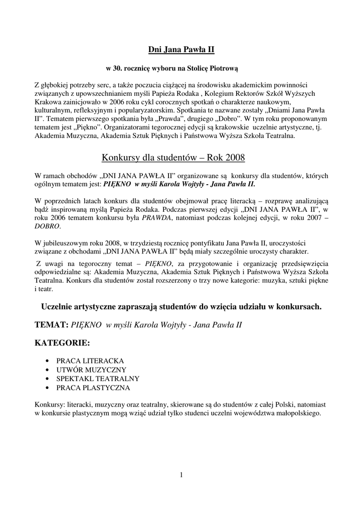Dni Jana Pawła II w 30. rocznicę wyboru na Stolicę Piotrową Z głębokiej potrzeby serc, a także poczucia ciążącej na środowisku akademickim powinności związanych z upowszechnianiem myśli Papieża Rodaka , Kolegium Rektorów Szkół Wyższych Krakowa zainicjowało w 2006 roku cykl corocznych spotkań o charakterze naukowym, kulturalnym, refleksyjnym i popularyzatorskim. Spotkania te nazwane zostały „Dniami Jana Pawła II”. Tematem pierwszego spotkania była „Prawda”, drugiego „Dobro”. W tym roku proponowanym tematem jest „Piękno”. Organizatorami tegorocznej edycji są krakowskie uczelnie artystyczne, tj. Akademia Muzyczna, Akademia Sztuk Pięknych i Państwowa Wyższa Szkoła Teatralna. Konkursy dla studentów – Rok 2008 W ramach obchodów „DNI JANA PAWŁA II” organizowane są konkursy dla studentów, których ogólnym tematem jest: PIĘKNO w myśli Karola Wojtyły - Jana Pawła II. W poprzednich latach konkurs dla studentów obejmował pracę literacką – rozprawę analizującą bądź inspirowaną myślą Papieża Rodaka. Podczas pierwszej edycji „DNI JANA PAWŁA II”, w roku 2006 tematem konkursu była PRAWDA, natomiast podczas kolejnej edycji, w roku 2007 – DOBRO. W jubileuszowym roku 2008, w trzydziestą rocznicę pontyfikatu Jana Pawła II, uroczystości związane z obchodami „DNI JANA PAWŁA II” będą miały szczególnie uroczysty charakter. Z uwagi na tegoroczny temat – PIĘKNO, za przygotowanie i organizację przedsięwzięcia odpowiedzialne są: Akademia Muzyczna, Akademia Sztuk Pięknych i Państwowa Wyższa Szkoła Teatralna. Konkurs dla studentów został rozszerzony o trzy nowe kategorie: muzyka, sztuki piękne i teatr. Uczelnie artystyczne zapraszają studentów do wzięcia udziału w konkursach. TEMAT: PIĘKNO w myśli Karola Wojtyły - Jana Pawła II KATEGORIE: • • • • PRACA LITERACKA UTWÓR MUZYCZNY SPEKTAKL TEATRALNY PRACA PLASTYCZNA Konkursy: literacki, muzyczny oraz teatralny, skierowane są do studentów z całej Polski, natomiast w konkursie plastycznym mogą wziąć udział tylko studenci uczelni województwa małopolskiego. 1 Biuro organizacyjne: Akademia Sztuk Pięknych im. J. Matejki 31-157 Kraków Pl. Matejki 13 Tel. 012 292 20 34, 012 2992018 e-mail: [email protected] KONKURS DLA STUDENTÓW KATEGORIA: UTWÓR MUZYCZNY Uwaga! Termin składania prac został przesunięty: prace konkursowe przyjmowane będą do 15 października 2008 r. TEMAT: Piękno w myśli Karola Wojtyły - Jana Pawła II 1.WARUNKI FORMALNE. 1.1. Czas trwania - do 20 minut. 1.2. Maksymalna obsada: głos solowy, chór (SATB) i pięć dowolnie wybranych instrumentów (dopuszczalna warstwa elektroakustyczna – należy załączyć jej nagranie. 1.3. Utwór nie może być wcześniej opublikowany ani nagrodzony w żadnym konkursie 1.4. partytura powinna mieć formę czytelnej kopii rękopisu lub wydruku komputerowego 2. MIEJSCE ZŁOŻENIA PRAC: 2.1. Prace należy składać w zamkniętej kopercie zaadresowanej: Akademia Muzyczna w Krakowie, Biuro Organizacyjne Studenckiego Konkursu Kompozytorskiego przy Dniach Jana Pawła II, ul. św. Tomasza 43 p.223, 31-027 Kraków 2.2. W partyturze należy zamieścić wyłącznie dowolnie wybrane przez siebie dwuczłonowe godło; nie wolno podać imienia i nazwiska autora ani żadnych informacji pozwalających go zidentyfikować. 2.3. Do partytury należy dołączyć osobną kopertę opatrzoną tym samym godłem, zawierającą dane osobowe autora utworu (imię i nazwisko, adres domowy, adres do korespondencji elektronicznej, kontakt telefoniczny, nazwa i adres uczelni, rok i kierunek studiów oraz umieszczone w partyturze konkursowej godło). 2.4. Jeżeli w utworze został wykorzystany tekst, należy go wyszczególnić na jednej z pierwszych stron partytury. 3. TERMIN ZŁOŻENIA PRAC: 3.1. Prace przyjmowane są do 6.X.2008 (decyduje data stempla pocztowego). Uwaga! Termin składania prac został przesunięty: prace konkursowe przyjmowane będą do 15 października 2008 r. 3.2. Prace złożone po terminie nie zostaną uwzględnione w konkursie. 4. KRYTERIA OCENY PRAC: 4.1. Jury konkursu ocenia oryginalność utworu i jego wartość artystyczną oraz poziom warsztatu kompozytorskiego autora 4.2. W skład jury wejdą profesorowie z Akademii Muzycznej oraz innych uczelni krakowskich. 2 5. NAGRODY: • I miejsce - 5000 zł. • II miejsce - 4000 zł. • III miejsce - 3000 zł. 5.1. Planowane wykonanie utworu w ramach kolejnej edycji Dni Jana Pawła II (głosy dla poszczególnych wykonawców zapewnia kompozytor we własnym zakresie). Wykonanie może zostać anulowane lub przełożone na inny termin z przyczyn organizacyjnych. Partytury nie nagrodzone będą do odebrania w Biurze Organizacyjnym Konkursu w terminie dwóch miesięcy od daty ogłoszenia wyników. 5.2. Nagrody zostaną wręczone po Mszy Św., która odbędzie się w Katedrze na Wawelu, w dniu 7.11.2008 r., o godz. 17.oo. 6. SKŁAD JURY: prof. Alicja Jarzębska prof. Zbigniew Bujarski dr hab. Wojciech Widłak 3