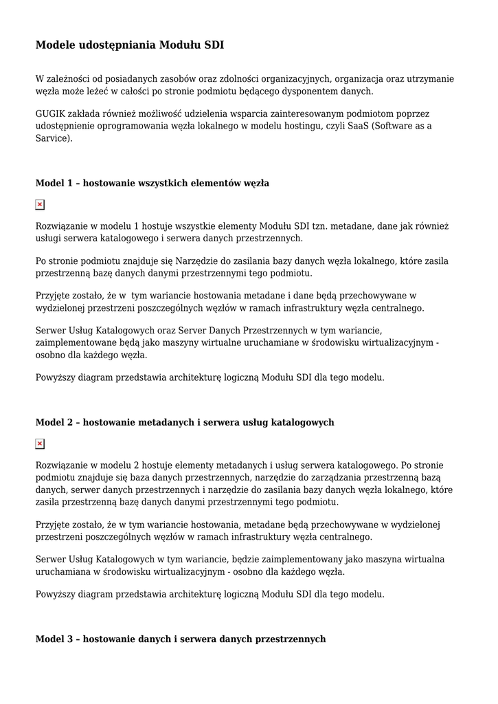 Modele udostępniania Modułu SDI W zależności od posiadanych zasobów oraz zdolności organizacyjnych, organizacja oraz utrzymanie węzła może leżeć w całości po stronie podmiotu będącego dysponentem danych. GUGIK zakłada również możliwość udzielenia wsparcia zainteresowanym podmiotom poprzez udostępnienie oprogramowania węzła lokalnego w modelu hostingu, czyli SaaS (Software as a Sarvice). Model 1 – hostowanie wszystkich elementów węzła Rozwiązanie w modelu 1 hostuje wszystkie elementy Modułu SDI tzn. metadane, dane jak również usługi serwera katalogowego i serwera danych przestrzennych. Po stronie podmiotu znajduje się Narzędzie do zasilania bazy danych węzła lokalnego, które zasila przestrzenną bazę danych danymi przestrzennymi tego podmiotu. Przyjęte zostało, że w tym wariancie hostowania metadane i dane będą przechowywane w wydzielonej przestrzeni poszczególnych węzłów w ramach infrastruktury węzła centralnego. Serwer Usług Katalogowych oraz Server Danych Przestrzennych w tym wariancie, zaimplementowane będą jako maszyny wirtualne uruchamiane w środowisku wirtualizacyjnym osobno dla każdego węzła. Powyższy diagram przedstawia architekturę logiczną Modułu SDI dla tego modelu. Model 2 – hostowanie metadanych i serwera usług katalogowych Rozwiązanie w modelu 2 hostuje elementy metadanych i usług serwera katalogowego. Po stronie podmiotu znajduje się baza danych przestrzennych, narzędzie do zarządzania przestrzenną bazą danych, serwer danych przestrzennych i narzędzie do zasilania bazy danych węzła lokalnego, które zasila przestrzenną bazę danych danymi przestrzennymi tego podmiotu. Przyjęte zostało, że w tym wariancie hostowania, metadane będą przechowywane w wydzielonej przestrzeni poszczególnych węzłów w ramach infrastruktury węzła centralnego. Serwer Usług Katalogowych w tym wariancie, będzie zaimplementowany jako maszyna wirtualna uruchamiana w środowisku wirtualizacyjnym - osobno dla każdego węzła. Powyższy diagram przedstawia architekturę logiczną Modułu SDI dla tego modelu. Model 3 – hostowanie danych i serwera danych przestrzennych Rozwiązanie w modelu 3 hostuje dane przestrzenne i serwer danych przestrzennych Po stronie podmiotu znajduje się baza metadanych, narzędzie do zarządzania metadanymi, serwer usług katalogowych oraz narzędzie do zasilania bazy danych węzła lokalnego, które zasila przestrzenną bazę danych danymi przestrzennymi tego podmiotu. Wariant ten, możliwy jest również do implementacji w przypadku, gdy w węźle lokalnym brak jest udostępnionej usługi serwera katalogowego. Metadane opisujące zarówno dane i usługi węzła lokalnego, udostępnione są z wykorzystaniem centralnego serwera katalogowego. Przyjęte zostało, że w tym wariancie hostowania dane przestrzenne będą przechowywane wydzielonej przestrzeni poszczególnych węzłów w ramach infrastruktury węzła centralnego. Server Danych Przestrzennych w tym wariancie, będzie zaimplementowany jako maszyna wirtualna uruchamiana w środowisku wirtualizacyjnym - osobno dla każdego węzła. Powyższy diagram przedstawia architekturę logiczną Modułu SDI dla tego modelu. Model 4 – dostarczenie oprogramowania W modelu 4 nie występuje klasyczny hosting elementów węzła. Oprogramowanie modułu – wraz z instrukcjami instalacji i administrowania, w całości przekazywane jest podmiotowi, który wdraża je i hostuje we własnym zakresie. Dotyczy to również baz danych dla danych przestrzennych i metadanych. Powyższy diagram przedstawia architekturę logiczną Modułu SDI dla tego modelu.