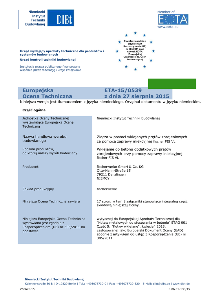 Member of Niemiecki Instytut Techniki Budowlanej www.eota.eu Powołany zgodnie z artykułem 29 Rozporządzenia (UE) nr 305/2011 oraz członek EOTA (Europejskiej Organizacji ds. Ocen Technicznych) Urząd wydający aprobaty techniczne dla produktów i systemów budowlanych Urząd kontroli techniki budowlanej Instytucja prawa publicznego finansowana wspólnie przez federację i kraje związkowe Europejska Ocena Techniczna ETA-15/0539 z dnia 27 sierpnia 2015 Niniejsza wersja jest tłumaczeniem z języka niemieckiego. Oryginał dokumentu w języku niemieckim. Część ogólna Jednostka Oceny Technicznej wystawiająca Europejską Ocenę Techniczną Niemiecki Instytut Techniki Budowlanej Nazwa handlowa wyrobu budowlanego Złącza w postaci wklejanych prętów zbrojeniowych za pomocą zaprawy iniekcyjnej fischer FIS VL Rodzina produktów, do której należy wyrób budowlany Wklejanie do betonu dodatkowych prętów zbrojeniowych przy pomocy zaprawy iniekcyjnej fischer FIS VL Producent fischerwerke GmbH & Co. KG Otto-Hahn-Straße 15 79211 Denzlingen NIEMCY Zakład produkcyjny fischerwerke Niniejsza Ocena Techniczna zawiera 17 stron, w tym 3 załączniki stanowiące integralną część składową niniejszej Oceny. Niniejsza Europejska Ocena Techniczna wystawiana jest zgodnie z Rozporządzeniem (UE) nr 305/2011 na podstawie wytycznej do Europejskiej Aprobaty Technicznej dla "Kotew metalowych do stosowania w betonie" ETAG 001 Część 5: "Kotwy wklejane", kwiecień 2013, zastosowanej jako Europejski Dokument Oceny (EAD) zgodnie z artykułem 66 ustęp 3 Rozporządzenia (UE) nr 305/2011. Niemiecki Instytut Techniki Budowlanej Kolonnenstraße 30 B | D-10829 Berlin | Tel.: +493078730-0 | Fax: +493078730-320 | E-Mail: [email protected] | www.dibt.de Z60678.15 8.06.01-133/15 Niemiecki Instytut Techniki Budowlanej Europejska Ocena Techniczna ETA-15/0539 Strona 2 z 17 | 27 sierpnia 2015 Niniejsza Europejska Ocena Techniczna została wydana przez Jednostkę Oceny Technicznej w jej języku urzędowym. Tłumaczenie niniejszej Europejskiej Oceny Technicznej na inne języki musi być całkowicie zgodne z oryginałem i jako takie oznaczone. Niniejsza Ocena Techniczna może być powielana/odtwarzana, także w formie elektronicznej, wyłącznie w całości i w formie nieskróconej. Częściowe jej powielenie/odtworzenie może nastąpić wyłącznie za pisemną zgodą wystawiającej ją Jednostki Oceny Technicznej. Każde częściowe powielenie/odtworzenie musi zostać jako takie oznaczone. Wystawiająca Jednostka Oceny Technicznej może odwołać niniejszą Europejską Ocenę Techniczną, w szczególności po powiadomieniu przez Komisję zgodnie z artykułem 25 ustęp 3 Rozporządzenia (UE) nr 305/2011. Z60678.15 8.06.01-133/15 Niemiecki Instytut Techniki Budowlanej Europejska Ocena Techniczna ETA-15/0539 Strona 3 z 17 | 27 sierpnia 2015 Część szczegółowa 1 Opis techniczny produktu Przedmiotem niniejszej oceny technicznej jest wklejanie dodatkowych prętów zbrojeniowych w betonie, poprzez zakotwienie bądź zespojenie ich z prętami zbrojeniowymi znajdującymi się w istniejących elementach betonowych przy zastosowaniu zaprawy iniekcyjnej FIS VL zgodnie z zasadami dotyczącymi konstruowania betonu zbrojonego. Do wklejenia dodatkowych prętów stosuje się pręty zbrojeniowe, wykonane ze stali o średnicy Ф od 10 mm do 25 mm przy pomocy zaprawy iniekcyjnej FIS VL. Łącznik stalowy zostaje umieszczony w wywierconym otworze wypełnionym zaprawą iniekcyjną i zostaje zakotwiony poprzez zespojenie elementu stalowego z betonem zaprawą iniekcyjną. W załączniku A przestawiono produkt i jego opis. 2 Określenie zamierzonego Dokumentem Oceny zastosowania zgodnie z odpowiednim Europejskim Spełnienie parametrów podanych w rozdziale 3 można zakładać wyłącznie wtedy, gdy kotwa została zastosowana zgodnie z wytycznymi i warunkami określonymi w załączniku B. Metody badań i oceny stanowiące podstawę niniejszej Europejskiej Oceny Technicznej prowadzą do przyjęcia przewidywalnej długości użytkowania kotwy wynoszącej, co najmniej 50 lat. Dane dotyczące okresu użytkowania nie są równoznaczne z gwarancją producenta; są jedynie informacją pomocną przy wyborze odpowiedniego produktu pod kątem zakładanego, uzasadnionego ekonomicznie okresu użyteczności budowli 3 Właściwości użytkowe wyrobu i dane dotyczące metod ich oceny 3.1 Wytrzymałość mechaniczna i stateczność (Wymaganie podstawowe BWR 1) Istotna właściwość Nośności na zniszczenie zespojenia 3.2 Patrz załącznik C 1 Ochrona przeciwpożarowa (Wymaganie podstawowe BWR 2) Istotna właściwość 3.3 Właściwości użytkowe Właściwości użytkowe Reakcja na ogień Wklejanie do betonu dodatkowych prętów zbrojeniowych spełnia wymagania klasy A1 Odporność ogniowa Właściwości użytkowe nie ustalone Higiena, zdrowie i ochrona środowiska (wymaganie podstawowe BWR 3) Odnośnie materiałów niebezpiecznych, produkty objęte zakresem obowiązywania niniejszej Europejskiej Oceny Technicznej mogą podlegać innym wymaganiom (np. wprowadzone w życie ustawodawstwo europejskie oraz krajowe przepisy prawne i administracyjne). Aby spełnić postanowienia rozporządzenia (EU) nr 305/2011, muszą zostać ewentualnie zachowane także w/w wymagania. 3.4 Bezpieczeństwo w trakcie użytkowania (wymaganie podstawowe BWR 4) Istotne właściwości dotyczące bezpieczeństwa w trakcie użytkowania zostały ujęte pod wymogiem podstawowym w zakresie wytrzymałości mechanicznej i stateczności. Z60678.15 8.06.01-133/15 Niemiecki Instytut Techniki Budowlanej Europejska Ocena Techniczna ETA-15/0539 4 Zastosowany system podstawy prawnej Strona 4 z 17 | 27 sierpnia 2015 oceny i weryfikacji właściwości użytkowych z podaniem Według wytycznych dla europejskiej aprobaty technicznej ETAG 001, kwiecień 2013, zastosowaną jako Europejski Dokument Oceny (EAD) zgodnie z artykułem 66 ustęp 3 rozporządzenia (UE) nr 305/2011 obowiązuje następując