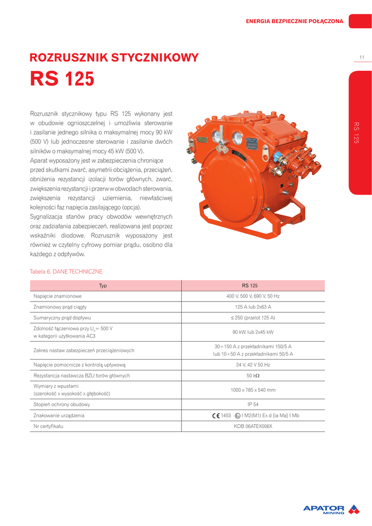 ENERGIA BEZPIECZNIE POŁĄCZONA ROZRUSZNIK STYCZNIKOWY 11 RS 125 RS 125 Rozrusznik stycznikowy typu RS 125 wykonany jest w obudowie ognioszczelnej i umożliwia sterowanie i zasilanie jednego silnika o maksymalnej mocy 90 kW (500 V) lub jednoczesne sterowanie i zasilanie dwóch silników o maksymalnej mocy 45 kW (500 V). Aparat wyposażony jest w zabezpieczenia chroniące przed skutkami zwarć, asymetrii obciążenia, przeciążeń, obniżenia rezystancji izolacji torów głównych, zwarć, zwiększenia rezystancji i przerw w obwodach sterowania, zwiększenia rezystancji uziemienia, niewłaściwej kolejności faz napięcia zasilającego (opcja). Sygnalizacja stanów pracy obwodów wewnętrznych oraz zadziałania zabezpieczeń, realizowana jest poprzez wskaźniki diodowe. Rozrusznik wyposażony jest również w czytelny cyfrowy pomiar prądu, osobno dla każdego z odpływów. Tabela 6. DANE TECHNICZNE Typ RS 125 Napięcie znamionowe 400 V, 500 V, 690 V, 50 Hz Znamionowy prąd ciągły 125 A lub 2x63 A ≤ 250 (przelot 125 A) Sumaryczny prąd dopływu Zdolność łączeniowa przy Ue= 500 V w kategorii użytkowania AC3 90 kW lub 2x45 kW 30÷150 A z przekładnikami 150/5 A lub 10÷50 A z przekładnikami 50/5 A Zakres nastaw zabezpieczeń przeciążeniowych Napięcie pomocnicze z kontrolą upływową 24 V, 42 V 50 Hz Rezystancja nastawcza BZU torów głównych 50 kΩ Wymiary z wpustami (szerokość x wysokość x głębokość) 1000 x 785 x 540 mm Stopień ochrony obudowy Znakowanie urządzenia Nr certyfikatu IP 54 1453 I M2(M1) Ex d [ia Ma] I Mb KDB 06ATEX006X APARATURA GÓRNICZA Tabela 7. RODZAJE WYKONAŃ RS 125 Wykonanie Wielkość charakterystyczna 01 02 03 04 06 07 08 09 400 V, 500 V, 690 V Sumaryczny prąd odpływów lo ≤125 A ≤100 A ≤125 A ≤125 A ≤100 A ≤125 A ≤125 A ≤100 A ≤125 A Rodzaj zastosowanych przekładników Odpływ I 150/5 A 50/5 A 150/5 A 150/5 A 50/5 A 150/5 A 150/5 A 50/5 A 150/5 A Odpływ II 150/5 A 50/5 A 50/5 A 150/5 A 50/5 A 50/5 A 150/5 A 50/5 A 50/5 A Zakres zabezpieczeń przeciążeniowych Odpływ I 30÷125 A 10÷50 A 30÷125 A 10÷50 A 30÷125 A 10÷50 A Odpływ II 30÷125 A 10÷50 A Zabezpieczenie przed niewłaściwą kolejnością faz Wyposażenie dodatkowe 30÷125 A 10÷50 A Monitoring oraz zabezpieczenie przed niewłaściwą kolejnością faz 30÷125 A 10÷50 A brak PRZYKŁAD ZAMÓWIENIA Rozrusznik stycznikowy typu RS 125 wyk. 07 - oznacza zamówienie rozrusznika o zakresie zabezpieczeń przeciążeniowych 30÷125 A. SCHEMAT IDEOWY ROZRUSZNIKA A3 A4 24V 133Hz F1 F3 Wył. K12 Zał. K10 Q 230V 50Hz Zał. K6 F2 (rezerwa) Dygn. ostrz. A F41 A K21 24V ASY K K22 U[V] 50Hz F3 F42 24V U[V] F0 Zał. K Q1 T5 660-500 -380 V 2 4 V-30V -42V G K3 30V RT K9 24V A1 F2 F1 BZU R< CBZU R< 133Hz 24V 24V 133Hz - człon przeciążeniowy - przekaźnik kontroli kolejności faz - blokujące zabezpieczenia upływowe - centralno-blokujące zabezpieczenia upływowe - przekaźnik kontroli ciągłości uziemienia - człon przekaźnika czasowy - sterowanie F4. T2 T1 K2. 24V 24V/133Hz 24V/DC AC/DC/AC ASY BZU CBZU KPE RT ST 133Hz 23 0 V K1. KPE KPE ST ST R>100 R>100 R>600 R>600 24V DC ib ia A2 ia 1 50Hz 24V 50Hz 2 2 4 V-42V - człon przeciążeniowy ASY - człon asymetrowy, z przekaźnikiem kolejności faz BZU - blokujące zabezpieczenie upływowe CBZU - centralno-blokujące zabezpieczenie upływowe KPE - kontrola ciągłości uziemienia RT - człon przekaźnika czasowego ST - sterowanie ISK RS 125 Znamionowe napięcie łączeniowe Ue 05 ISO-*/N 12