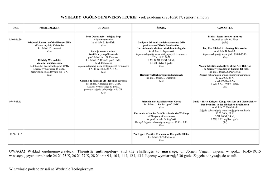 WYKŁADY OGÓLNOUNIWERSYTECKIE - rok akademicki 2016/2017, semestr zimowy Godz. PONIEDZIAŁEK 15.00-16.30 Wisdom Literature of the Hberew Bible (Proverbs, Job, Koheleth) ks. dr hab. D. Iwański (1a) Kościoły Wschodnie: historia i współczesność o. dr hab. M. Paczkowski, prof. UMK Łączny wymiar zajęć 15 godz., pierwsze zajęcia odbywają się 10 X. (2a) WTOREK Boża Opatrzność – miejsce Boga w życiu człowieka ks. dr hab. S. Suwiński (1a) Relacje nauka – wiara: konflikt czy współistnienie prof. dr hab. inż. G. Karwasz; ks. dr hab. P. Roszak, prof. UMK; dr M. Czarnecka Zajęcia odbywają się w następujących terminach: 4 X, 11 X, 18 X, 25 X, 8 XI. (2a) Camino de Santiago yla identidad europea ks. dr hab. P. Roszak, prof. UMK Łączny wymiar zajęć 15 godz., pierwsze zajęcia odbywają się 15 XI. (2a) 16.45-18.15 ŚRODA La figura del ministro del sacramento della penitenza nell`Ordo Paenitentiae. In riferimento alle fonti storiche e teologiche ks. dr hab. J. Szymański Zajęcia odbywają się w następujących terminach: 12 X, 19 X, 26 X, 9 XI, 16 XI, 23 XI, 30 XI, 21 XII - tylko 1 godz. (1a) Historie wielkich przyjaźni duchowych ks. prof. dr hab. I. Werbiński (2a) Friede in der Soziallehre der Kirche ks. dr hab. J. Szulist, , prof. UMK (1a) The model of the Perfect Christian in the Writings of Gregory of Nazianzus ks. prof. dr hab. D. Zagórski Uwaga! Zajęcia odbywają się w godz. 16.45-17.30. (2a) 18.30-19.15 CZWARTEK Biblia – istota i rola w kulturze ks. prof. dr hab. W. Pikor (aula) Top Ten Biblical Archeology Discoveries ks. dr hab. D. Iwański Zajęcia odbywają się w godz. 15.00-15.45. (1a) Moses` Identity and a Birth of the New Religion The Narrative Reading of Exodus 2:1-3:15 ks. prof. dr hab. Z. Pawłowski Zajęcia odbywają się w następujących terminach: 13 X, 20 X, 27 X, 3 XI, 10 XI, 24 XI, 1 XII, 8 XII - tylko 1 godz. (2a) David – Hirte, Krieger, König, Musiker und Liederdichter. Der Sohn Isai in der biblischen Traditionen ks. dr hab. T. Tułodziecki Zajęcia odbywają się w następujących terminach: 13 X, 20 X, 27 X, 3 XI, 10 XI, 24 XI, 1 XII, 8 XII - tylko 1 godz. (1a) Per leggere l`Antico Testamento. Una guida biblica ks. dr hab. T. Tułodziecki (1a) UWAGA! Wykład ogólnouniwersytecki Thomistic anthropology and the challenges to marriage, dr Jörgen Vijgen, zajęcia w godz. 16.45-19.15 w następujących terminach: 24 X, 25 X, 26 X, 27 X, 28 X oraz 9 I, 10 I, 11 I, 12 I, 13 I. Łączny wymiar zajęć 30 godz. Zajęcia odbywają się w auli. W nawiasie podano nr sali na Wydziale Teologicznym.