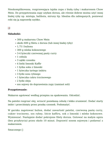 Nieskomplikowana, rozgrzewająca tajska zupa z białą rybą i makaronem Chow Mein. Do przygotowania zupy użyłam dorsza, ale równie dobrze można użyć innej białej ryby np. mintaja, halibuta, miruny itp. Idealna dla zabieganych, ponieważ robi się ją naprawdę szybko. Składniki: 300 g makaronu Chow Mein około 600 g filetu z dorsza (lub innej białej ryby) 1,75 l bulionu 300 g mleka kokosowego 3-4 łyżeczki czerwonej pasty curry 1 cebula 3 ząbki czosnku 4 listki limonki Kaffir 1 łyżka soku z limonki 1 łyżeczka tartego imbiru 3 łyżki sosu rybnego 1 łyżeczka cukru trzcinowego 2 łyżki oleju sos sojowy do doprawienia zupy (zamiast soli) Przygotowanie: Makaron ugotować według przepisu na opakowaniu. Odcedzić. Na patelni rozgrzać olej, wrzucić posiekaną cebulę i lekko zrumienić. Dodać starty imbir i przeciśnięty przez praskę czosnek. Podsmażyć. W garnku zagotować bulion, dodać zawartość patelni, czerwoną pastę curry, cukier trzcinowy, sos rybny, liście kaffiru, sok z limonki i mleko kokosowe. Wymieszać. Następnie dodać pokrojone filety dorsza. Gotować na małym ogniu (bez przykrycia) przez około 10 minut. Doprawić sosem sojowym i podawać z makaronem. Smacznego Naleśniki nadziewane piersią z kurczaka, czerwoną fasolą, papryką i kukurydzą zapiekane pod warstwą sosu pomidorowego i sera cheddar. W takiej odsłonie na pewno zachwycą niejedno podniebienie Polecam Składniki (na około 10 naleśników): naleśniki z tego przepisu ← Farsz: 3 pojedyncze piersi z kurczaka 1 mała czerwona papryka 3/4 szklanki czerwonej fasoli z puszki (bez zalewy) 1/2 szklanki kukurydzy z puszki (bez zalewy) 1 cebula 1/3 szklanki bulionu 2 łyżki oliwy z oliwek 1 płaska łyżeczka kminu rzymskiego 1 łyżeczka oregano 1 płaska łyżeczka ziaren kolendry szczypta chili 1 łyżka suszonej słodkiej papryki 1 łyżeczka czosnku granulowanego sól pieprz Sos pomidorowy: 1 puszka pomidorów krojonych bez skóry (400 g) 1 mała cebula 2 ząbki czosnku 1 łyżka oliwy z oliwek 1 płaska łyżeczka oregano sól pieprz około 100 g sera cheddar Przygotowanie: Farsz: Na patelni rozgrzewamy oliwę z oliwek. Wrzucamy drobno pokrojone piersi z kurczaka, posiekaną cebulę, utarty w moździerzu kmin rzymski razem z kolendrą, oregano, chili i odrobinę soli. Wszystko lekko rumienimy, dodajemy drobno pokrojoną paprykę, suszony czosnek i paprykę w proszku. Mieszamy i chwilę podsmażamy. Następnie wlewamy bulion i gotujemy na małym ogniu, aż woda odparuje i papryka lekko zmięknie. Dodajemy fasolę i kukurydzę, mieszamy i doprawiamy solą. Sos pomidorowy: Na patelni rozgrzewamy oliwę z oliwek, wrzucamy posiekaną cebulę i lekko rumienimy. Dodajemy przeciśnięty przez praskę czosnek i chwilkę podsmażamy. Następnie dokładamy pomidory z puszki (razem z zalewą) i oregano. Gotujemy na małym ogniu przez około 5 minut. Doprawiamy solą i pieprzem. Na każdy naleśnik nakładamy trochę farszu, zawijamy jak na krokiety i układamy w naczyniu do zapiekania. Całość zalewamy przygotowanym sosem i posypujemy startym serem. Zapiekamy w piekarniku nagrzanym do 180°C przez około 20 minut. Smacznego Prosta pasta na kanapki z ugotowanej ciecierzycy i twarogu z dodatkiem czosnku, odrobiny limonki, oleju sezamowego i świeżej kolendry. To alternatywa dla pasztetów i różnego rodzaju innych smarowideł. Zdrowa, smaczna i bezmięsna. Spróbujcie Składniki: 1 szklanka ugotowanej ciecierzycy 140 g twarogu 1 ząbek czosnku 1/4 szklanki przegotowanej zimnej wody 1,5 łyżki soku z limonki 1 łyżeczka oleju sezamowego 1 łyżka posiekanej kolendry sól pieprz Przygotowanie: Wszystkie składniki oprócz kolendry zmiksować. Dodać posiekaną kolendrę, wymieszać i doprawić solą i pieprzem. W razie potrzeby dodać odrobinę wody więcej. Smacznego Pyszne mini serniczki na zimno nadziewane musem z mango na spodzie z biszkoptów. Pięknie się prezentują na talerzu dzięki kolorowej lustrzanej polewie (niestety na zdjęciach wygląda lekko matowa). Przygotowanie ich może wydawać się dość trudne, ale takie nie jest. Należy tylko pamiętać aby powierzchnia do pokrycia była bez żadnych nierówności a serniczki mocno schłodzone. Polecam Składniki (na około 5 mini serniczków): Serniczki: 350 g twarogu półtłustego (mielonego) 150 g śmietany kremówki 30% 1/3 szklanki mleka 3 łyżeczki żelatyny 2 pełne łyżki cukru pudru 3 łyżeczki soku z limonki 1/2 dojrzałego mango Lustrzana glazura: 300 g białej czekolady 200 g mleka skondensowanego (użyłam niesłodzonego) 1 i 3/4 szklanki cukru 20 g żelatyny 3/4 szklanki zimnej wody Dodatkowo: okrągłe biszkopty Przygotowanie: Serniczki: Do rondelka wlać mleko i wsypać żelatynę. Gdy napęcznieje, podgrzewać, do momentu rozpuszczenia żelatyny (nie zagotować!). Ostudzić. Zimną kremówkę ubić z cukrem pudrem, dodać twaróg, sok z limonki i dokładnie wymieszać. Do żelatyny (nie odwrotnie!) dodawać po łyżce masy i mieszać, nie może być grudek. Gdyby jednak się zrobiły, masę należy delikatnie podgrzać (np. w kąpieli wodnej), aż grudki się rozpuszczą. Mango obrać, miąższ zmiksować blenderem. Do foremek przełożyć masę (użyłam szklaneczek), wyrównać i wstawić do lodówki. Gdy serniczki prawie stężeją, łyżeczką na środku zrobić małą dziurkę. Nałożyć mus z mango i przykryć biszkoptem (lekko docisnąć). Ponownie wstawić do lodówki, aż całkowicie stężeją. Lustrzana glazura: Do zimnej wody wsypać żelatynę i odstawić do napęcznienia. Do rondla nasypać cukier, wlać mleko skondensowane, wrzucić posiekaną czekoladę oraz napęczniałą żelatynę. Podgrzewać na malutkim ogniu, ciągle mieszając, aż wszystkie składniki się połączą (nie wolno zagotować!). Następnie podzielić na tyle części ile chcecie kolorów. Dodać barwniki spożywcze i dokładnie wymieszać. Odstawić do wystudzenia, aż glazura trochę zgęstnieje. Stężałe serniczki zanur