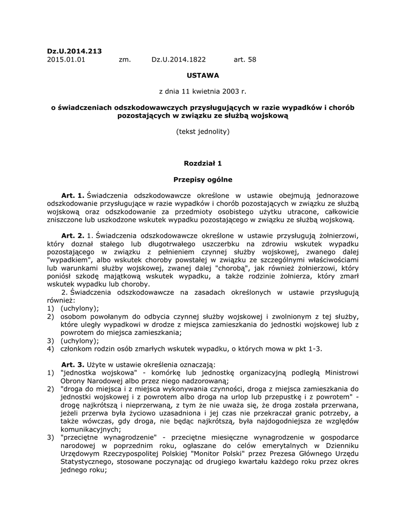 Dz.U.2014.213 2015.01.01 zm. Dz.U.2014.1822 art. 58 USTAWA z dnia 11 kwietnia 2003 r. o świadczeniach odszkodowawczych przysługujących w razie wypadków i chorób pozostających w związku ze służbą wojskową (tekst jednolity) Rozdział 1 Przepisy ogólne Art. 1. Świadczenia odszkodowawcze określone w ustawie obejmują jednorazowe odszkodowanie przysługujące w razie wypadków i chorób pozostających w związku ze służbą wojskową oraz odszkodowanie za przedmioty osobistego użytku utracone, całkowicie zniszczone lub uszkodzone wskutek wypadku pozostającego w związku ze służbą wojskową. Art. 2. 1. Świadczenia odszkodowawcze określone w ustawie przysługują żołnierzowi, który doznał stałego lub długotrwałego uszczerbku na zdrowiu wskutek wypadku pozostającego w związku z pełnieniem czynnej służby wojskowej, zwanego dalej "wypadkiem", albo wskutek choroby powstałej w związku ze szczególnymi właściwościami lub warunkami służby wojskowej, zwanej dalej "chorobą", jak również żołnierzowi, który poniósł szkodę majątkową wskutek wypadku, a także rodzinie żołnierza, który zmarł wskutek wypadku lub choroby. 2. Świadczenia odszkodowawcze na zasadach określonych w ustawie przysługują również: 1) (uchylony); 2) osobom powołanym do odbycia czynnej służby wojskowej i zwolnionym z tej służby, które uległy wypadkowi w drodze z miejsca zamieszkania do jednostki wojskowej lub z powrotem do miejsca zamieszkania; 3) (uchylony); 4) członkom rodzin osób zmarłych wskutek wypadku, o których mowa w pkt 1-3. Art. 3. Użyte w ustawie określenia oznaczają: 1) "jednostka wojskowa" - komórkę lub jednostkę organizacyjną podległą Ministrowi Obrony Narodowej albo przez niego nadzorowaną; 2) "droga do miejsca i z miejsca wykonywania czynności, droga z miejsca zamieszkania do jednostki wojskowej i z powrotem albo droga na urlop lub przepustkę i z powrotem" drogę najkrótszą i nieprzerwaną, z tym że nie uważa się, że droga została przerwana, jeżeli przerwa była życiowo uzasadniona i jej czas nie przekraczał granic potrzeby, a także wówczas, gdy droga, nie będąc najkrótszą, była najdogodniejsza ze względów komunikacyjnych; 3) "przeciętne wynagrodzenie" - przeciętne miesięczne wynagrodzenie w gospodarce narodowej w poprzednim roku, ogłaszane do celów emerytalnych w Dzienniku Urzędowym Rzeczypospolitej Polskiej "Monitor Polski" przez Prezesa Głównego Urzędu Statystycznego, stosowane poczynając od drugiego kwartału każdego roku przez okres jednego roku; 4) "rencista" - rencistę wojskowego w rozumieniu przepisów o zaopatrzeniu emerytalnym żołnierzy zawodowych; 5) "inwalida" - inwalidę wojskowego w rozumieniu przepisów o zaopatrzeniu inwalidów wojennych i wojskowych. Art. 4. Uszczerbek na zdrowiu, o którym mowa w art. 2 ust. 1, uważa się za: 1) stały - jeżeli powoduje upośledzenie czynności organizmu nierokujące poprawy; 2) długotrwały - jeżeli powoduje upośledzenie czynności organizmu na przekraczający sześć miesięcy, mogące ulec poprawie. okres Art. 5. Za wypadek uważa się nagłe zdarzenie wywołane przyczyną zewnętrzną powodujące uraz lub śmierć, które zaszło podczas lub w związku: 1) z wykonywaniem obowiązków służbowych albo poleceń przełożonych; 2) z wykonywaniem czynności w interesie służby wojskowej, nawet bez polecenia przełożonych; 3) z ratowaniem ludzi z grożącego niebezpieczeństwa albo ratowaniem mienia przed zniszczeniem lub zagarnięciem; 4) z udziałem w pościgu lub ujęciu osób podejrzanych o popełnienie przestępstwa albo ochroną innych osób przed napaścią; 5) z odbywaniem drogi do miejsca i z miejsca wykonywania czynności określonych w pkt 1 i 2. Art. 6. Minister Obrony Narodowej określi, w drodze rozporządzenia, w porozumieniu z ministrem właściwym do spraw zdrowia i ministrem właściwym do spraw zabezpieczenia społecznego, wykaz chorób, z tytułu których przysługują świadczenia określone w ustawie, z uwzględnieniem szczególnych właściwości lub warunków służby wojskowej powodujących powstawanie tych chorób oraz ich związek z pełnioną służbą. Art. 7. Świadczenia określone w ustawie nie przysługują: 1) w razie wypadku lub choroby, których wyłączną przyczyną było udowodnione przez właściwy organ umyślne lub rażąco niedbałe działanie albo zaniechanie żołnierza naruszające obowiązujące przepisy lub rozkazy, jeżeli jego przełożeni zapewnili warunki odpowiadające tym przepisom, a żołnierz posiadał umiejętności potrzebne do wykonywania określonych czynności i był należycie przeszkolony w zakresie znajomości tych przepisów; 2) w razie wypadku: a) któremu żołnierz uległ podczas: - pobytu na urlopie lub przepustce, z wyjątkiem odbywania drogi na urlop lub przepustkę i z powrotem oraz przypadków, o których mowa w art. 5 pkt 3 i 4, - samowolnego opuszczenia swojej jednostki wojskowej lub wyznaczonego miejsca przebywania albo samowolnego pozostawania poza nimi, z wyjątkiem przypadków, o których mowa w art. 5 pkt 3 i 4, b) do którego w znacznym stopniu przyczyniło się zachowanie żołnierza spowodowane jego stanem nietrzeźwości albo zażyciem środków odurzających lub substancji psychotropowych; 3) jeżeli uszczerbek na zdrowiu lub śmierć żołnierza zostały spowodowane przez niego umyślnie. Art. 8. Świadczenia odszkodowawcze przewidziane w ustawie przysługują niezależnie od świadczeń odszkodowawczych przewidzianych dla żołnierzy pełniących służbę wojskową poza granicami państwa. Art. 9. W sprawach nieuregulowanych w ustawie stosuje się przepisy Kodeksu postępowania administracyjnego. Rozdział 2 Jednorazowe odszkodowanie Art. 10. Żołnierzowi, który wskutek wypadku albo choroby doznał stałego długotrwałego uszczerbku na zdrowiu, przysługuje jednorazowe odszkodowanie. lub Art. 11. 1. Jednorazowe odszkodowanie przysługuje w wysokości 20% pr