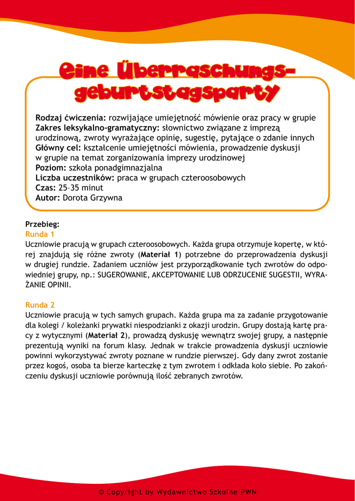 Eine Überraschungsgeburtstagsparty Rodzaj ćwiczenia: rozwijające umiejętność mówienie oraz pracy w grupie Zakres leksykalno-gramatyczny: słownictwo związane z imprezą urodzinową, zwroty wyrażające opinię, sugestię, pytające o zdanie innych Główny cel: kształcenie umiejętności mówienia, prowadzenie dyskusji w grupie na temat zorganizowania imprezy urodzinowej Poziom: szkoła ponadgimnazjalna Liczba uczestników: praca w grupach czteroosobowych Czas: 25–35 minut Autor: Dorota Grzywna Przebieg: Runda 1 Uczniowie pracują w grupach czteroosobowych. Każda grupa otrzymuje kopertę, w której znajdują się różne zwroty (Materiał 1) potrzebne do przeprowadzenia dyskusji w drugiej rundzie. Zadaniem uczniów jest przyporządkowanie tych zwrotów do odpowiedniej grupy, np.: SUGEROWANIE, AKCEPTOWANIE LUB ODRZUCENIE SUGESTII, WYRAŻANIE OPINII. Runda 2 Uczniowie pracują w tych samych grupach. Każda grupa ma za zadanie przygotowanie dla kolegi / koleżanki prywatki niespodzianki z okazji urodzin. Grupy dostają kartę pracy z wytycznymi (Materiał 2), prowadzą dyskusję wewnątrz swojej grupy, a następnie prezentują wyniki na forum klasy. Jednak w trakcie prowadzenia dyskusji uczniowie powinni wykorzystywać zwroty poznane w rundzie pierwszej. Gdy dany zwrot zostanie przez kogoś, osoba ta bierze karteczkę z tym zwrotem i odkłada koło siebie. Po zakończeniu dyskusji uczniowie porównują ilość zebranych zwrotów. © Copyright by Wydawnictwo Szkolne PWN Materiał 1 W trakcie dyskusji wykorzystajcie poniższe zwroty: Sugerowanie Vielleicht könnten / sollten wir ...? Ich glaube, wir sollten ... Warum sollten wir nicht ...? Ich würde ... Und wenn wir ...? Es wäre gut, wenn ... Akceptowanie sugestii OK. / Gut. In Ordnung. Einverstanden. Das ist eine gute Idee. Gut, machen wir das. Odrzucanie sugestii Ich glaube nicht, dass das eine gute Idee / Lösung ist. Das ist keine gute Idee. materiały do kopiowania © Copyright by Wydawnictwo Szkolne PWN Pytanie o opinię / zdanie Wie findest du? Was meinst du? Wie siehst du das? Wyrażanie opinii Ich finde ... Ich finde es gut / nicht gut, wenn / dass ... Ich meine ... Ich bin der Meinung ... Meiner Meinung nach ... Meiner Ansicht nach ... Ich glaube / denke ... Ich sehe das so: ... Zgadzanie się z opinią innych Das stimmt. Da hast du Recht. materiały do kopiowania © Copyright by Wydawnictwo Szkolne PWN (Da bin ich) einverstanden. Ich stimme da zu. Ich bin der gleichen Meinung wie du. Wyrażanie zastrzeżeń Das stimmt, aber ... Ja gut, aber ... Na ja, aber ... Das hängt davon ab, ... Wyrażanie sprzeciwu Ich bin nicht dieser Meinung. Ich bin (ganz) anderer Meinung. Ich stimme da nicht zu. Das stimmt nicht. materiały do kopiowania © Copyright by Wydawnictwo Szkolne PWN Materiał 2 Wasza koleżanka / wasz kolega obchodzi wkrótce urodziny. Wraz z innymi koleżankami i kolegami chcecie przygotować jej / jemu niespodziankę w postaci prywatki urodzinowej. Przedyskutujcie w grupie: n kiedy i gdzie odbędzie się impreza n kogo zaprosicie n jakie będą obowiązywać stroje n w jaki sposób zorganizujecie bufet i kto się tym zajmie n oprawę muzyczną n prezent dla jubilatki / jubilata n dodatkowe atrakcje materiały do kopiowania © Copyright by Wydawnictwo Szkolne PWN