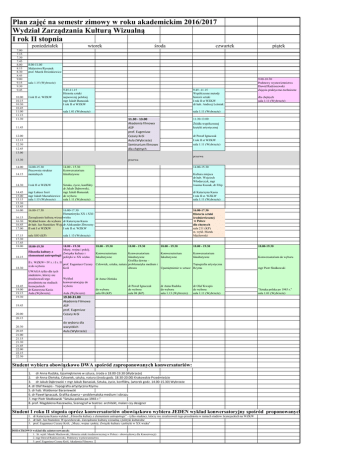 Plan zajęć na semestr zimowy w roku akademickim 2016/2017 Wydział Zarządzania Kulturą Wizualną I rok II stopnia poniedziałek 7.00 7.15 7.30 7.45 8.00 8.15 8.30 8.45 9.00 9.15 9.30 9.45 10.00 10.15 10.30 10.45 11.00 11.15 11.30 środa wtorek czwartek piątek 8.00-11.00 Malarstwo/Rysunek prof. Marek Dzienkiewicz sala 1.15 (Wybrzeże) I rok II st. WZKW 9.45-11.15 Historia sztuki najnowszej polskiej mgr Jakub Banasiak I rok II st WZKW 9.45 -11.15 Współczesne metody historii sztuki I rok II st WZKW dr hab. Andrzej Leśniak sala 1.01 (Wybrzeże) sala 1.11 (Wybrzeże) 11.30 - 13.00 Akademia filmowa ASP prof. Eugeniusz Cezary Król Aula (Wybrzeże) Seminarium filmowe dla chętnych 11.45 12.00 12.15 12.30 12.45 13.00 9.00-10.30 Podstawy wystawiennictwa Dawid Radziszewski Zajęcia praktyczno-techniczne dla chętnych sala 1.11 (Wybrzeże) 11.30-13.00 Źródła współczesnej krytyki artystycznej dr Paweł Ignaczak I rok II st WZKW sala 1.11 (Wybrzeże) przerwa 13.30 14.00 przerwa 14.15 14.00-15.30 Pracownia struktur mentalnych 14.30 I rok II st WZKW 14.45 15.00 15.15 15.30 15.45 16.00 16.15 16.30 16.45 17.00 17.15 17.30 17.45 18.00 18.15 18.30 18.45 19.00 19.15 19.30 19.45 20.00 20.15 20.30 20.45 21.00 21.15 21.30 21.45 22.00 22.15 22.30 14.00 - 15.30 Konwersatorium fakultatywne 14.00-15.30 Kultura miejsca dr hab. Wojciech Włodarczyk, mgr Joanna Kusiak, dr Filip Sztuka, życie, konflikty dr Jakub Dąbrowski, mgr Łukasz Izert mgr Jakub Banasiak mgr Jakub Mazurkiewicz do wyboru sala 1.15 (Wybrzeże) sala 1.11 (Wybrzeże) dr Katarzyna Kasia I rok II st. WZKW sala 1.11 (Wybrzeże) 16.00-17.30 16.00-17.30 Humanistyka XX i XXI Zarządzanie kulturą wizualną wieku i polityki kulturalne Wykład konw. do wyboru dr Katarzyna Kasia dr hab. Jan Stanisław Wojciechowski dr Aleksander Zbrzezny II rok I st WZKW I rok II st. WZKW sala SJO (KP) 16.00-17.30 Historia sztuki średniowiecznej w Polsce dla chętnych sala 211 (KP) st. wykł. Marek Machowski sala 1.13 (Wybrzeże) 18.00 - 19.30 Muzy, wojna i pokój. Filozofia kultury z Związku kultury i elementami antropologii polityki w XX wieku 18.00-19.30 18.00 - 19.30 18.00 - 19.30 18.00 - 19.30 Konwersatorium fakultatywne Konwersatorium Konwersatorium fakultatywne fakultatywne Grafika dawna – II r. WZKW+ IV r. i I r. II prof. Eugeniusz Cezary Człowiek, sztuka, natura problematyka medium i st.do wyboru Król obrazu Upamiętnienie w sztuce UWAGA tylko dla tych studentów, którzy nie Wykład zrealizowali tego dr Anna Oleńska konwersatoryjny do przedmiotu na studiach wyboru dr Paweł Ignaczak dr Anna Rudzka licencjackich do wyboru do wyboru do wyboru dr Katarzyna Kasia Aula (Wybrzeże) sala 08 (KP) sala 08 (KP) sala 1.13 (Wybrzeże) Aula (Wybrzeże) 18.00 - 19.30 18.00-19.30 Konwersatorium fakultatywne Konwersatorium do wyboru Topografia artystyczna Rzymu mgr Piotr Słodkowski dr Olaf Kwapis do wyboru sala 1.11 (Wybrzeże) "Sztuka polska po 1945 r." sala 1.01 (Wybrzeże) 19.30-21.00 Akademia Filmowa ASP prof. Eugeniusz Cezary Król do wyboru dla wszystkich Aula (Wybrzeże) Student wybiera obowiązkowo DWA spośród zaproponowanych konwersatoriów: 1. dr Anna Rudzka, Upamiętnienie w sztuce, środa o 18.00-19.30 (Wybrzeże) 2. dr Anna Oleńska, Człowiek, sztuka, natura (środa godz. 18.30-20.00) Krakowskie Przedmieście 3. dr Jakub Dąbrowski + mgr Jakub Banasiak, Sztuka, życie, konflikty, (wtorek godz. 14.00-15.30) Wybrzeże 4. dr Olaf Kwapis - Topografia artystyczna Rzymu 5. dr hab. Waldemar Baraniewski 6. dr Paweł Ignaczak, Grafika dawna – problematyka medium i obrazu 7. mgr Piotr Słodkowski "Sztuka polska po 1945 r." 8. prof. Magdalena Raszewska, Scenograf w teatrze: architekt, malarz czy designer Student I roku II stopnia oprócz konwersatoriów obowiązkowo wybiera JEDEN wykład konwersatoryjny spośród proponowanych: 1. dr Katarzyna Kasia wykład: „Filozofia kultury z elementami antropologii” - tylko studenci, którzy nie zrealizowali tego przedmiotu w ramach studiów licencjackich na WZKW 2. dr hab. Jan Stanisław Wojciechowski, Zarządzanie kulturą wizualną i polityki kulturalne 3. prof. Eugeniusz Cezary Król, „Muzy, wojna i pokój. Związki kultury i polityki w XX wieku" DODATKOWO wykład dla zainteresowanych: 1. St. wykł. Marek Machowski, Historia sztuki średniowiecznej w Polsce - obowiązkowy dla Konserwacji) 2. mgr Dawid Radziszewski, Podstawy wystawiennictwa 3. prof. Eugeniusz Cezary Król, Akademia Filmowa