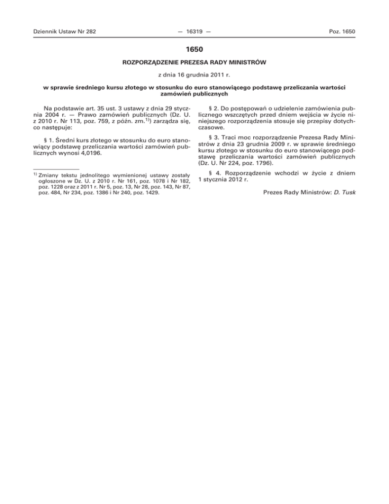 Dziennik Ustaw Nr 282 — 16319 — Poz. 1650 1650 ROZPORZĄDZENIE PREZESA RADY MINISTRÓW z dnia 16 grudnia 2011 r. w sprawie średniego kursu złotego w stosunku do euro stanowiącego podstawę przeliczania wartości zamówień publicznych Na podstawie art. 35 ust. 3 ustawy z dnia 29 stycznia 2004 r. — Prawo zamówień publicznych (Dz. U. z 2010 r. Nr 113, poz. 759, z późn. zm.1)) zarządza się, co następuje: § 2. Do postępowań o udzielenie zamówienia publicznego wszczętych przed dniem wejścia w życie niniejszego rozporządzenia stosuje się przepisy dotychczasowe. § 1. Średni kurs złotego w stosunku do euro stanowiący podstawę przeliczania wartości zamówień publicznych wynosi 4,0196. § 3. Traci moc rozporządzenie Prezesa Rady Ministrów z dnia 23 grudnia 2009 r. w sprawie średniego kursu złotego w stosunku do euro stanowiącego podstawę przeliczania wartości zamówień publicznych (Dz. U. Nr 224, poz. 1796). 1) Zmiany tekstu jednolitego wymienionej ustawy zostały ogłoszone w Dz. U. z 2010 r. Nr 161, poz. 1078 i Nr 182, poz. 1228 oraz z 2011 r. Nr 5, poz. 13, Nr 28, poz. 143, Nr 87, poz. 484, Nr 234, poz. 1386 i Nr 240, poz. 1429. § 4. Rozporządzenie wchodzi w życie z dniem 1 stycznia 2012 r. Prezes Rady Ministrów: D. Tusk