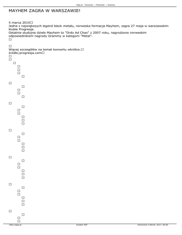 Gigs.pl - Koncerty :: Festiwale :: Imprezy MAYHEM ZAGRA W WARSZAWIE! 5 marca 2010 Jedna z największych legend black metalu, norweska formacja Mayhem, zagra 27 maja w warszawskim klubie Progresja. Ostatnie studyjne dzieło Mayhem to "Ordo Ad Chao" z 2007 roku, nagrodzone norweskim odpowiednikiem nagrody Grammy w kategorii "Metal". Więcej szczegółów na temat koncertu wkrótce. źródło;progresja.com http://gigs.pl Kreator PDF Utworzono 4 March, 2017, 06:06 Gigs.pl - Koncerty :: Festiwale :: Imprezy http://gigs.pl Kreator PDF Utworzono 4 March, 2017, 06:06 Gigs.pl - Koncerty :: Festiwale :: Imprezy http://gigs.pl Kreator PDF Utworzono 4 March, 2017, 06:06